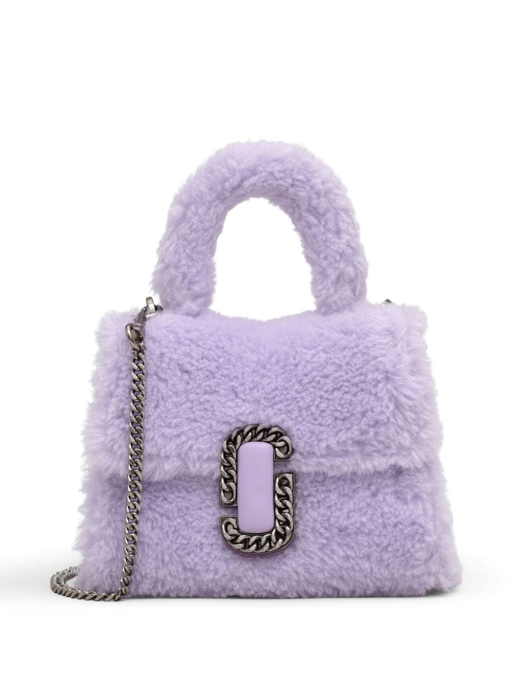 Presented in lilac-purple, this top-handle bag is adorned with the recognisable J Marc push-lock fastening at the front. The fluffy accessory benefits from a detachable chain-link strap that allows it to be worn on the shoulder or handheld.