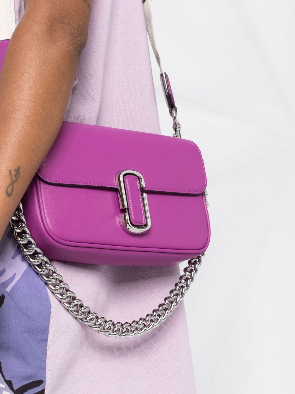Crafted from leather in a violet hue, this Marc Jacobs bag is detailed with a large logo plaque to the front. The modern style is continued with a branded shoulder strap and chunky chain-link top handle.