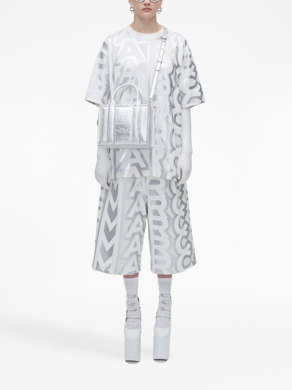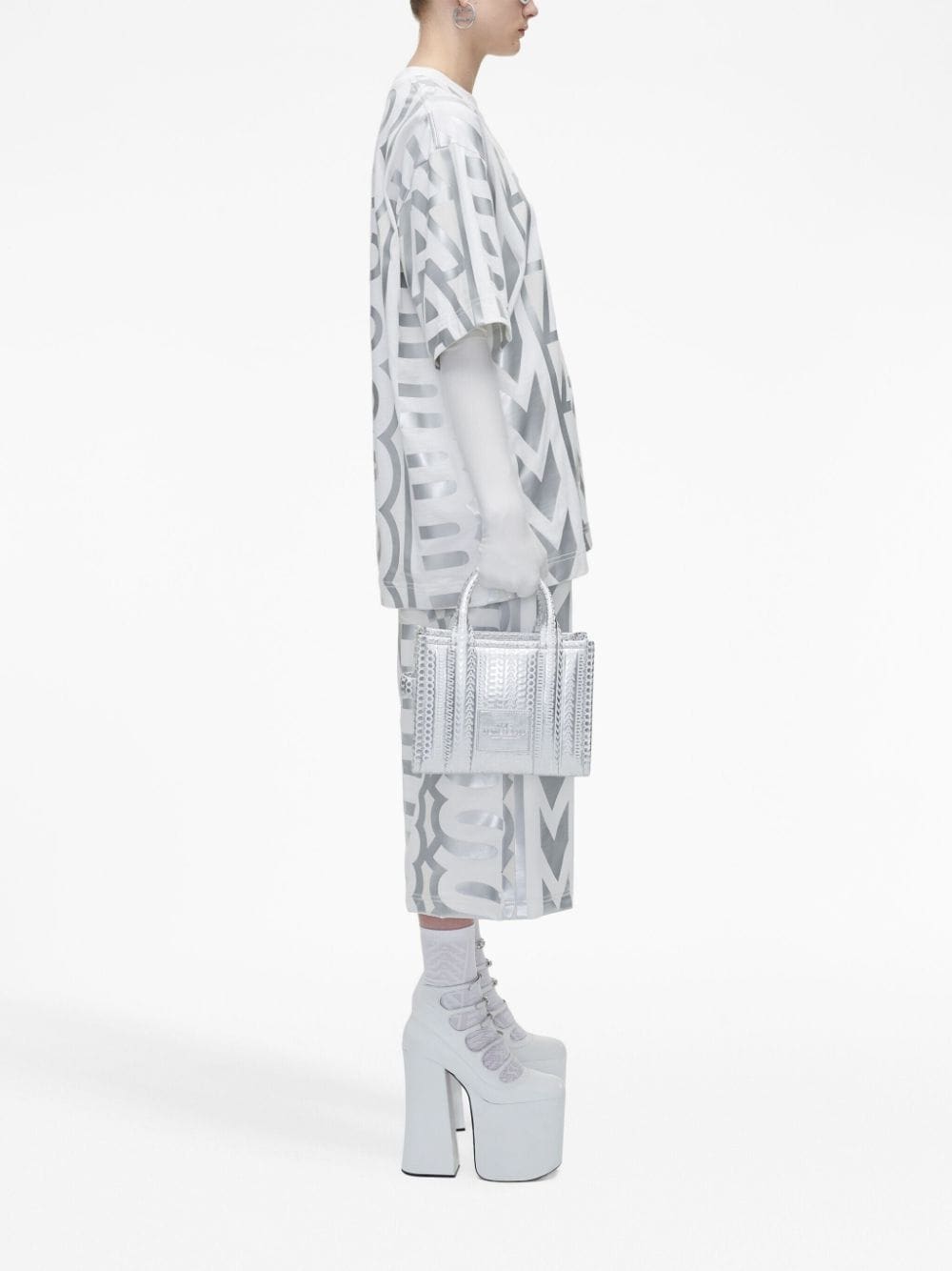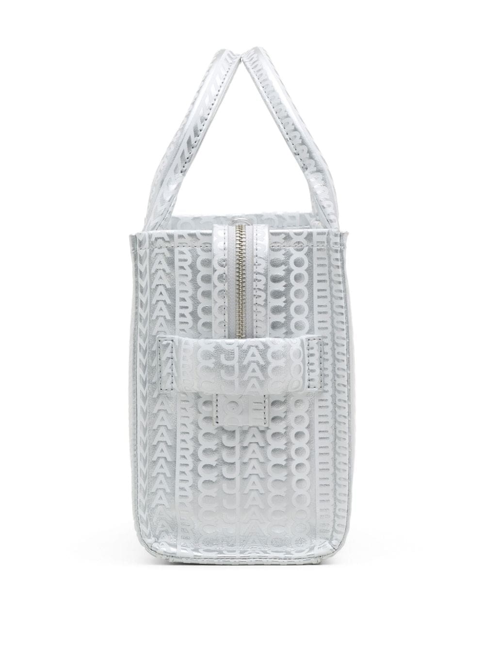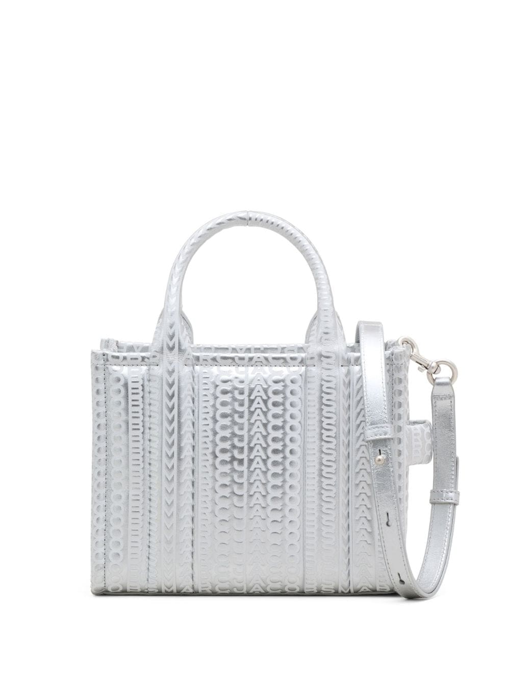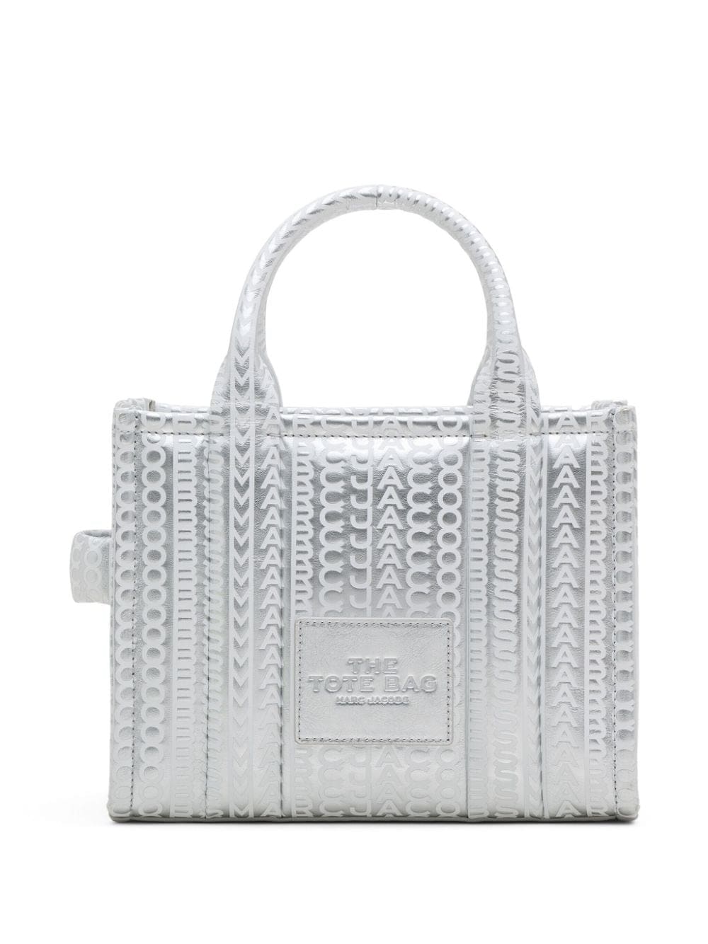 The Tote bag from Marc Jacobs debuted in 2019 and has since been reimagined in an array of hues and sizes. Retaining the boxy silhouette and distinctive logo appliqué, this small iteration is crafted from metallic silver leather and enhanced with an embossed monogram pattern.