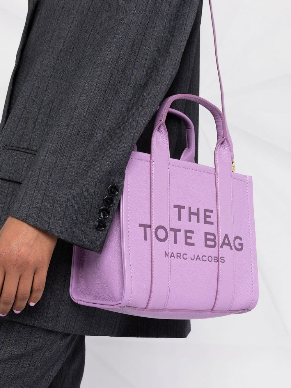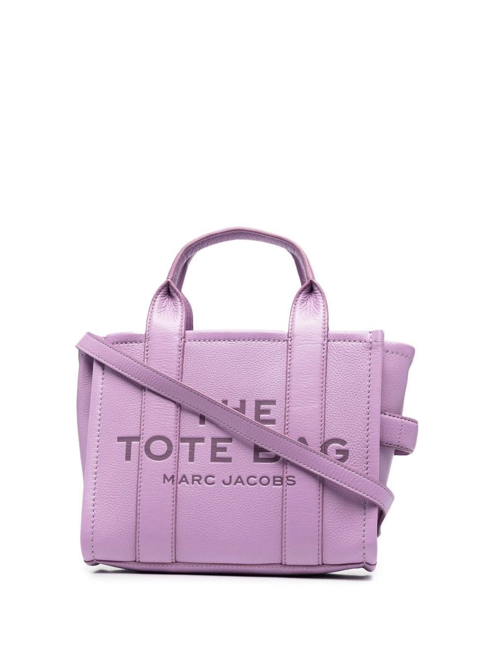 Marc Jacobs incorporates literal wording into his latest accessories release. This bag is presented in purple grained leather, printed with the words 'The Tote Bag' alongside logo lettering on the front.