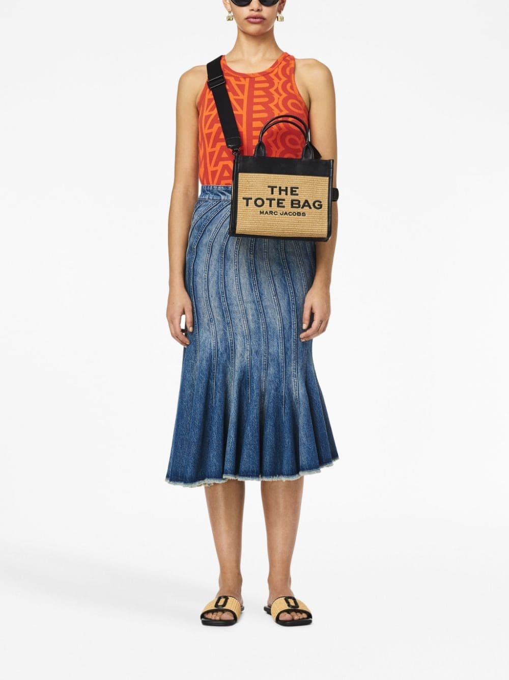 With a woven raffia construction, this bag by Marc Jacobs boasts the emblematic metalinguistic embroidery: it really is a tote bag. Punctuated with contrasting elements that frame the silhouette, this piece is complete with a top zip fastening and main compartment.