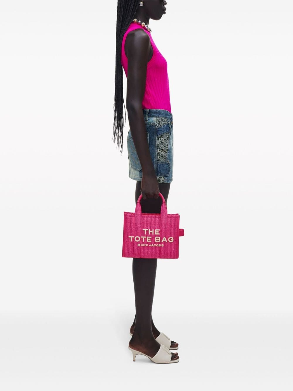 This iteration of Marc Jacobs' The Small Tote bag boasts an interwoven design in pink with embroidered logo lettering in contrasting light beige threads.