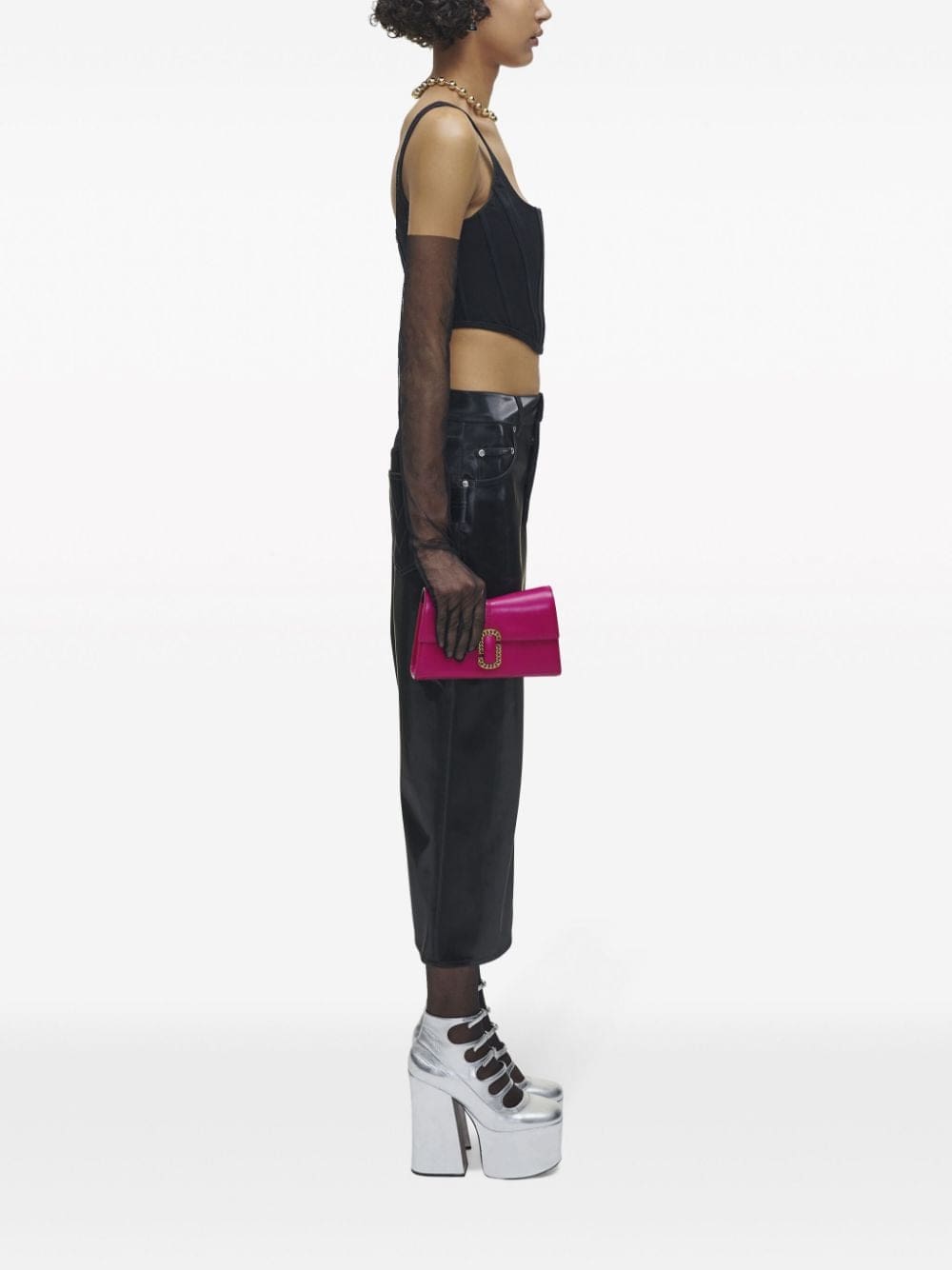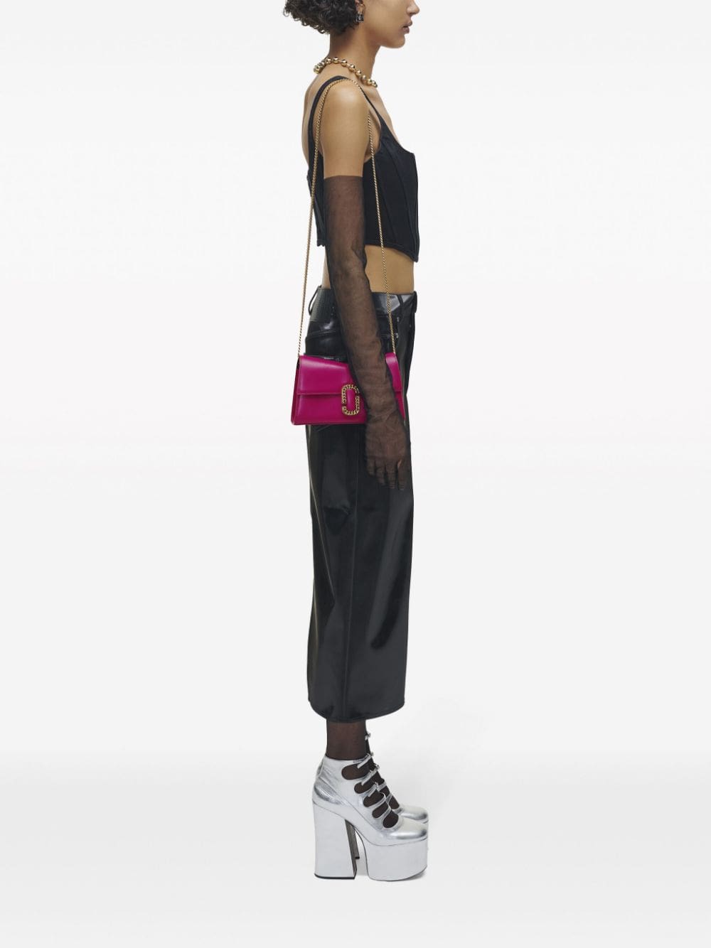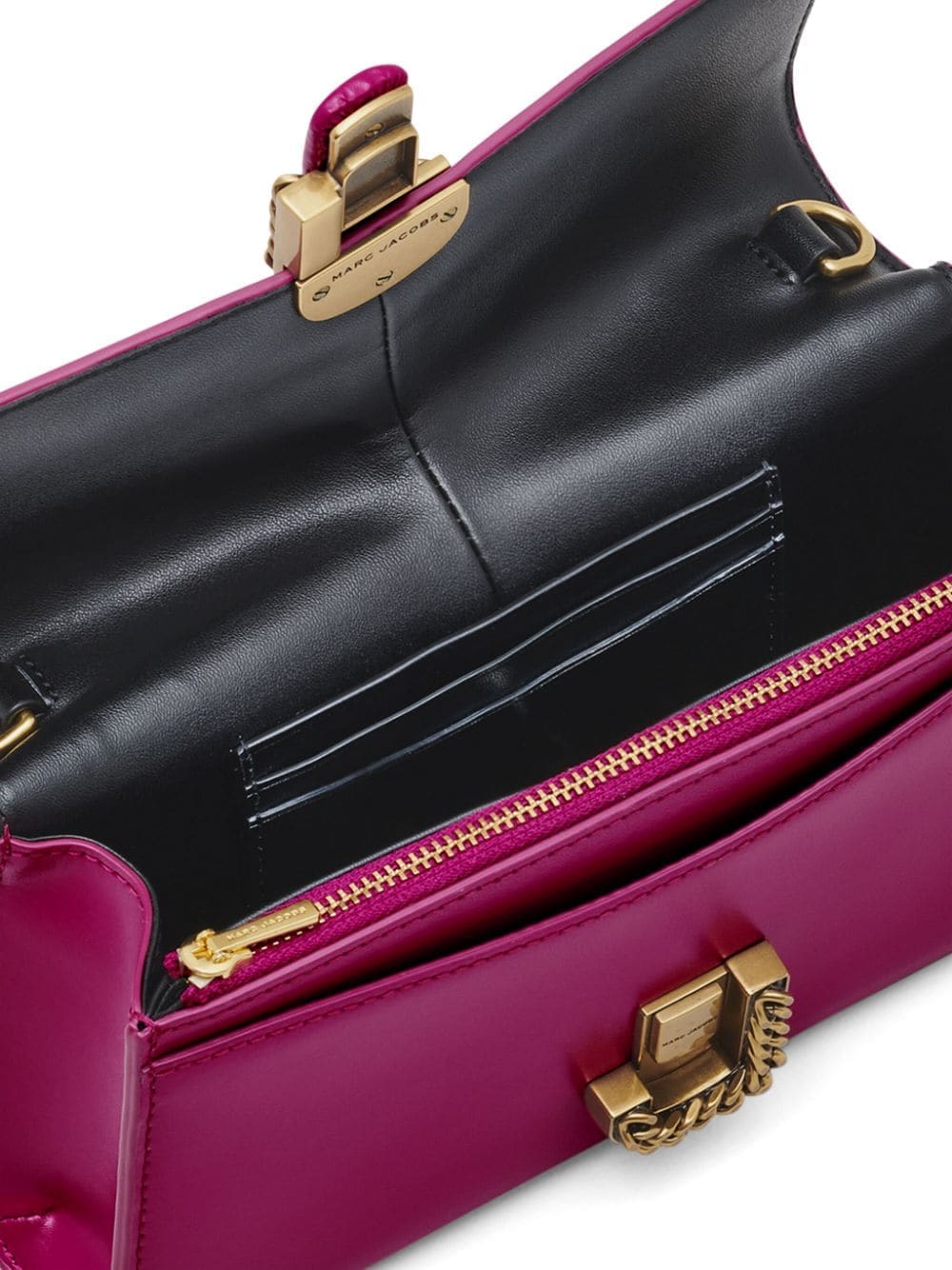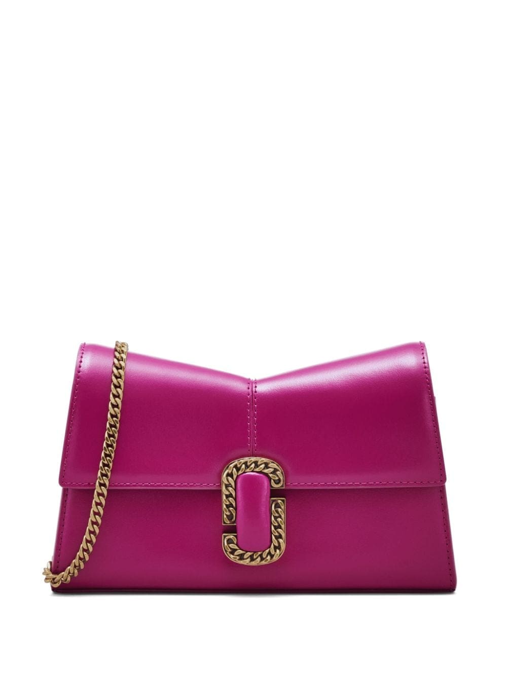 Marc Jacobs refreshes the St. Marc Chain bag in magenta leather. The boxy shape is punctuated with a chain-link double 'J' logo at the front and matching chain-link shoulder strap.