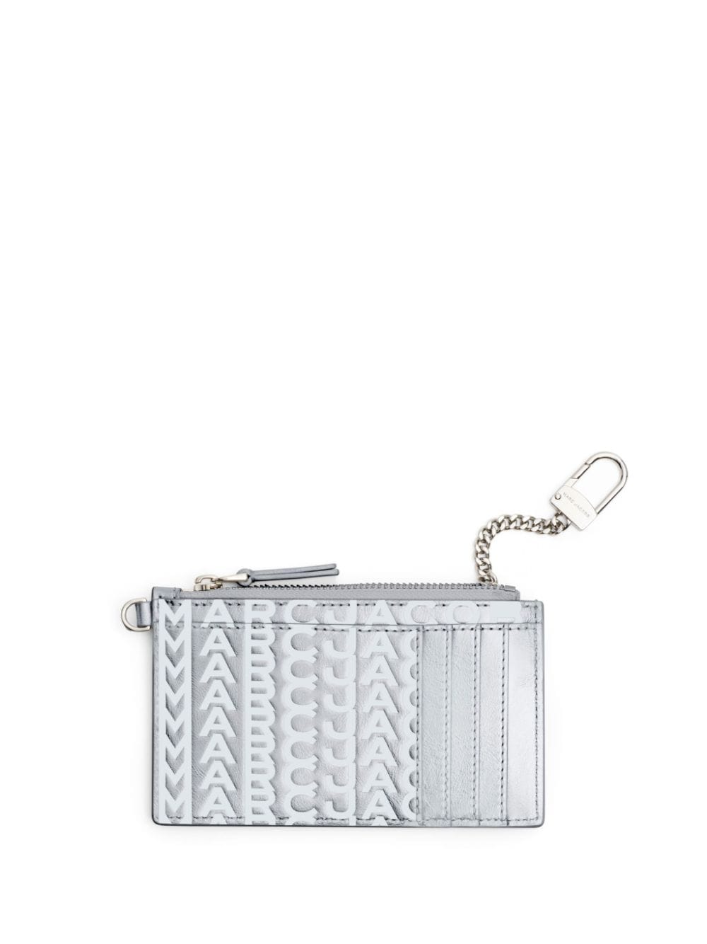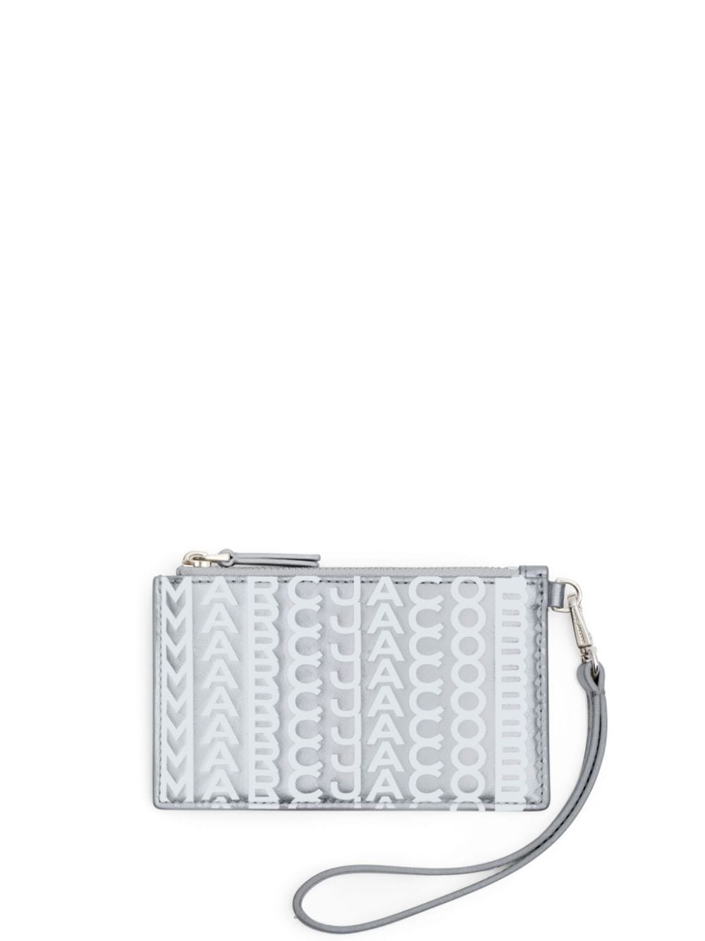 The Top Zip wallet is inspired by Marc Jacobs' coveted tote. This silver-tone leather iteration is emblazoned with signature logo embossing and suspended by a practical wristlet strap. Multiple card slots and a zipped compartment cement its practicality.