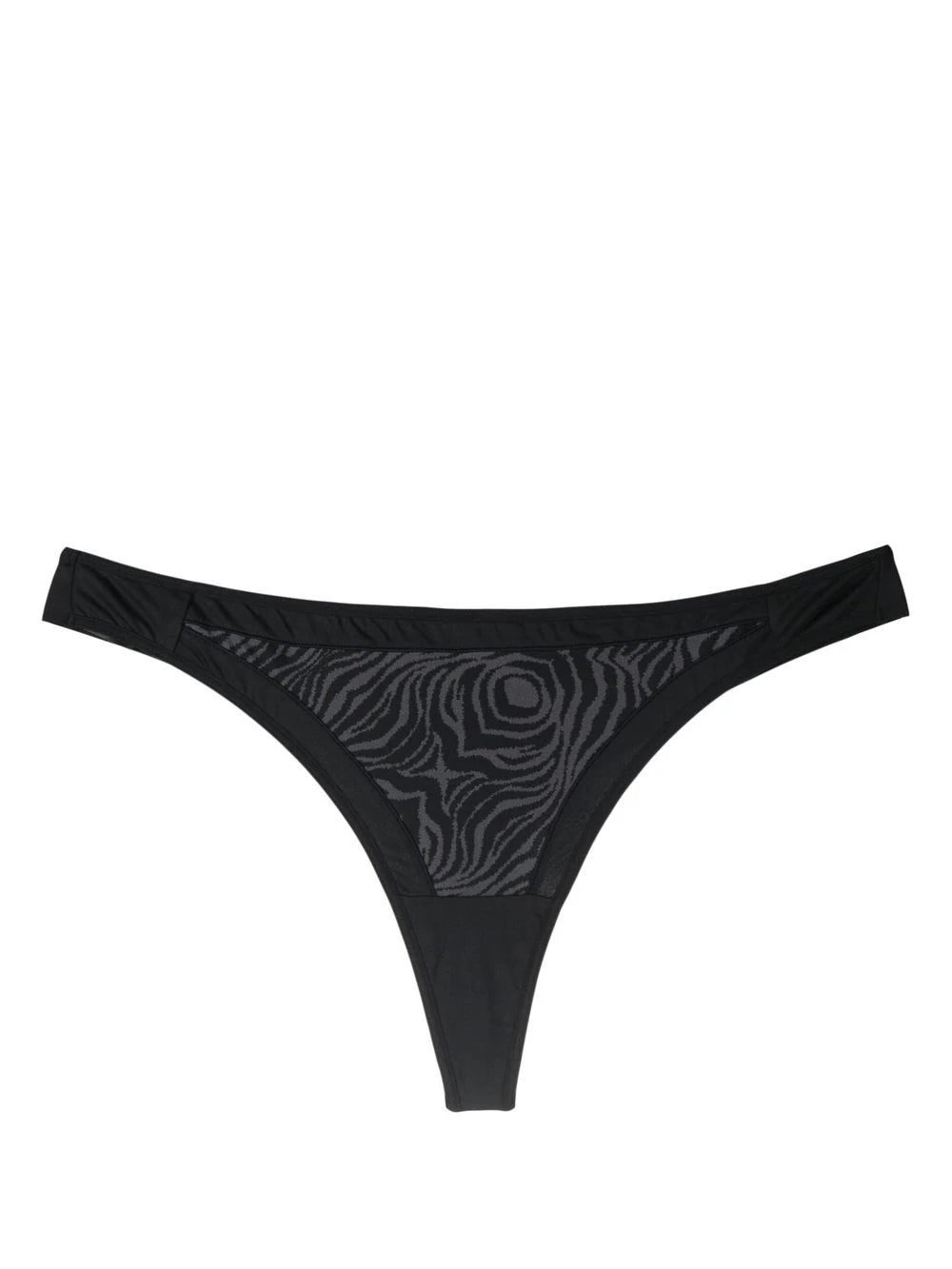 black/grey recycled nylon blend zebra print thong style high cut Just a reminder that this piece must be tried on over your own garments. Conscious: This item is made from at least 50% recycled or upcycled materials. For recycled synthetic clothing products we highly recommend using a microfibre-catching washing bag to ensure that no microplastics that can pollute water are released in the process.