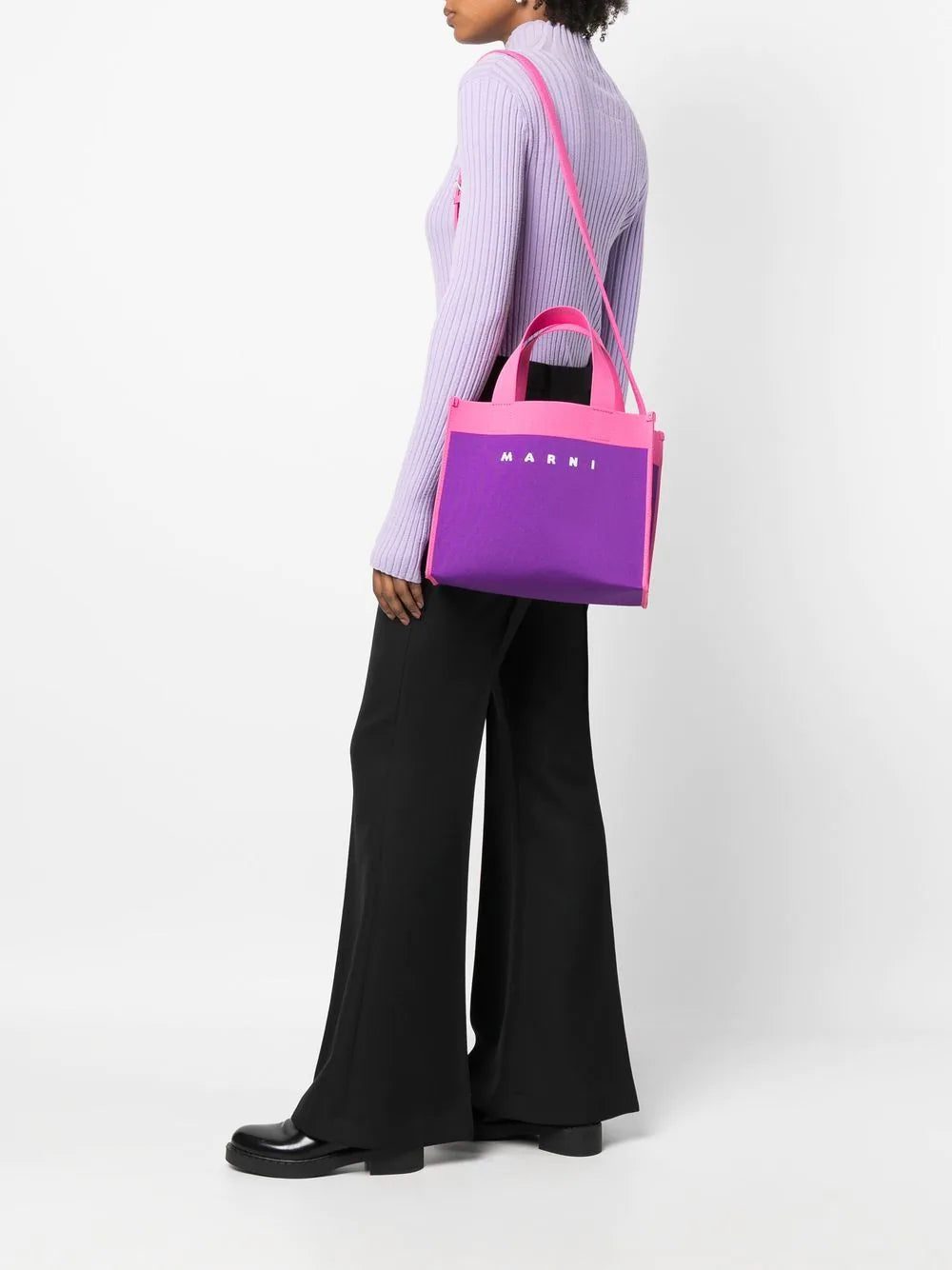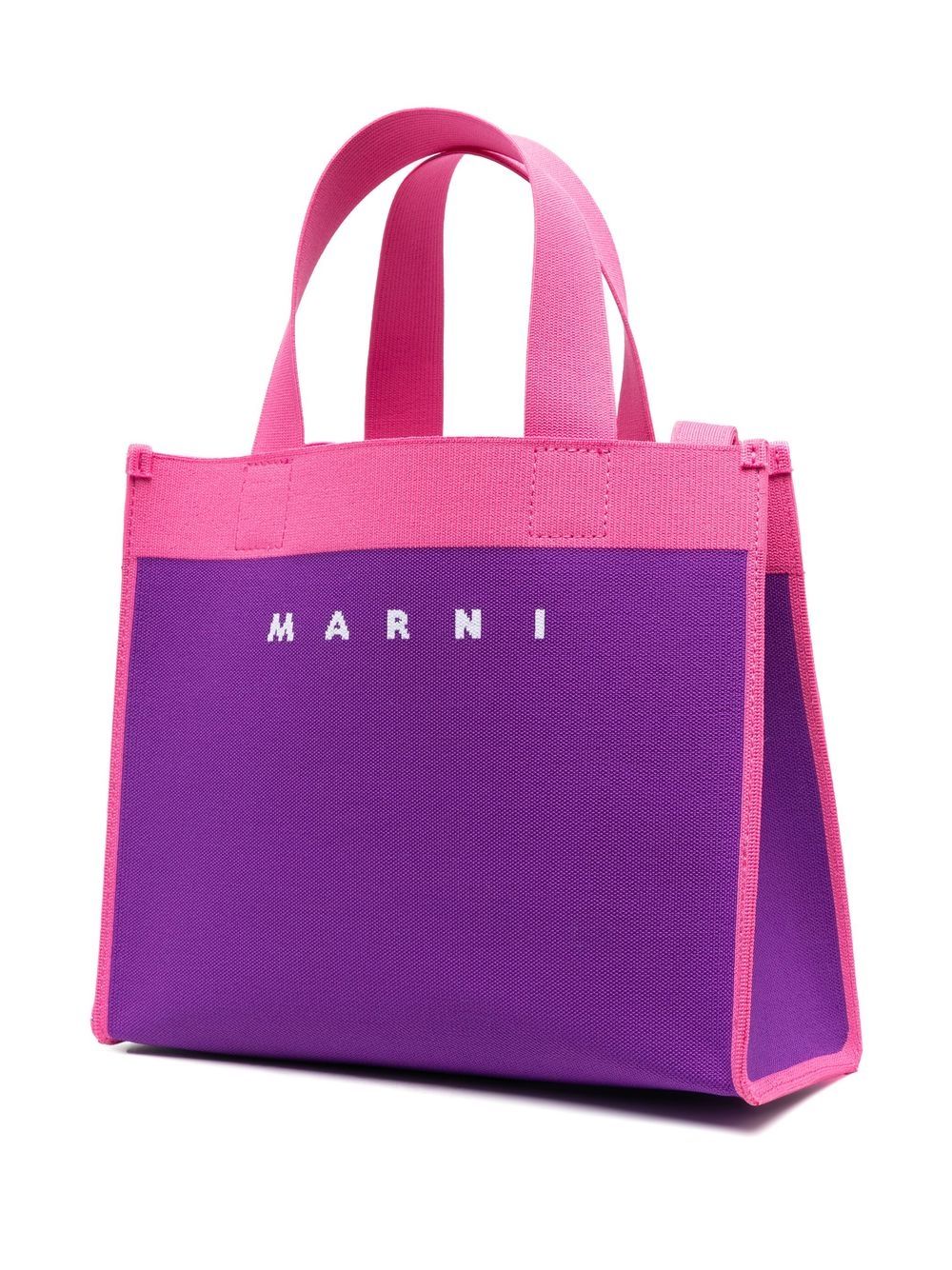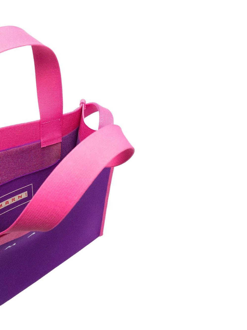Purple / pink cotton-blend colour-block canvas tote bag from MARNI featuring logo print to the front, two long top handles, single shoulder strap and internal logo patch.