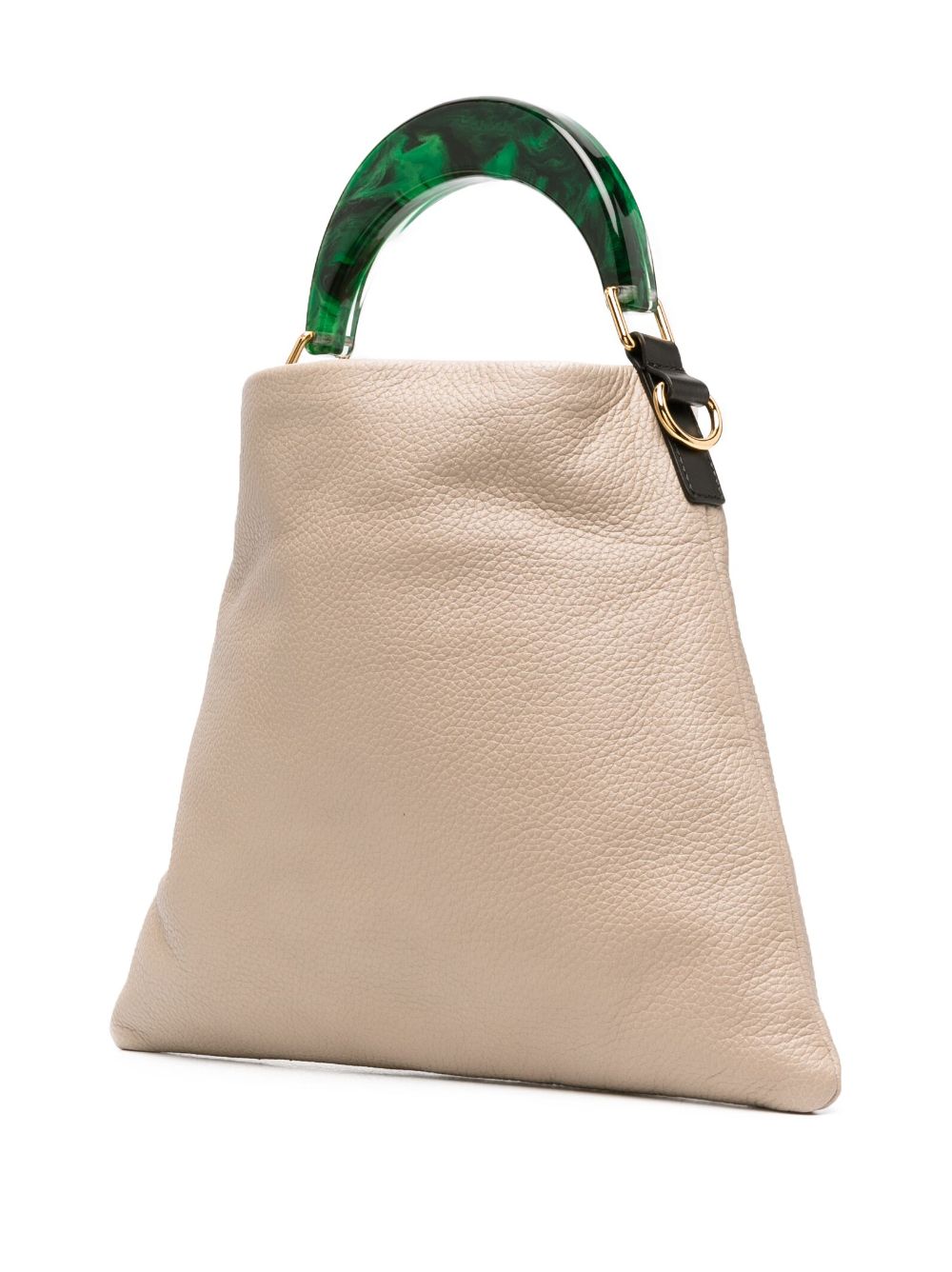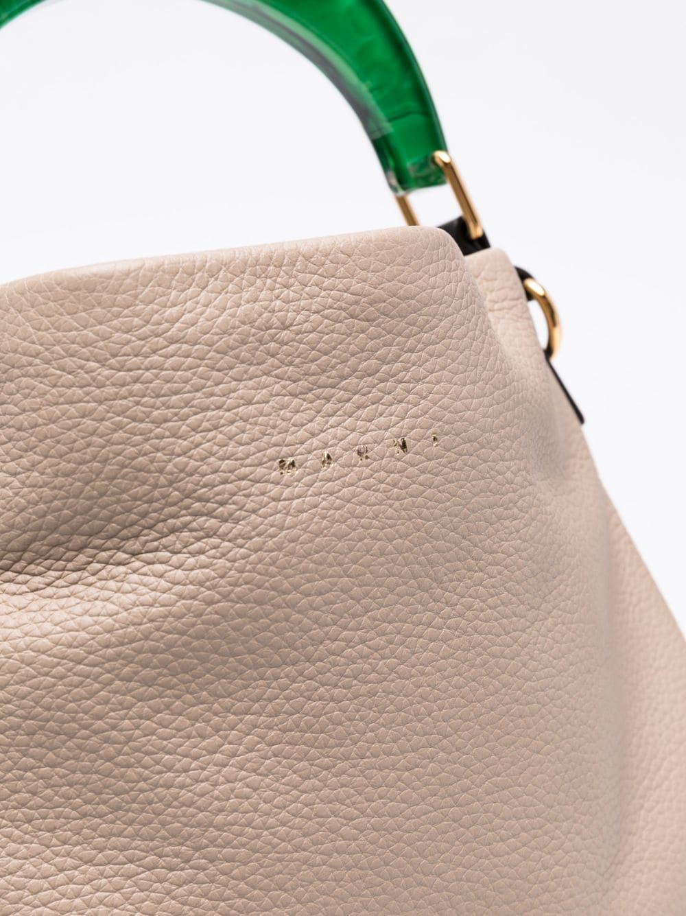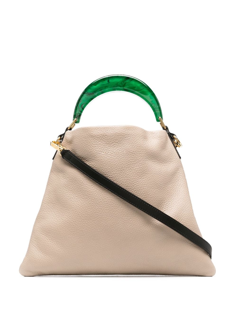 Beige/green leather Pannier leather tote bag from MARNI featuring grained texture, debossed logo, magnetic fastening, main compartment, internal slip pocket, adjustable detachable shoulder strap and curved top handle.