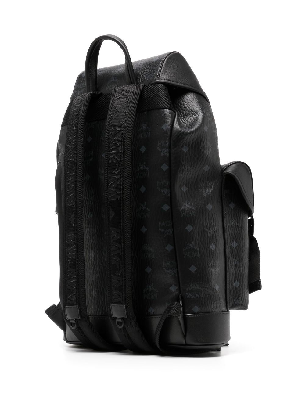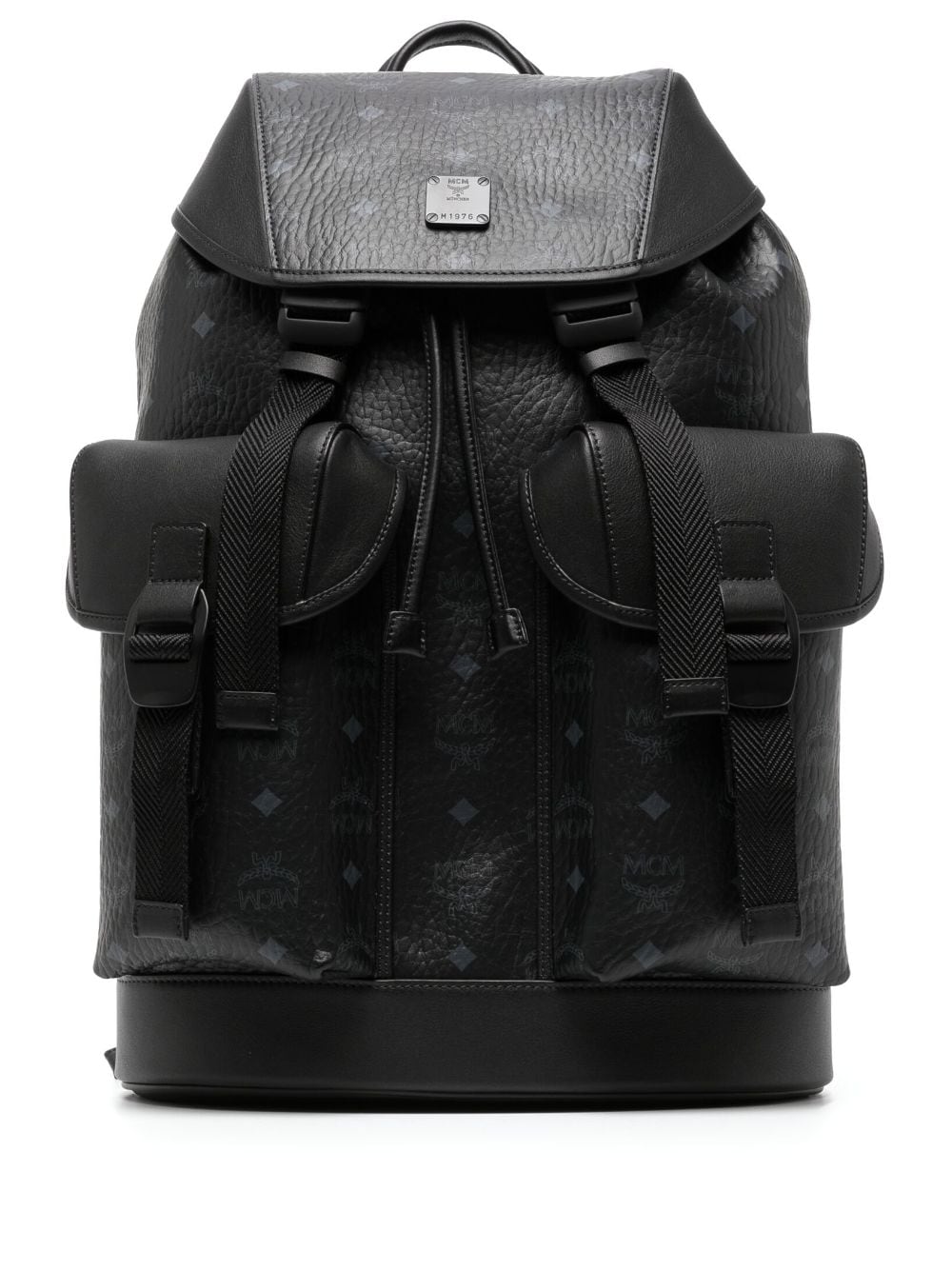 black leather/canvas signature Visetos print adjustable shoulder straps single rounded top handle logo plaque two front flap pockets front flap closure drawstring fastening