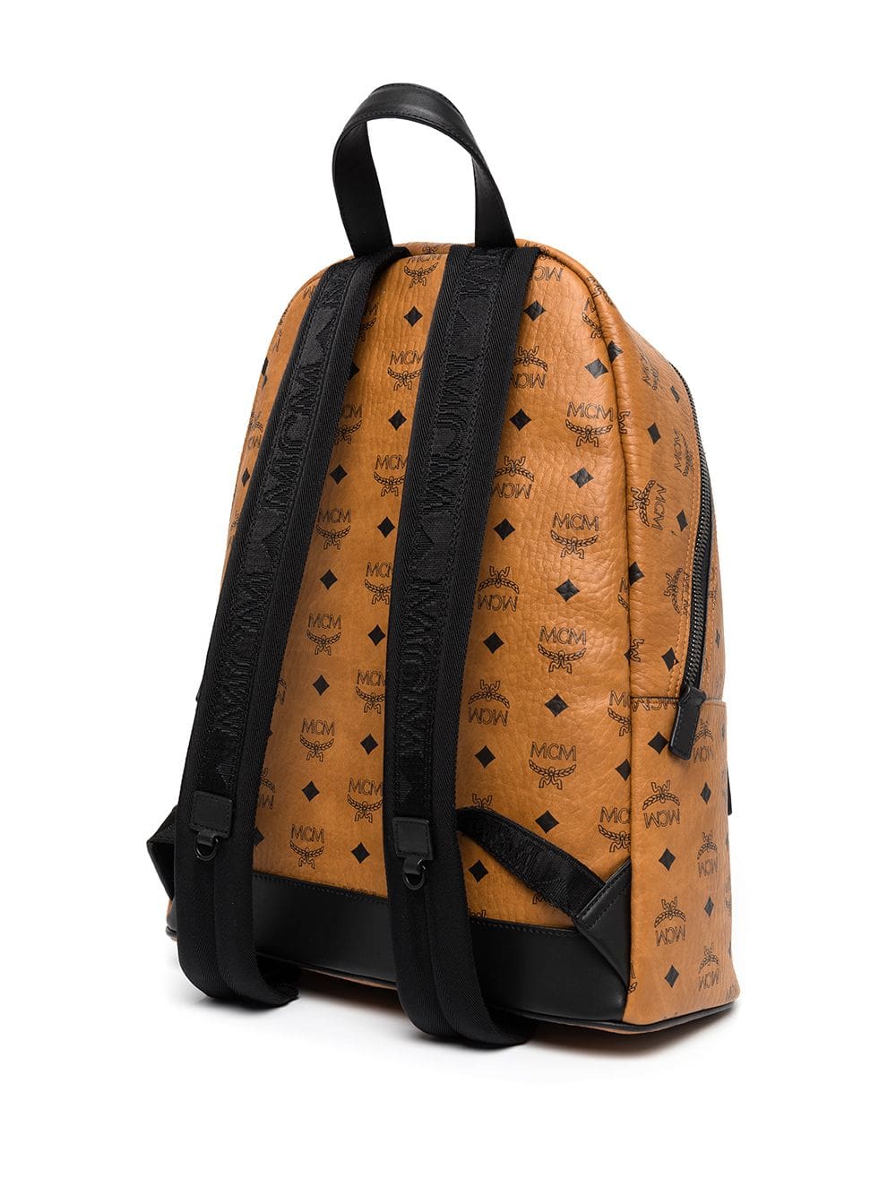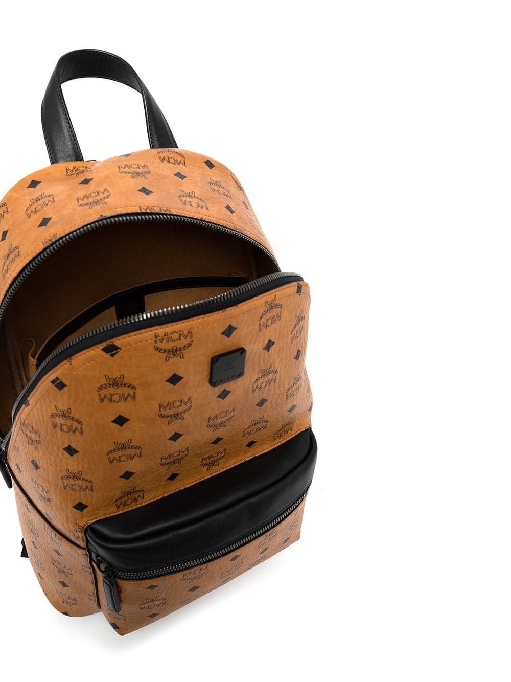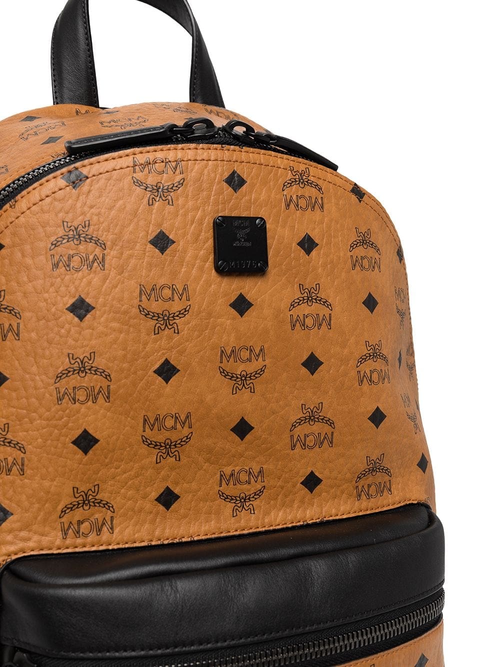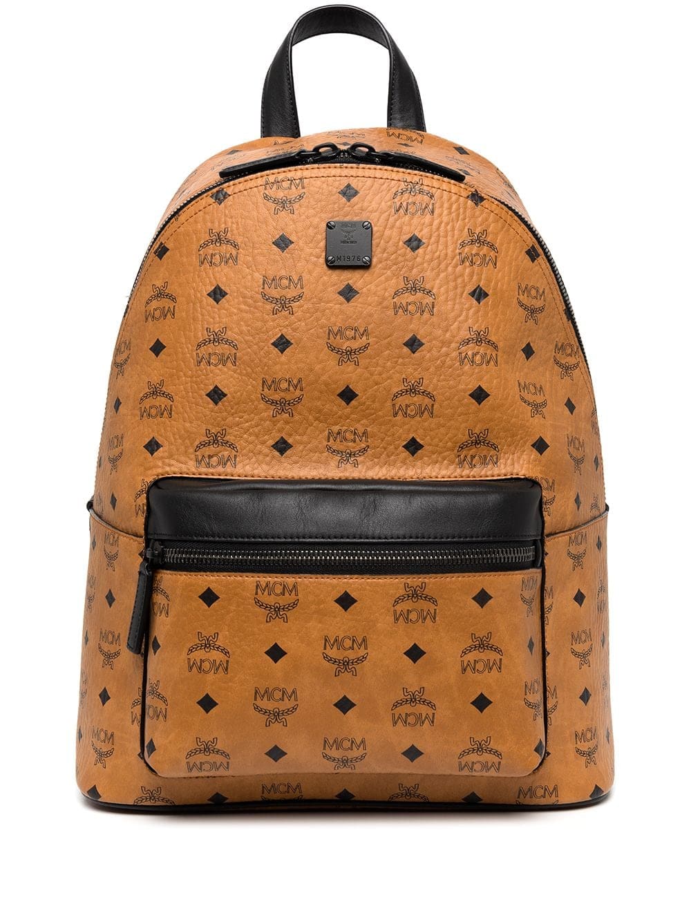 cognac brown/black leather/canvas signature Visetos print adjustable shoulder straps single rounded top handle logo patch to the front front zip-fastening pouch pocket all-around zip fastening internal laptop pocket