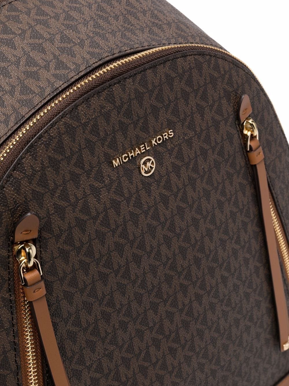 dark brown leather monogram pattern gold-tone logo plaque single flat top handle all-around zip fastening front zip fastening pockets adjustable shoulder straps