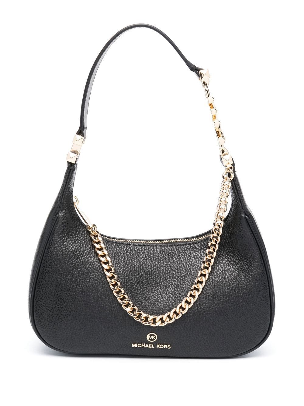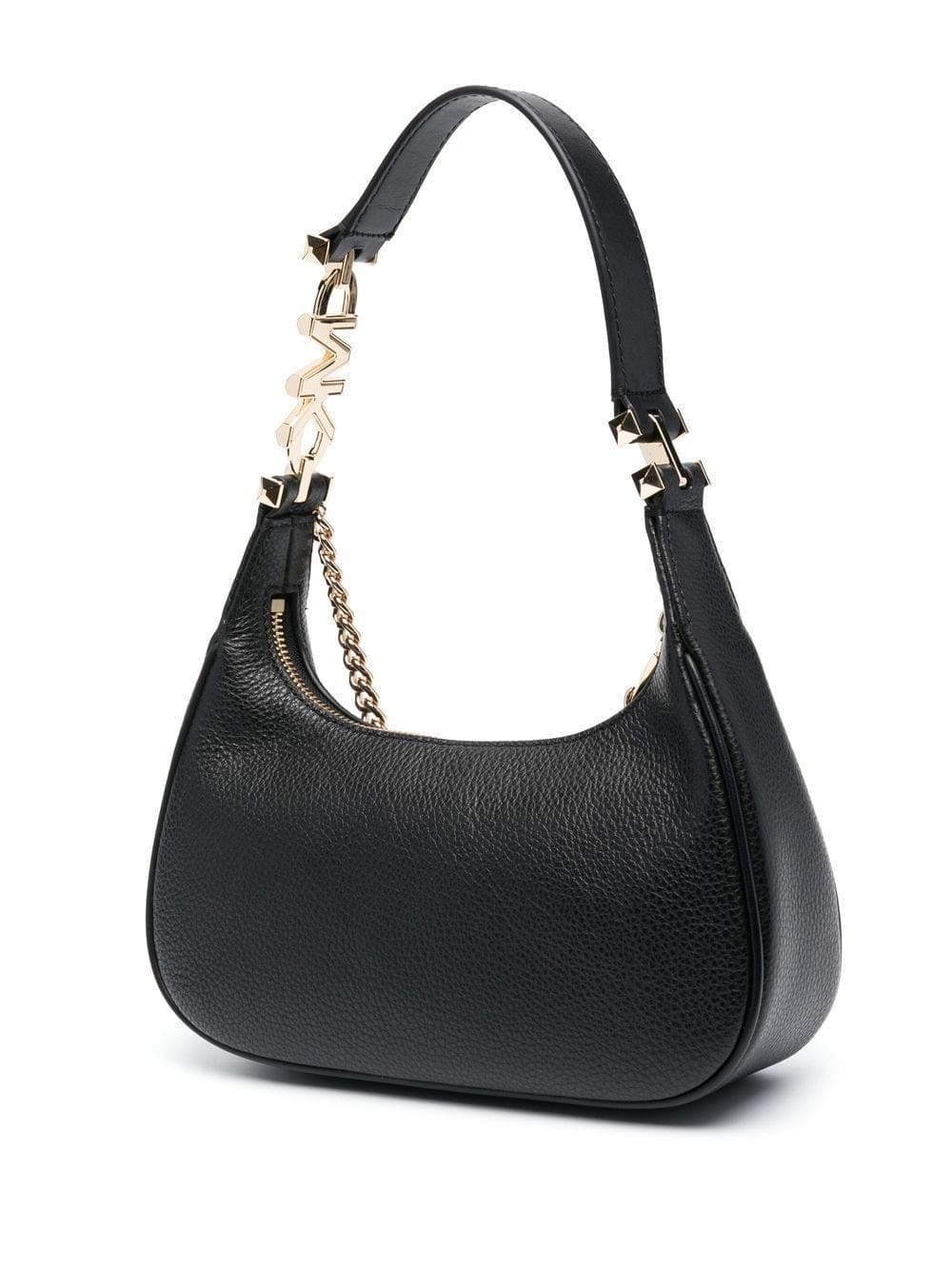 black calf leather grained texture gold-tone logo plaque logo charm chain-link detailing single top handle top zip fastening main compartment logo-print lining internal logo patch internal card slots