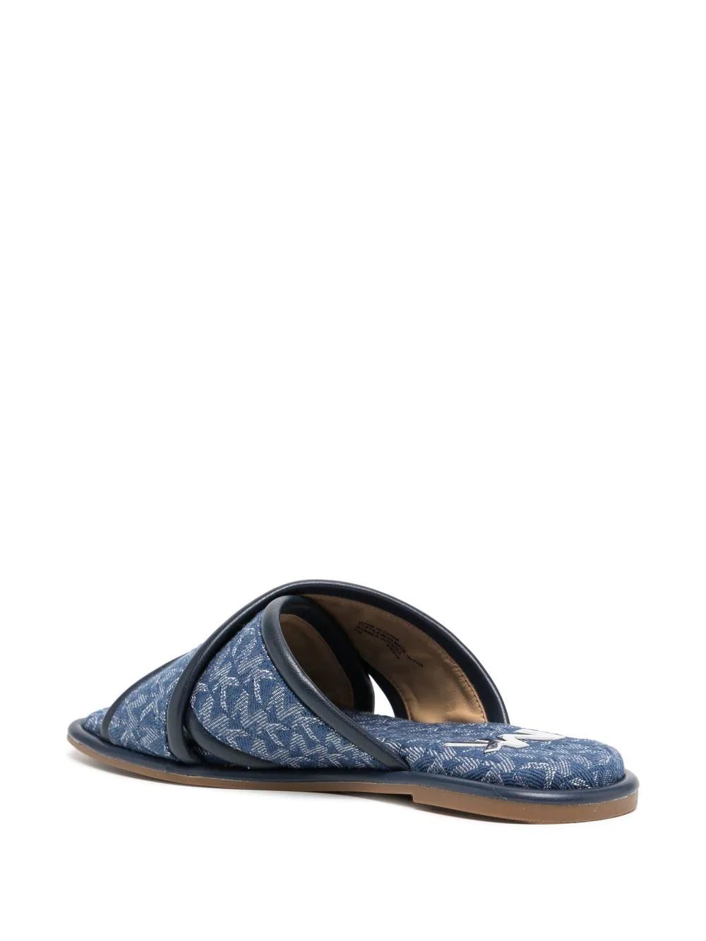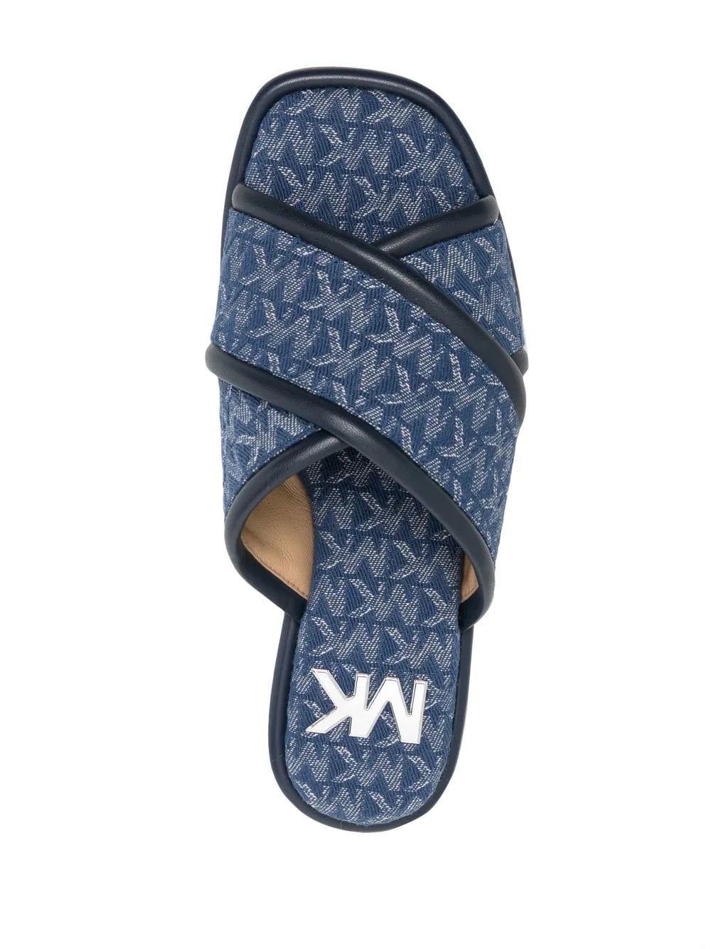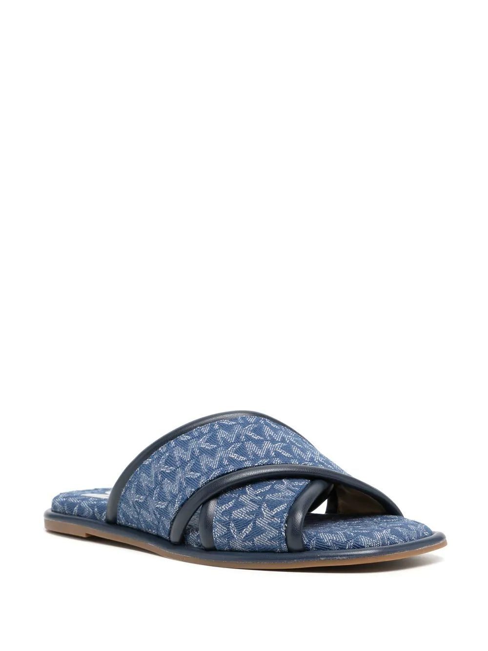 Gideon monogram slide sandals from MICHAEL KORS featuring blue, leather, monogram pattern, crossover strap at the toe, open top and slip-on style.