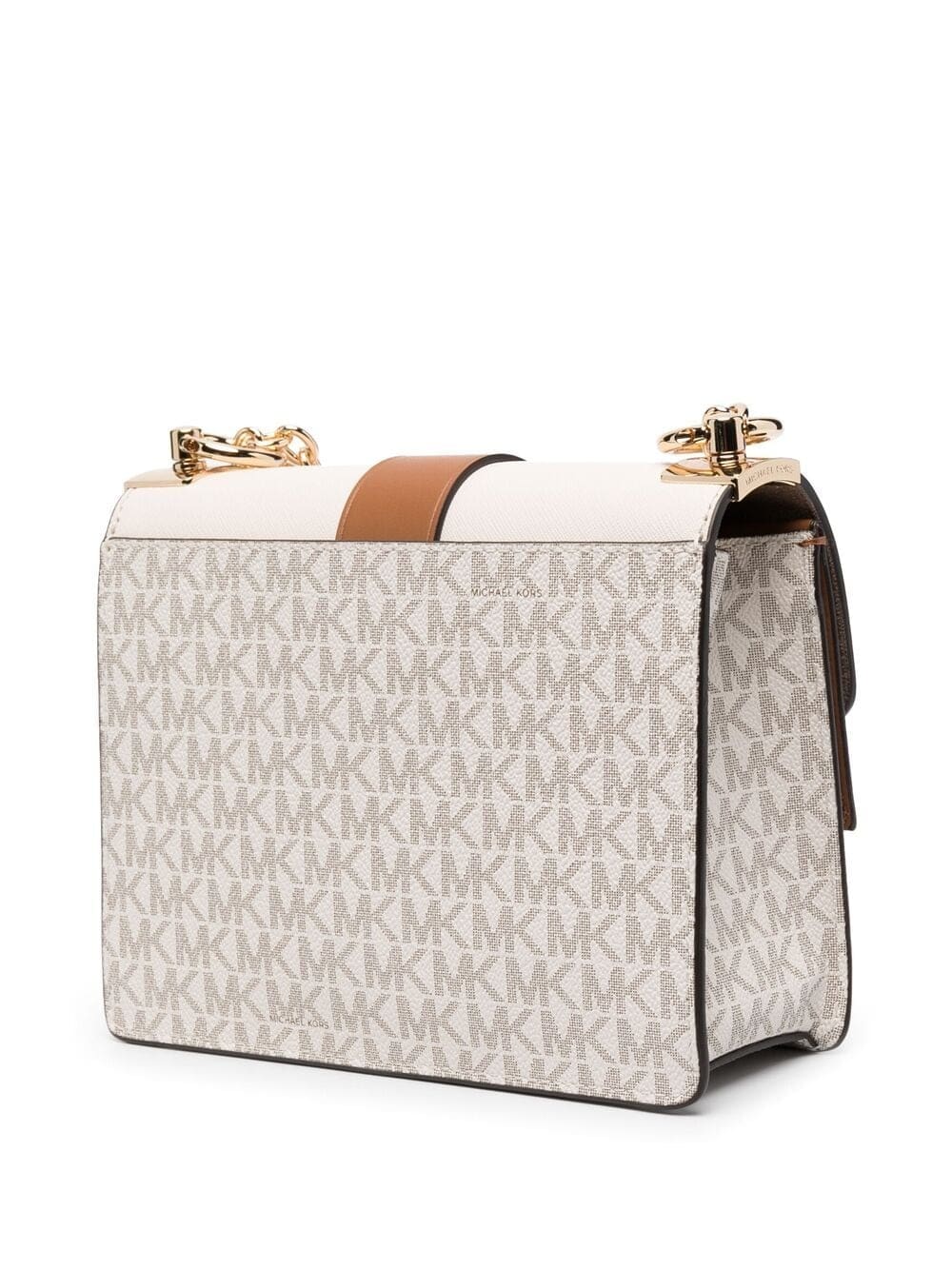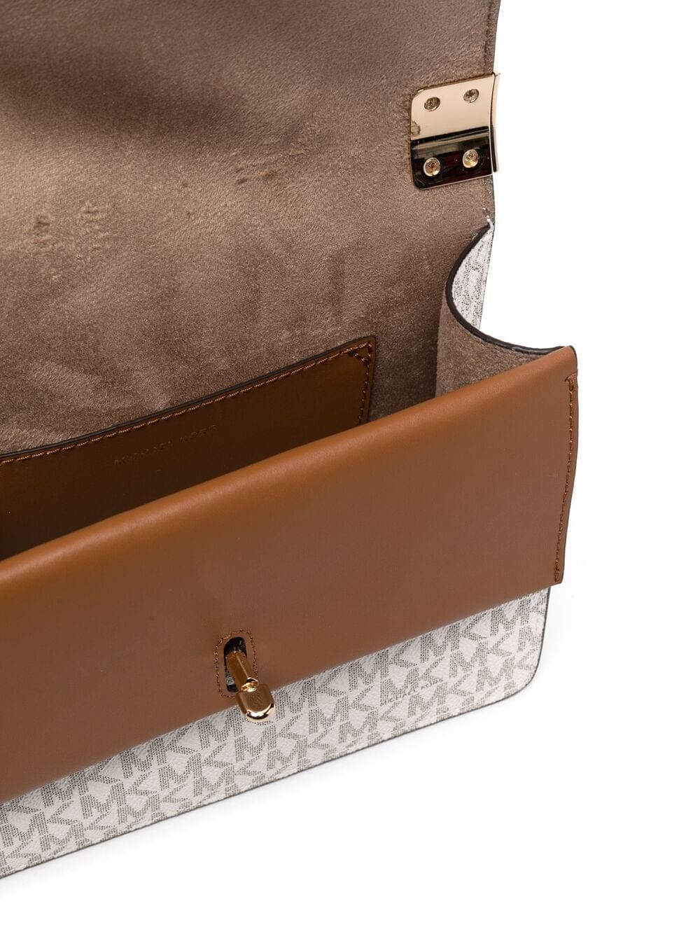 white/brown monogram pattern gold-tone logo plaque foldover top with magnetic fastening chain-link shoulder strap