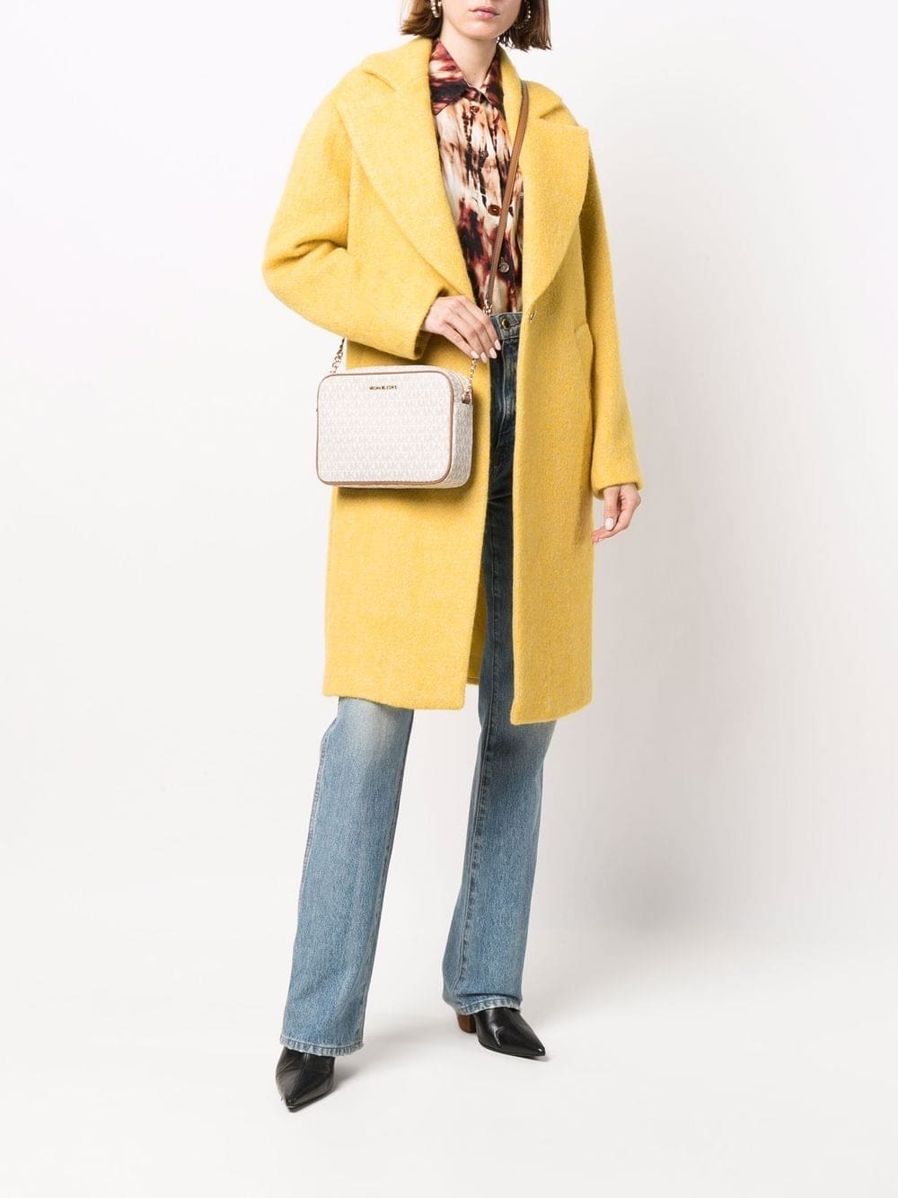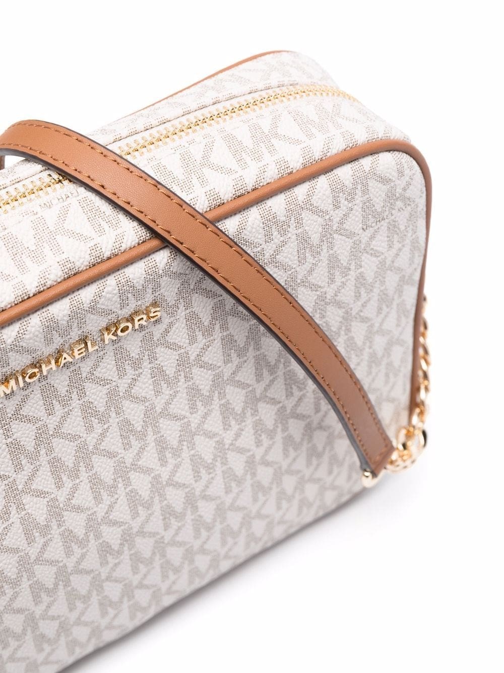 vanilla/beige/brown leather monogram pattern gold-tone logo lettering top zip fastening main compartment internal slip pocket leather and chain-link shoulder strap