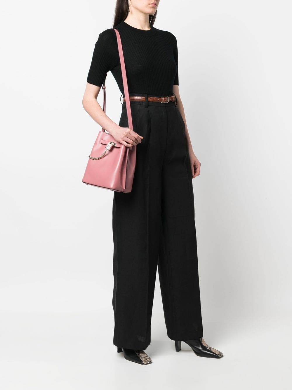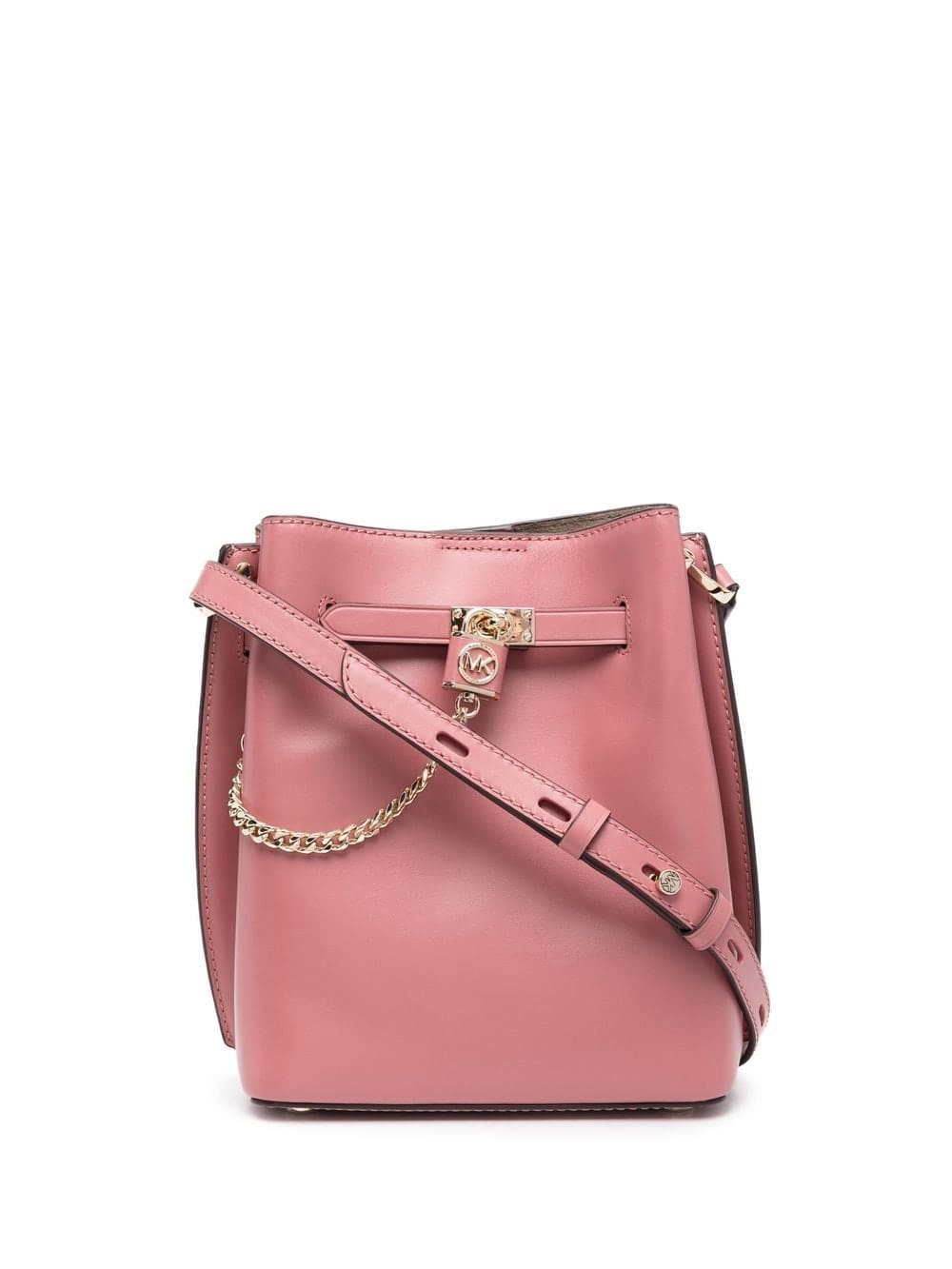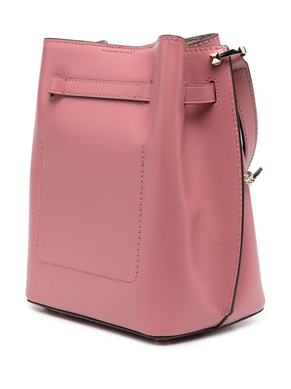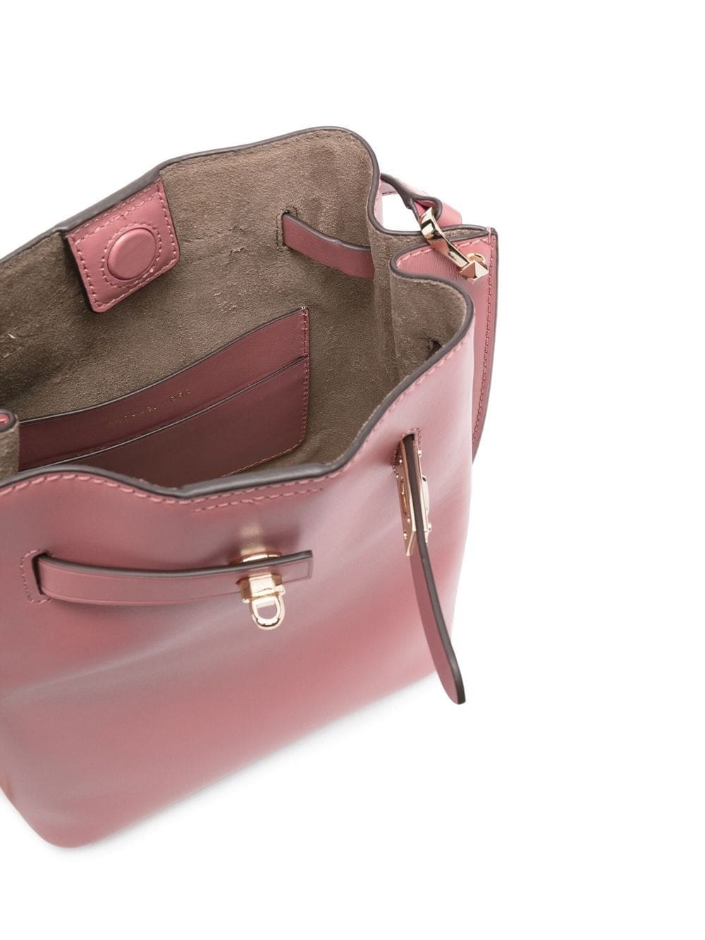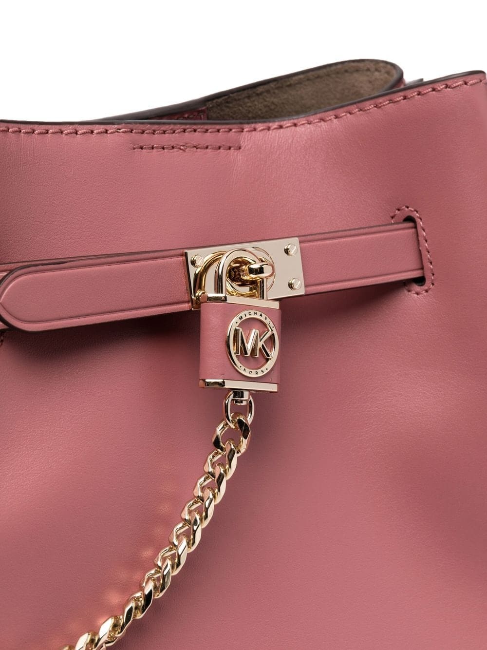 rose pink leather padlock detail main compartment adjustable shoulder strap