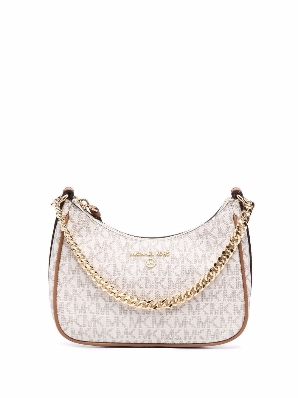 Michael Kors' Jet Set Charm Logo shoulder bag is a contemporary take on a timeless style. Displaying a structured leather silhouette, the design is adorned with all-over monogram detailing and complete with a delicate gilded chain-link strap.