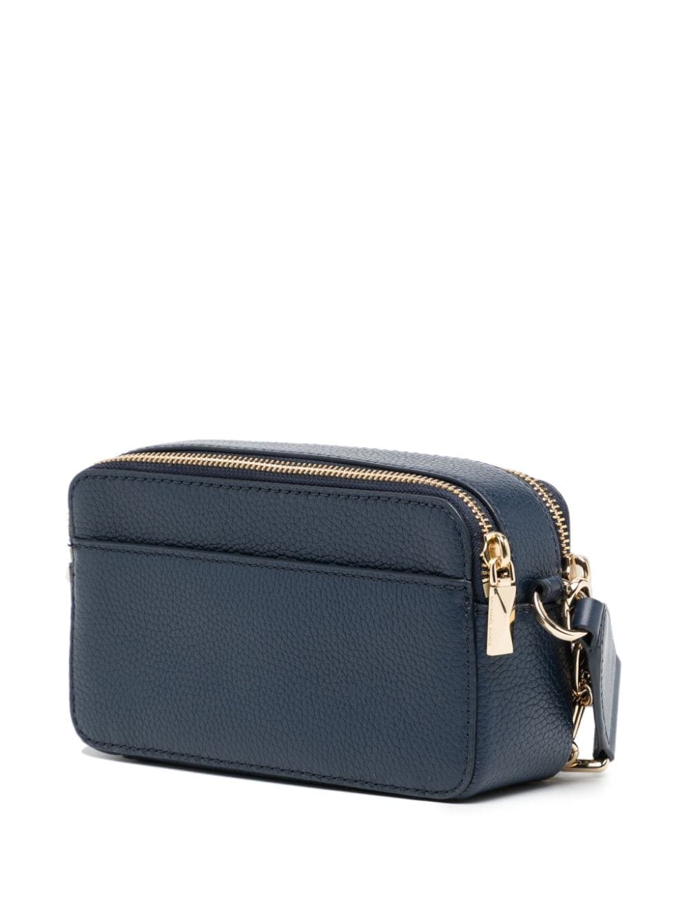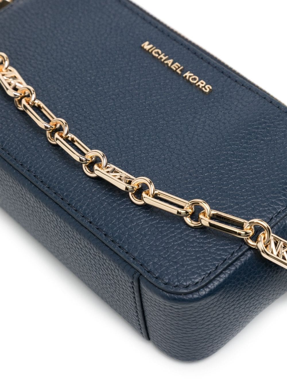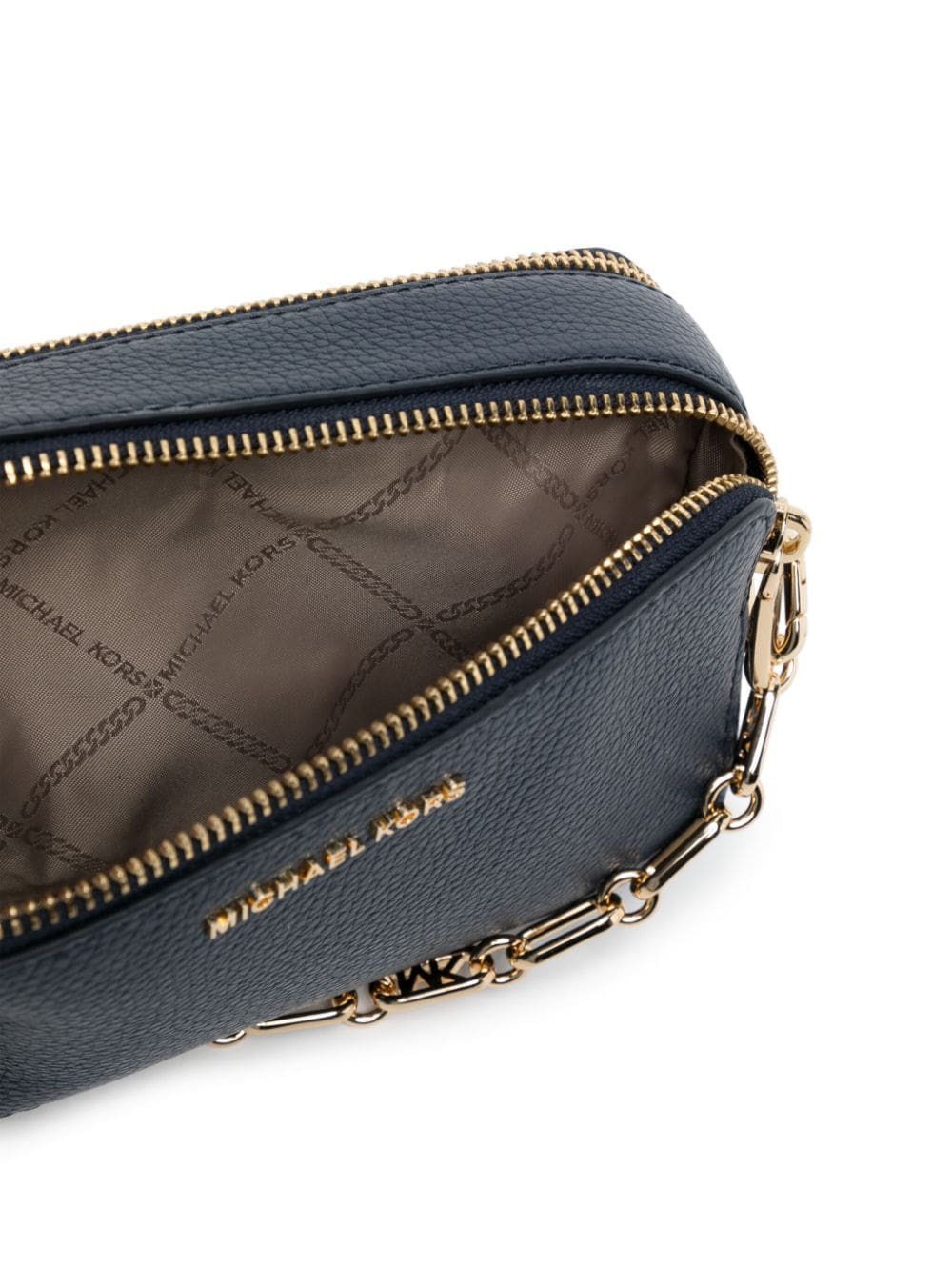 A compact and practical design, Michael Kors' Jet Set bag arrives in a versatile navy blue hue with gold-tone accents. The spacious compartment is lined with a logo print fabric.