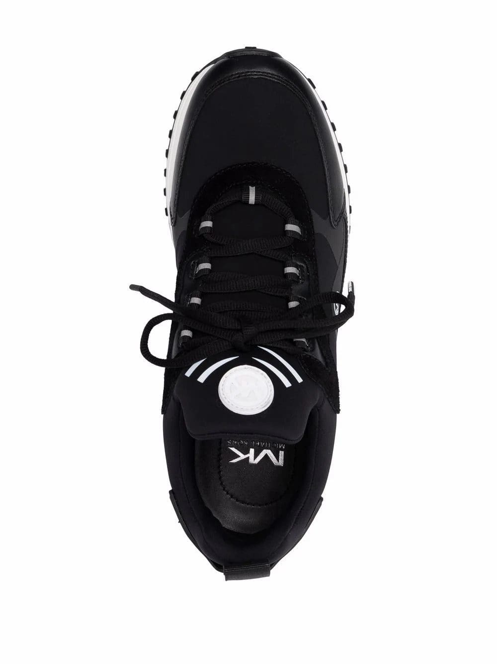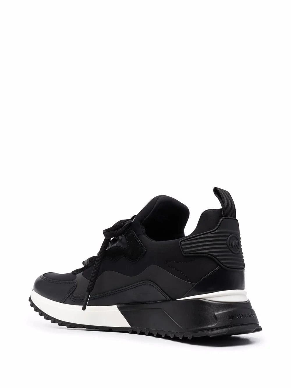 Black Theo low-top panelled sneakers from MICHAEL KORS featuring panelled design, logo print to the side, logo patch at the tongue, embossed logo to the rear, round toe, front lace-up fastening, branded insole, pull-tab at the heel and flat rubber sole.