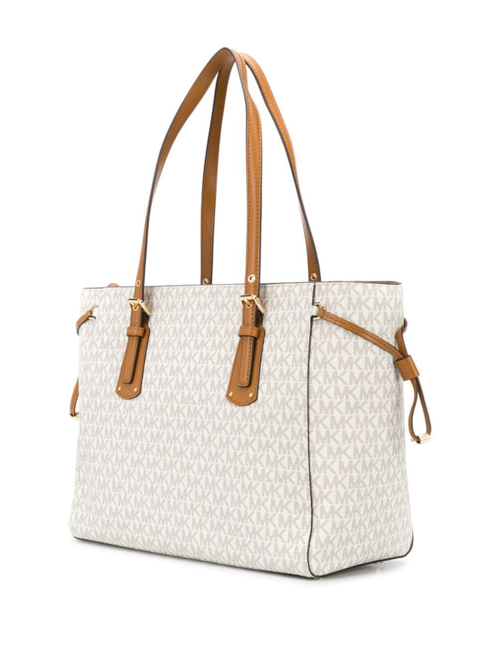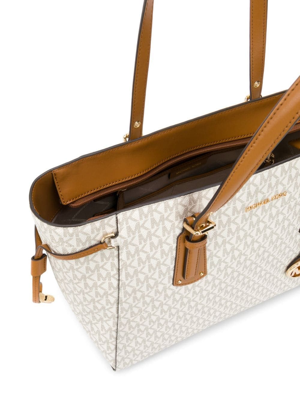 Michael Michael Kors is the playful younger sister to the style icon’s eponymous line. A collection of light, bright and breezy pieces, this season’s lineup plays with volume, structure and delightful details. This white voyager tote bag features top handles, a front logo plaque, an engraved logo charm, stitched panels, a top zip closure, a main internal compartment and an internal slip pocket.