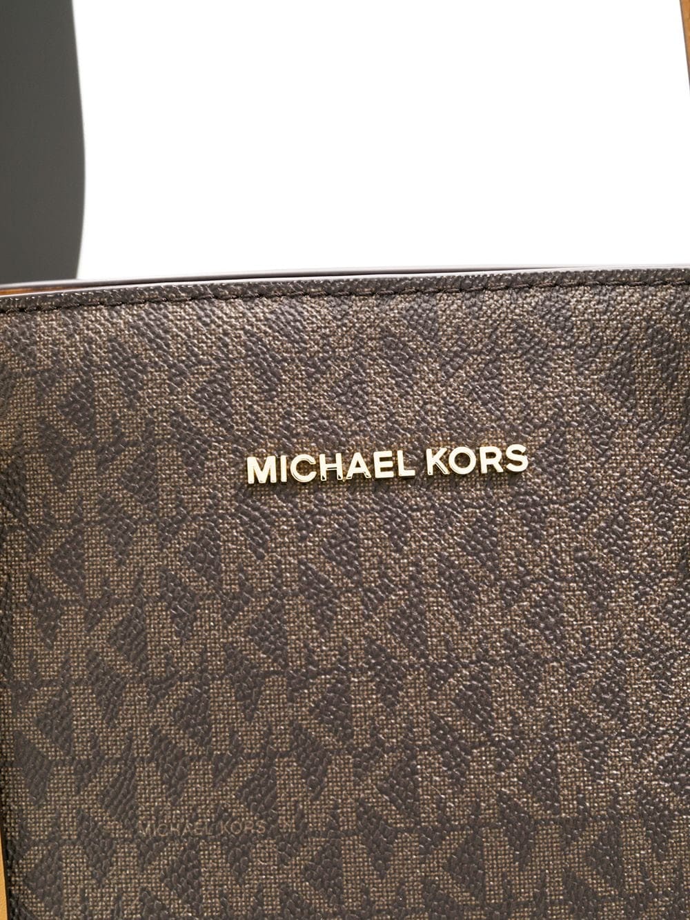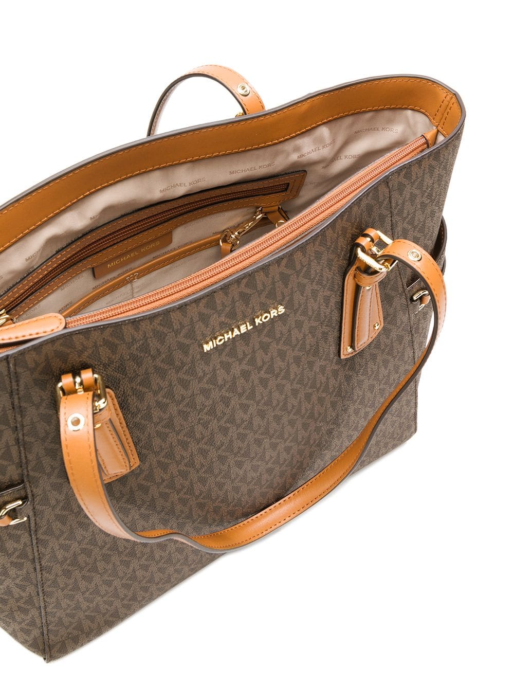 Timelessly elegant and surprisingly affordable, Michael Michael Kors collections capture the effortless, nonchalant finesse of the girl on the go. This brown leather Voyager tote bag features top handles, a front logo plaque, a monogram pattern, an internal zipped pocket, a logo printed lining, an internal slip pocket and an embossed internal logo stamp.