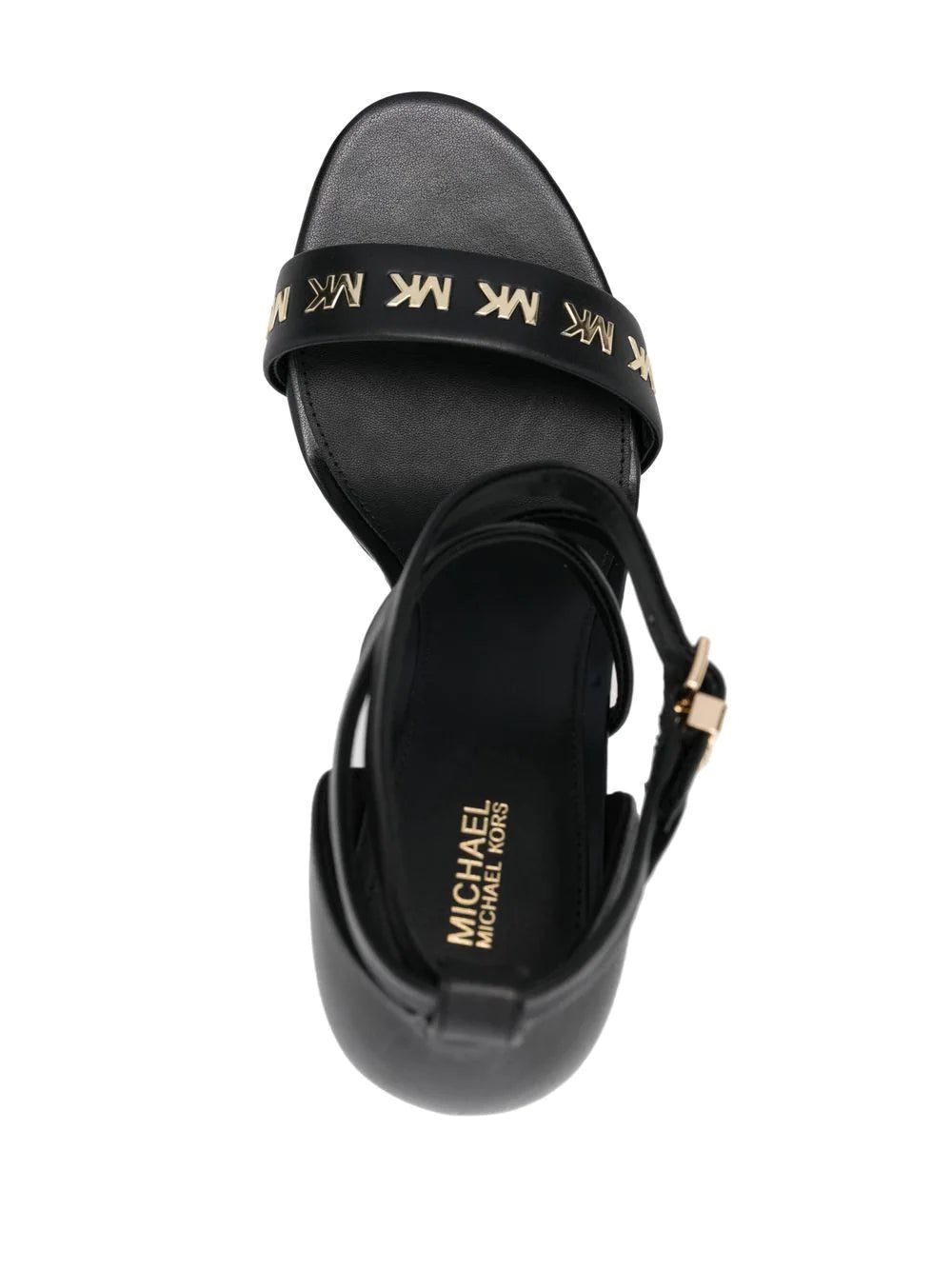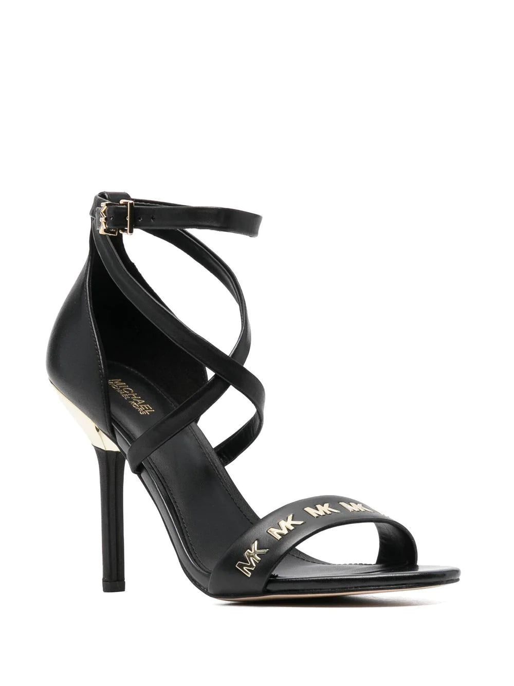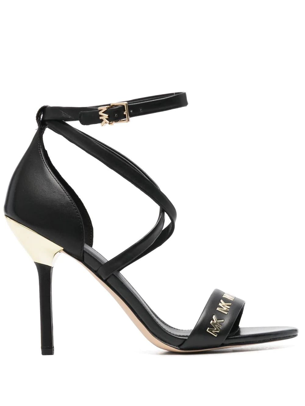 Astrid 120mm stiletto sandals from MICHAEL MICHAEL KORS featuring black, calf leather, gold-tone logo lettering, gold-tone hardware, crossover strap detail, open toe, branded insole, buckle-fastening ankle strap, flat leather sole and 120mm high stiletto heel.
