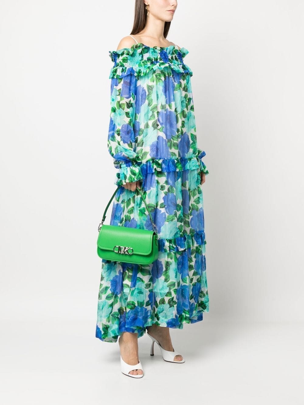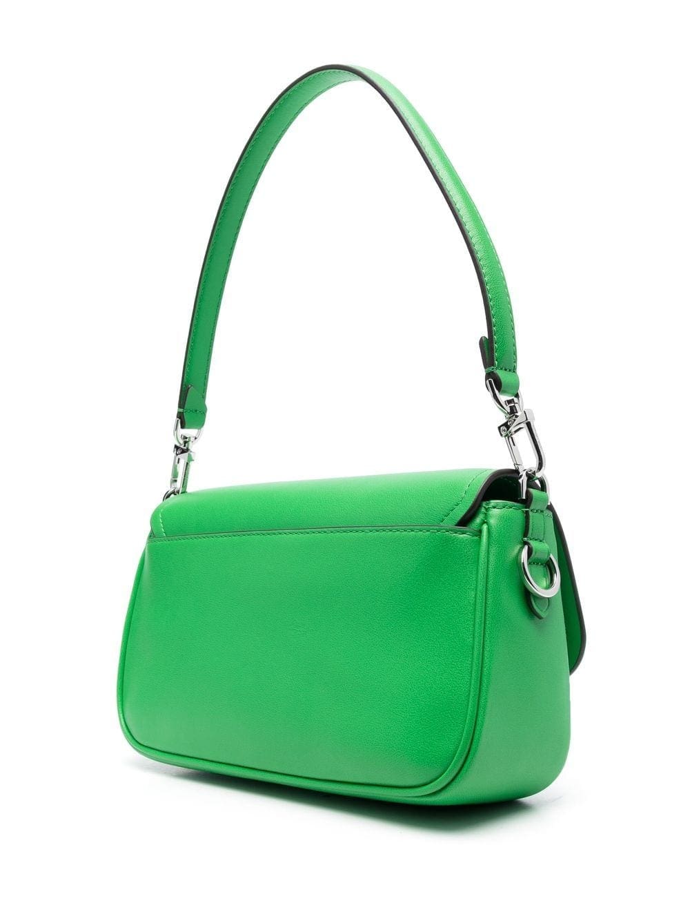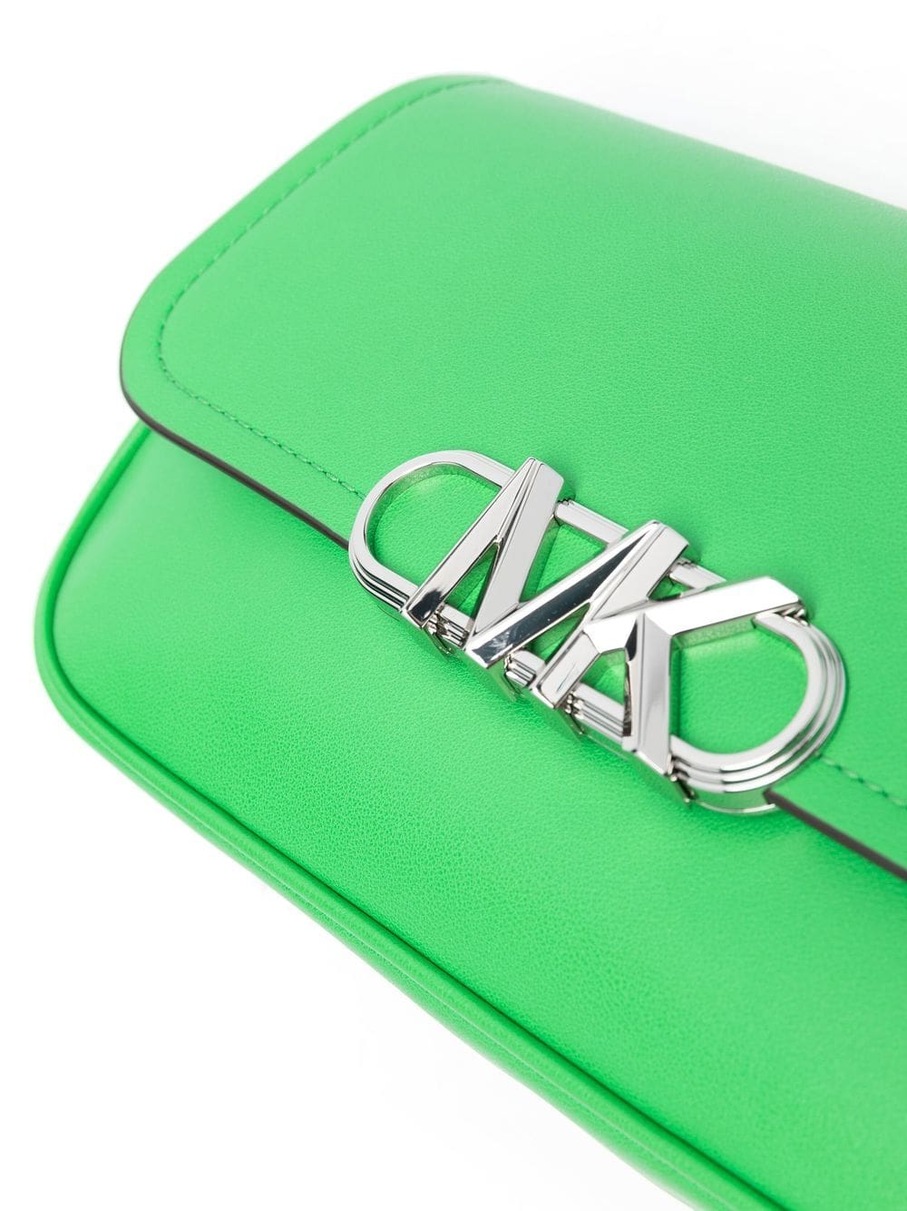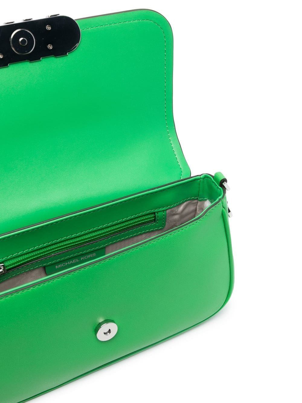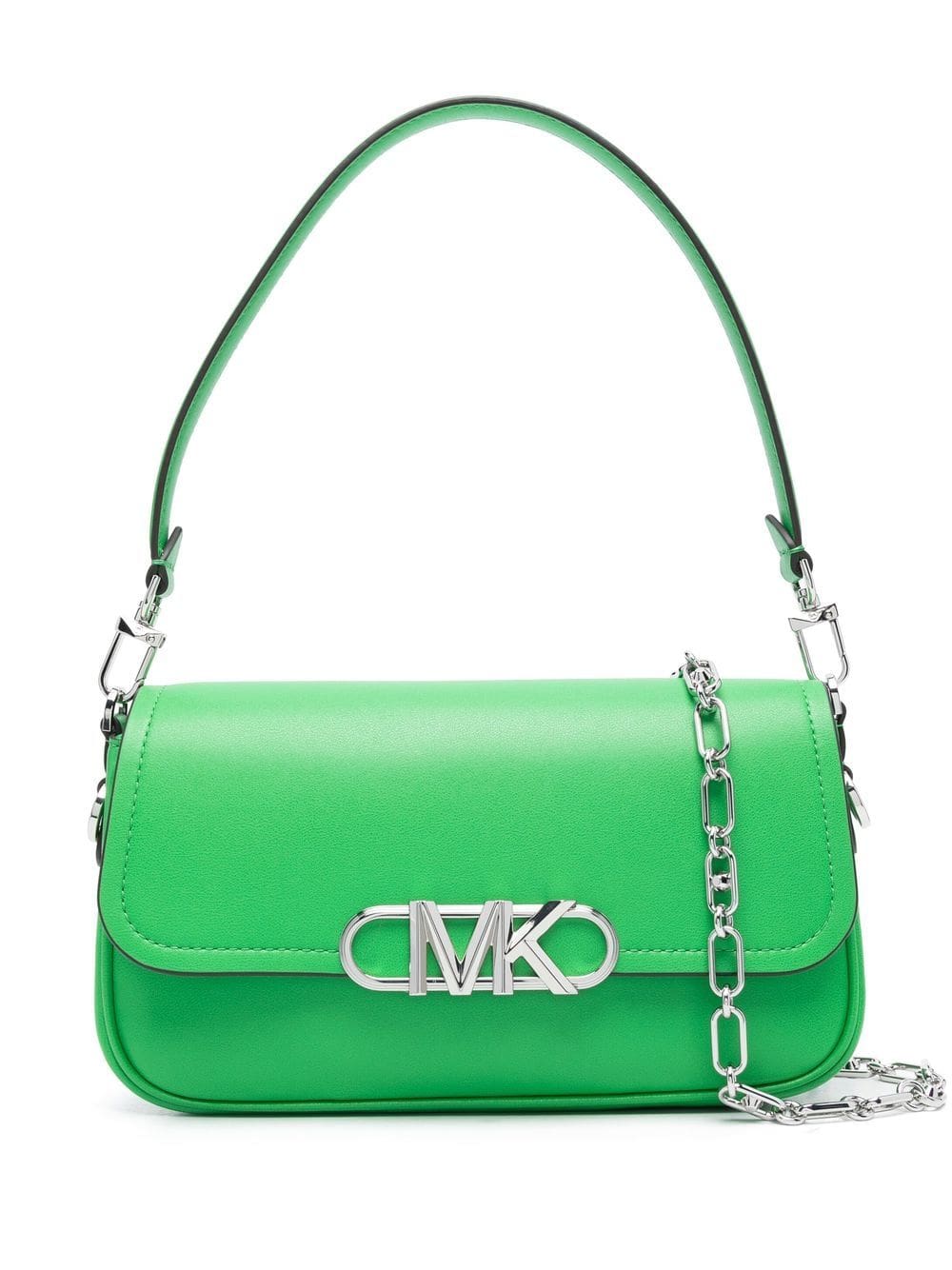 bright green calf leather logo plaque foldover top single flat top handle chain-link shoulder strap main compartment