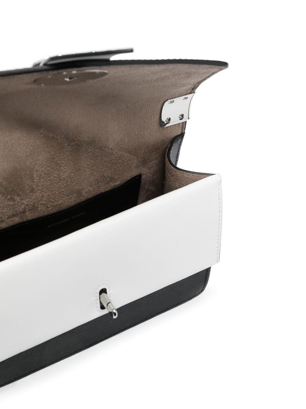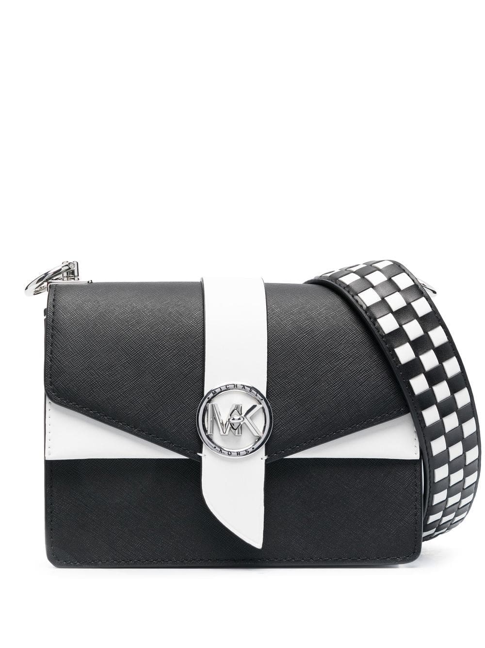 black/white calf leather colour-block design silver-tone logo plaque foldover top with press-stud fastening check-pattern detachable shoulder strap main compartment internal patch pocket