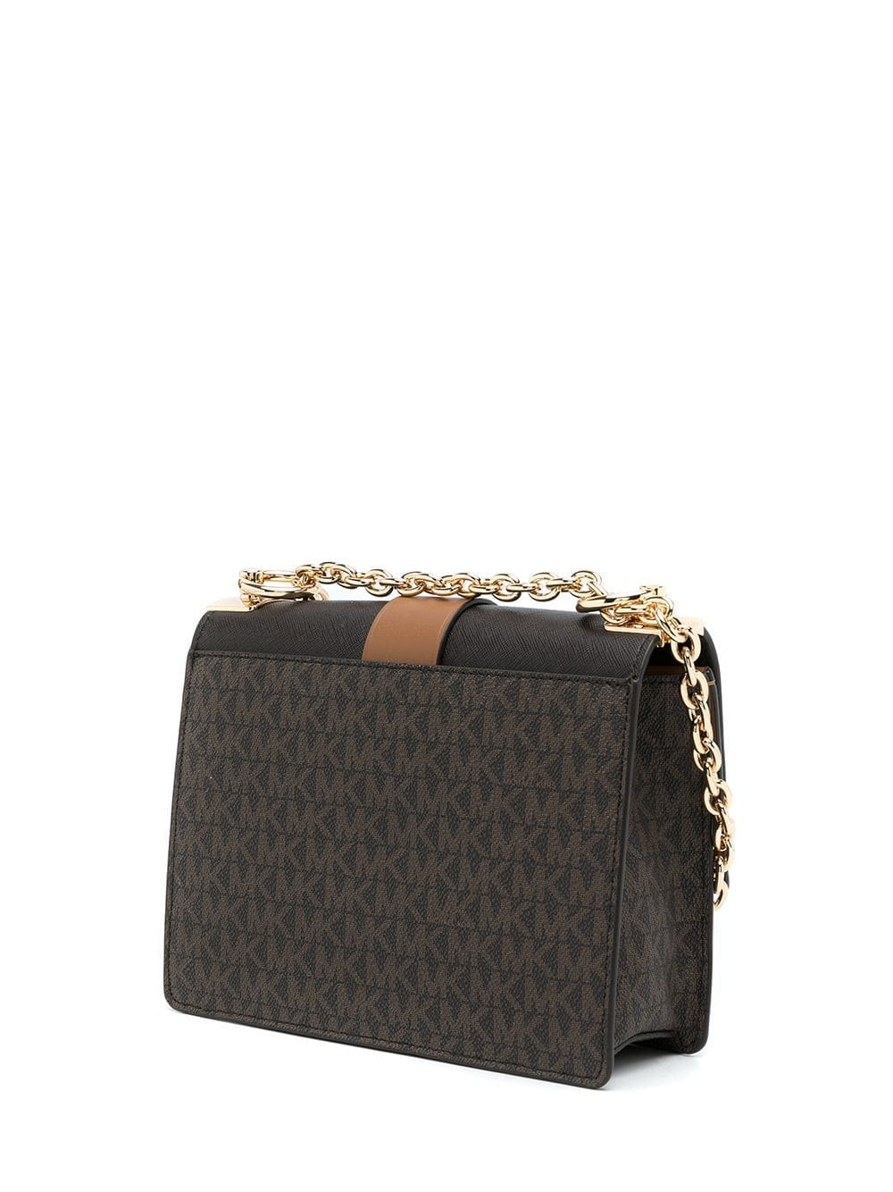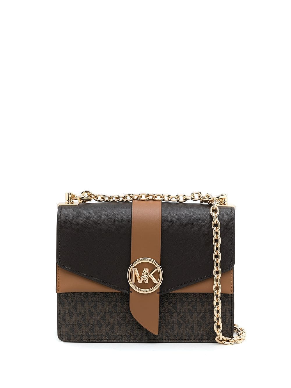 black/brown leather all-over logo print colour-block panelled design chain-link shoulder strap internal patch pocket