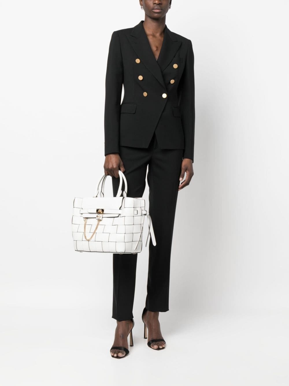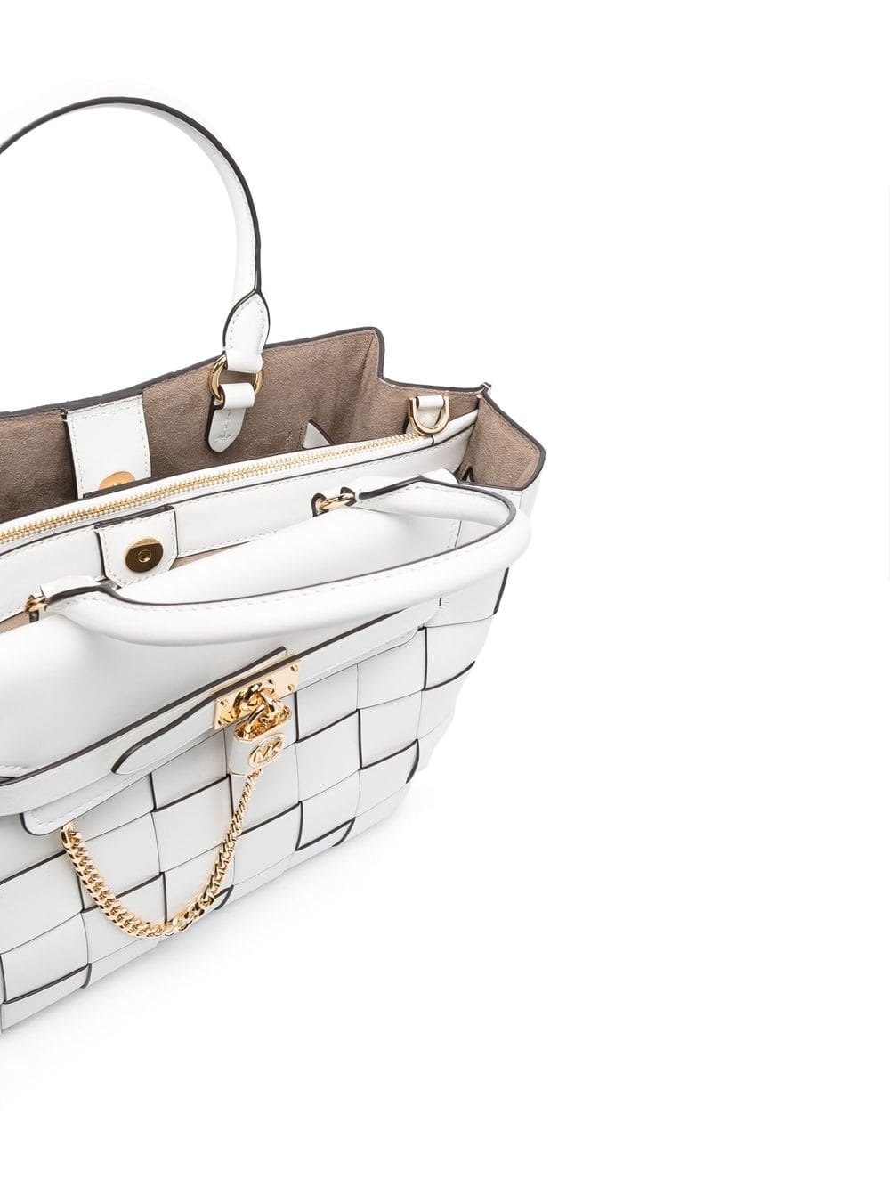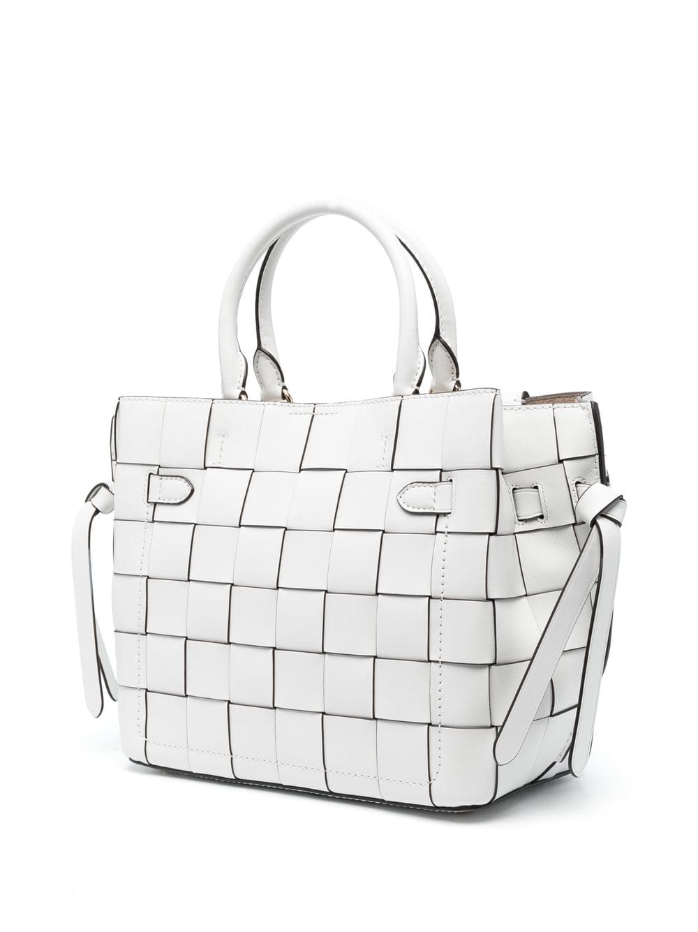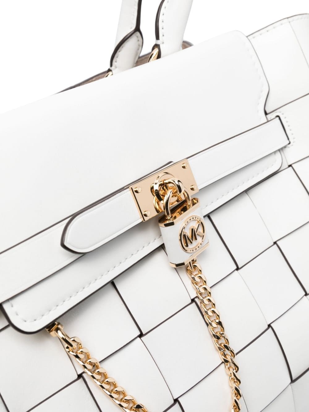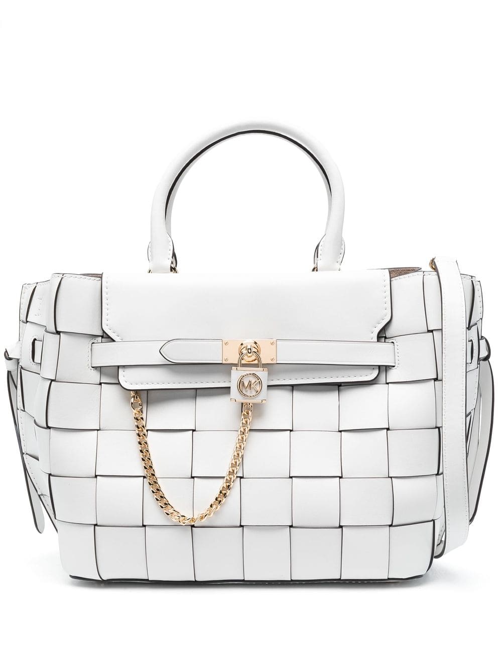 white calf leather interwoven design logo-engraved gold-tone hardware foldover top with magnetic fastening circular top handles detachable shoulder strap partitioned compartment internal zip-fastening pocket