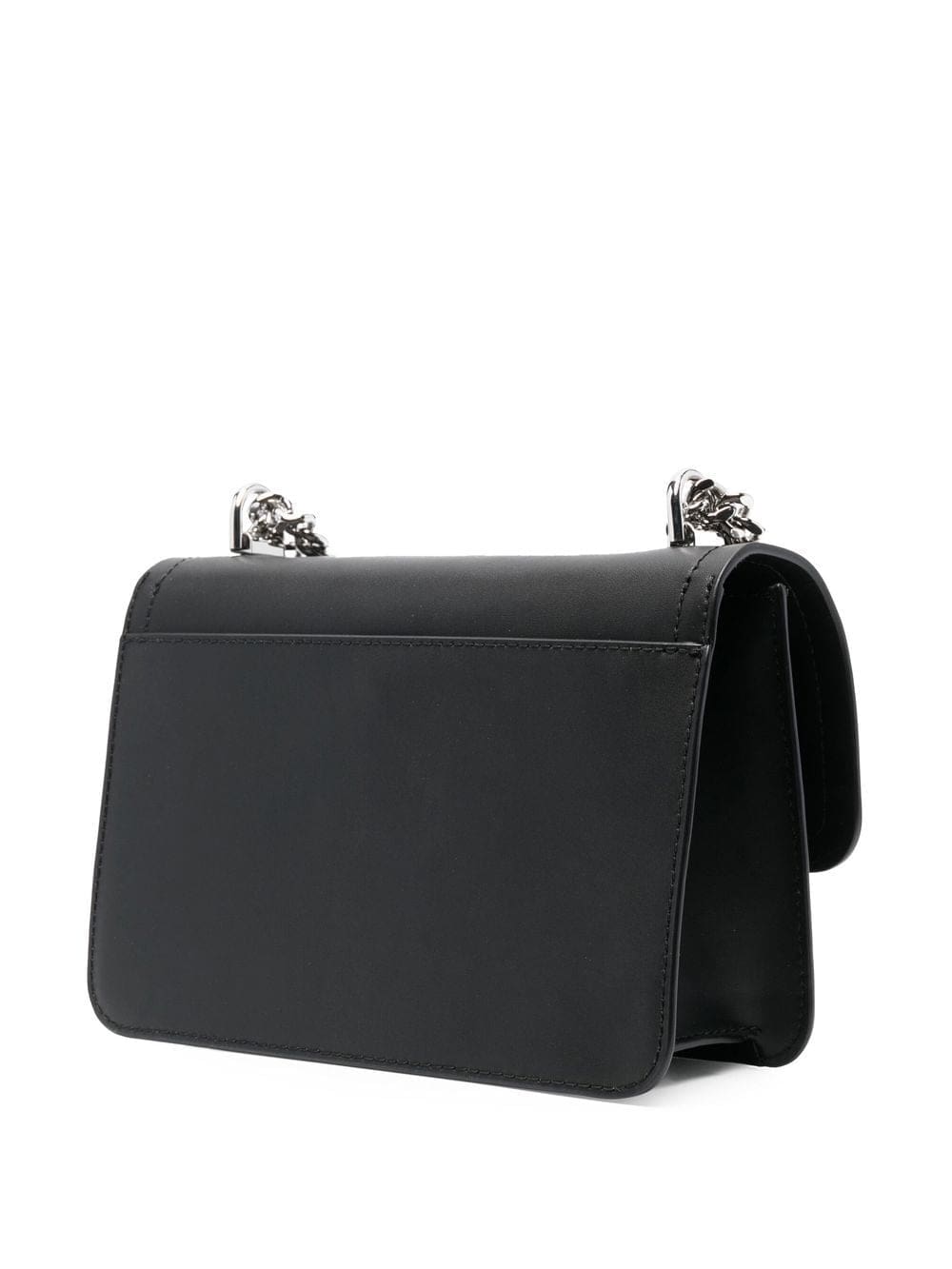 black leather silver-tone hardware logo plaque foldover top with magnetic fastening slip pocket to the front main compartment leather and chain-link shoulder strap