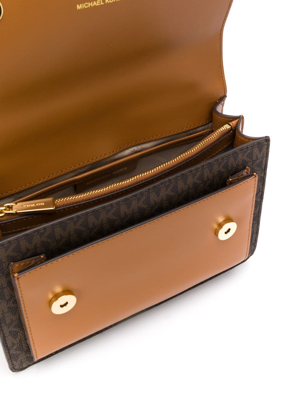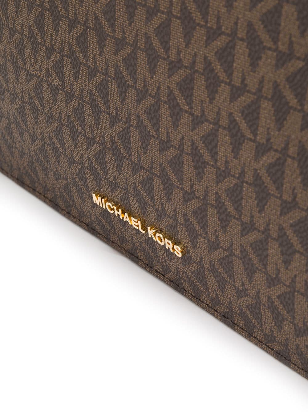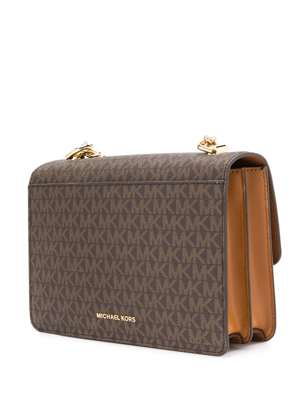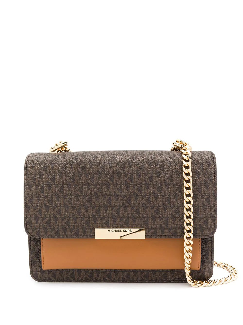 Brown leather Jade Large crossbody bag from Michael Michael Kors featuring a chain and leather strap, an all over logo print, a gold-tone logo plaque, a foldover top with magnetic closure, interior compartments divided by a partition, an internal zipped pocket and a logo printed lining.