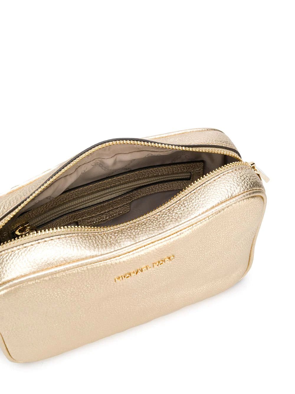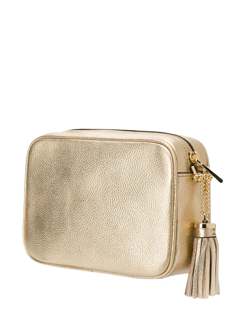Gold-tone leather Jet Set crossbody bag from Michael Michael Kors featuring a rectangular body, a pebbled leather texture, a top zip closure, a chain and leather strap, gold-tone hardware, a main internal compartment and a hanging tassel.