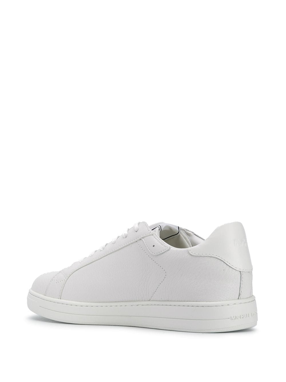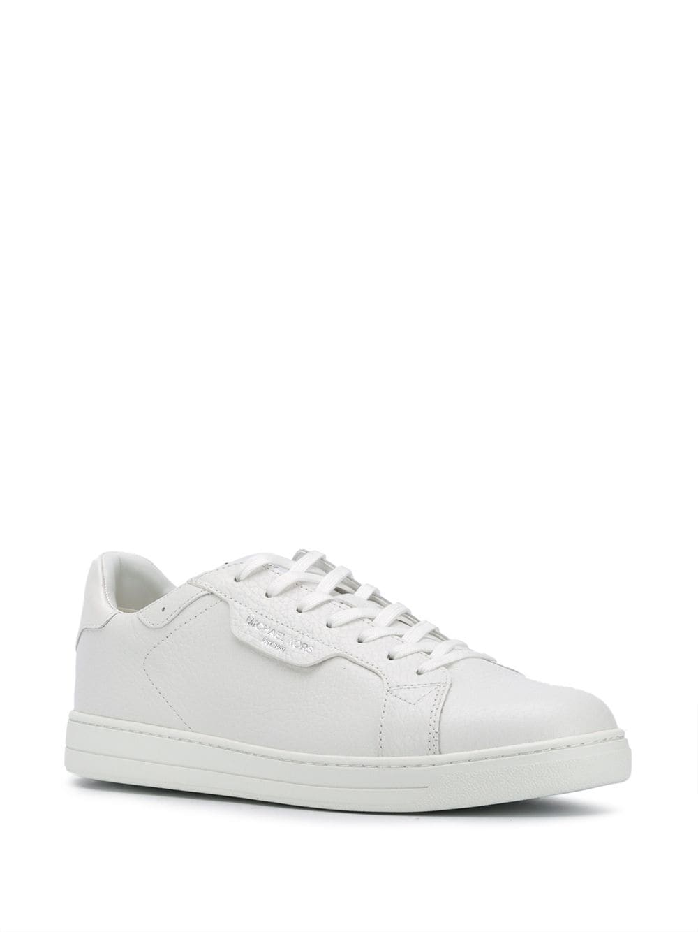 white calf leather logo patch at the tongue round toe front lace-up fastening flat rubber sole