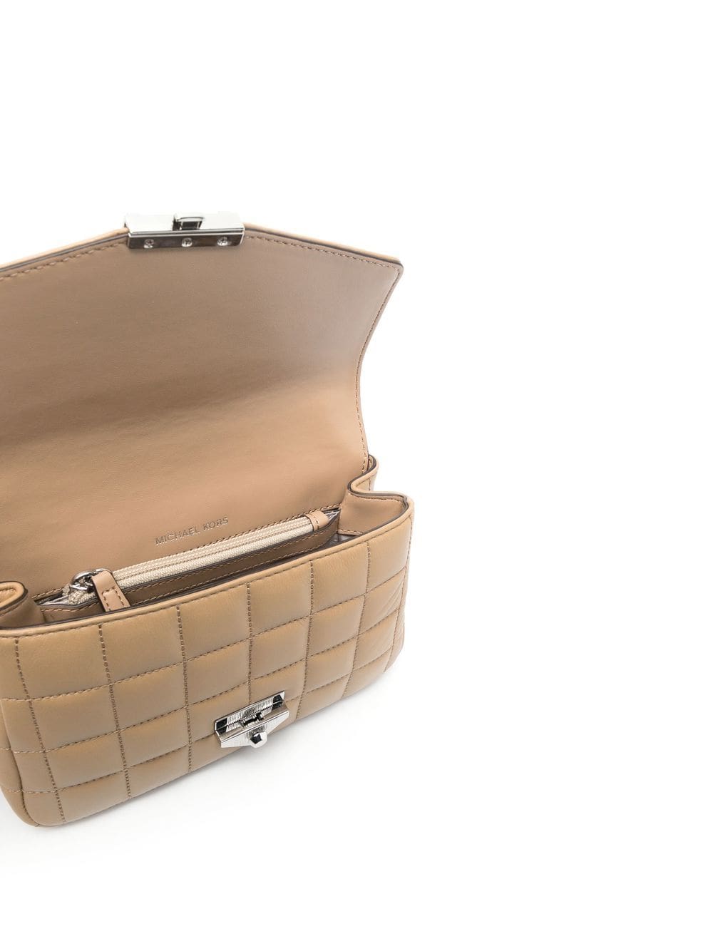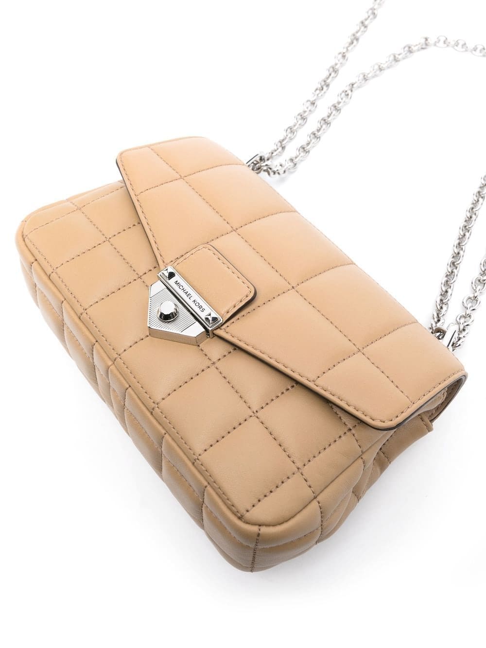 camel brown calf leather matelassé effect silver-tone hardware chain-link shoulder strap foldover top main compartment internal zip-fastening pocket