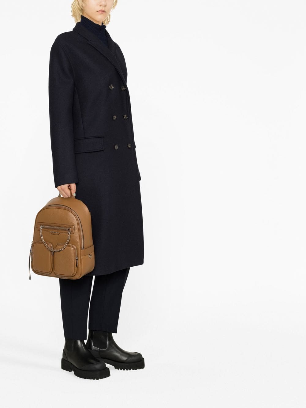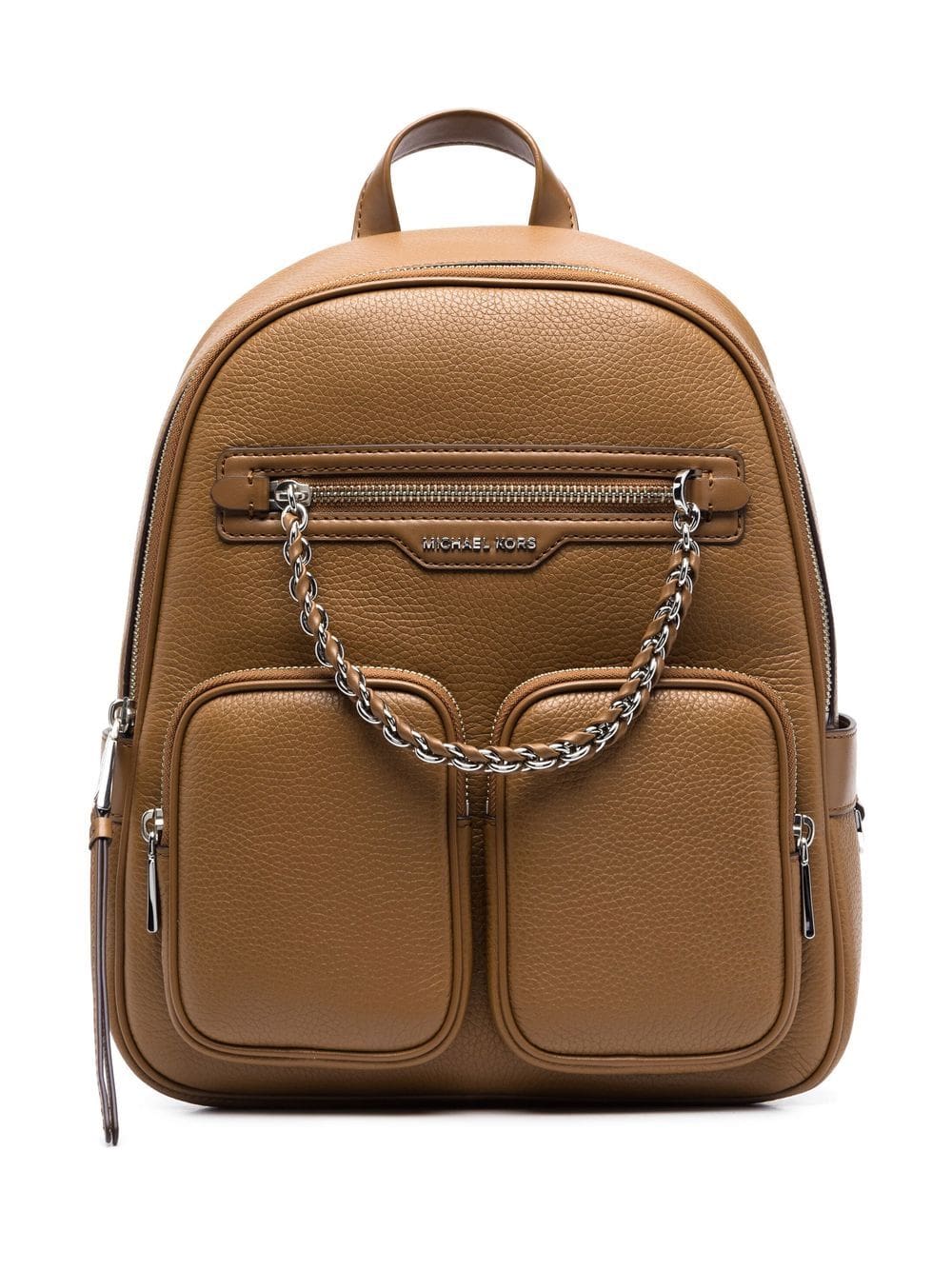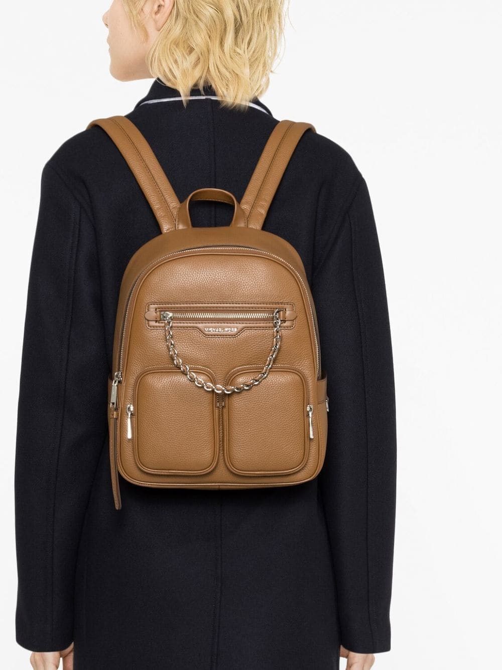 Structured shapes and elevated textures take centre stage at Michael Michael Kors for SS23. Crafted from pebbled leather, this rich brown backpack is decorated with a polished silver-tone logo plaque for a signature branded finish.