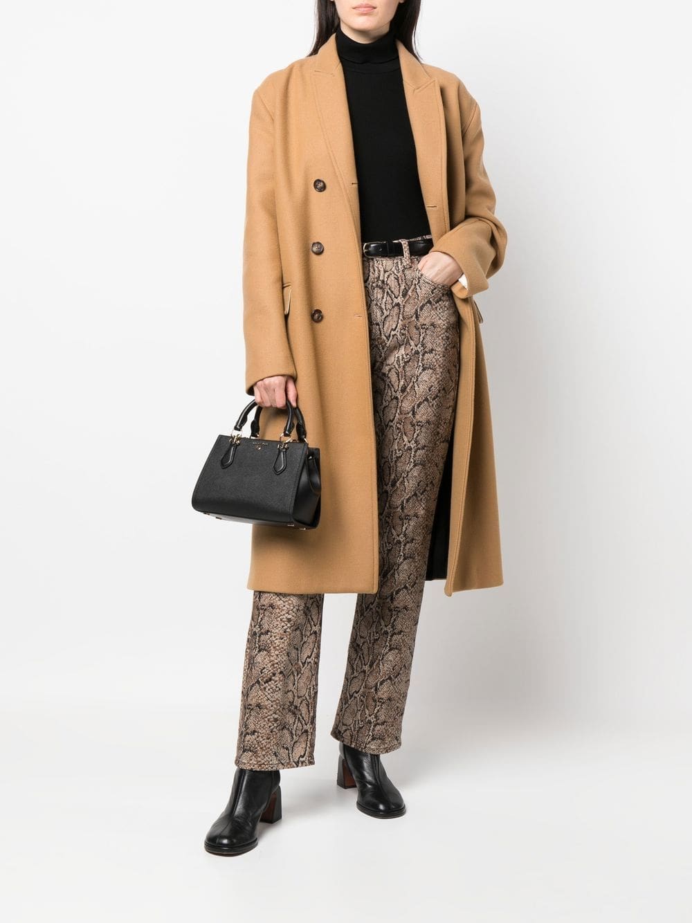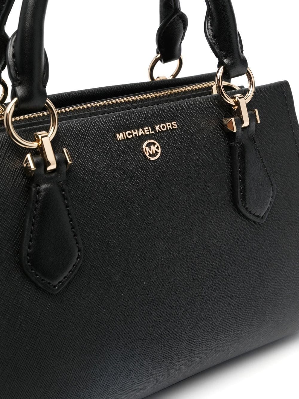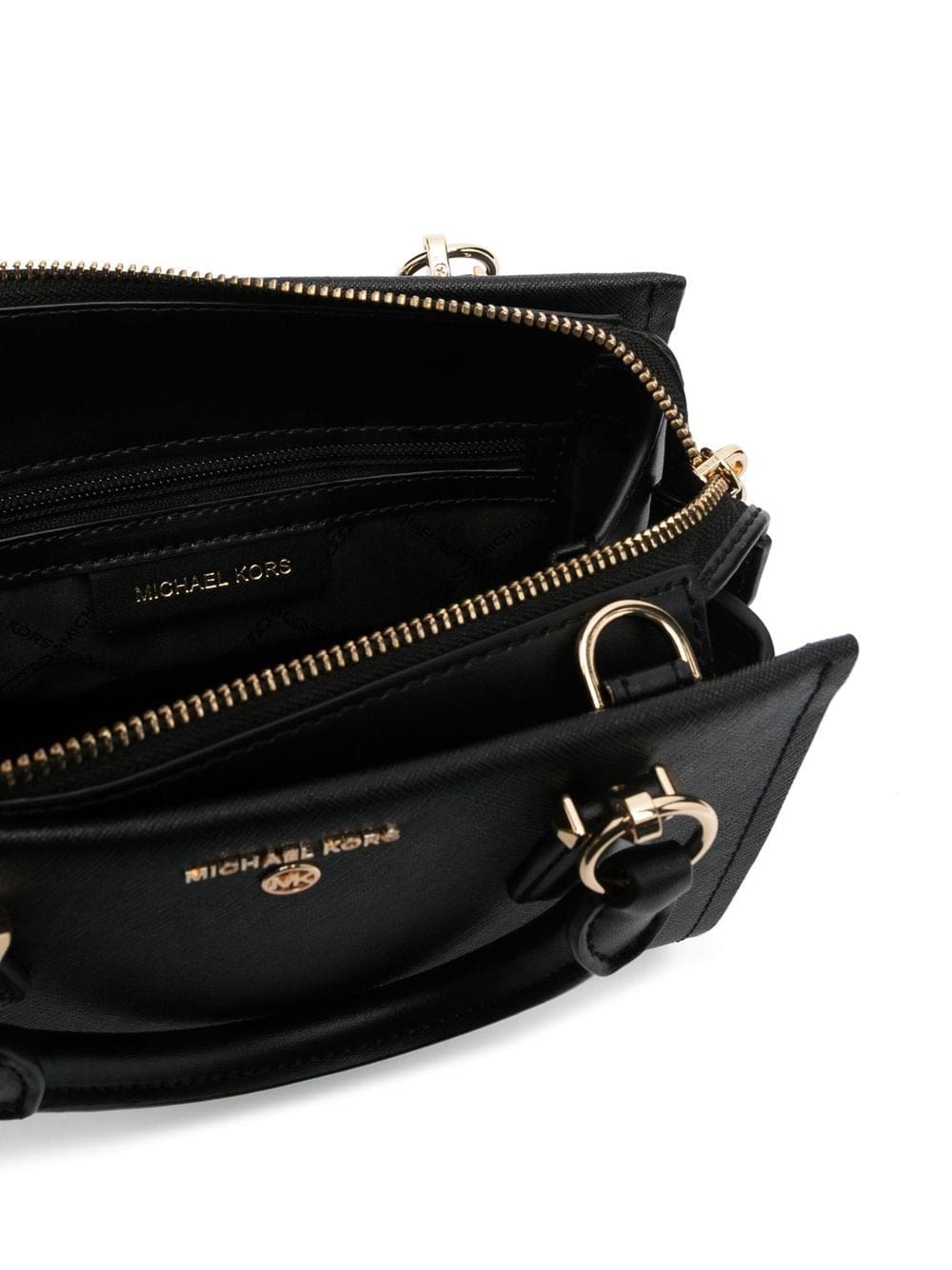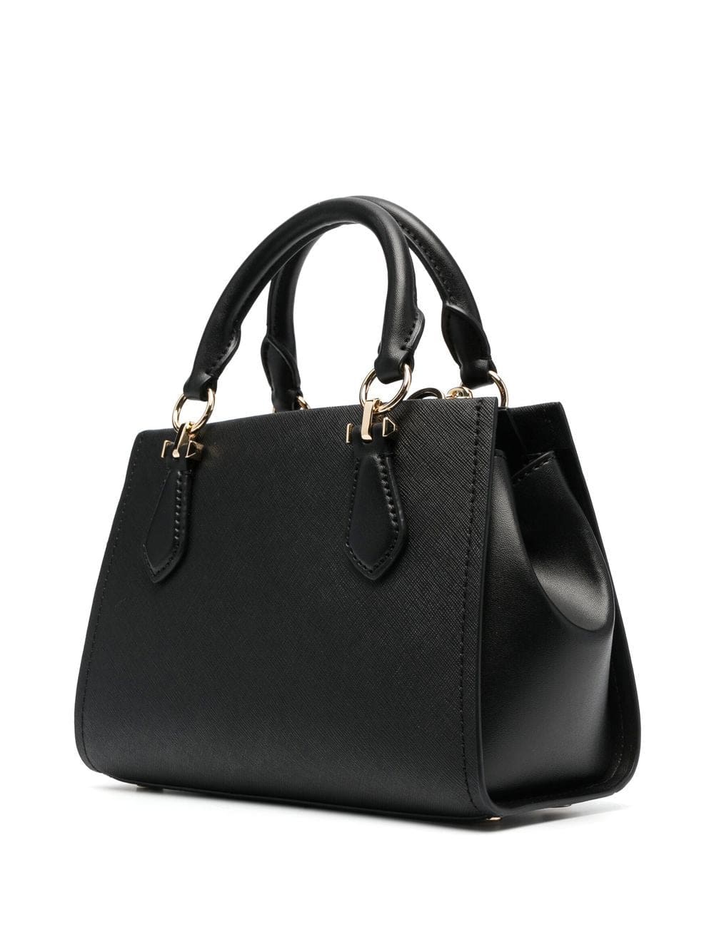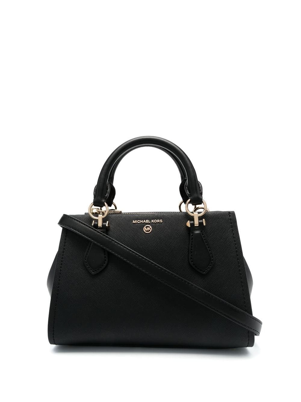 black calf leather gold-tone logo lettering two rounded top handles adjustable detachable shoulder strap top zip fastening