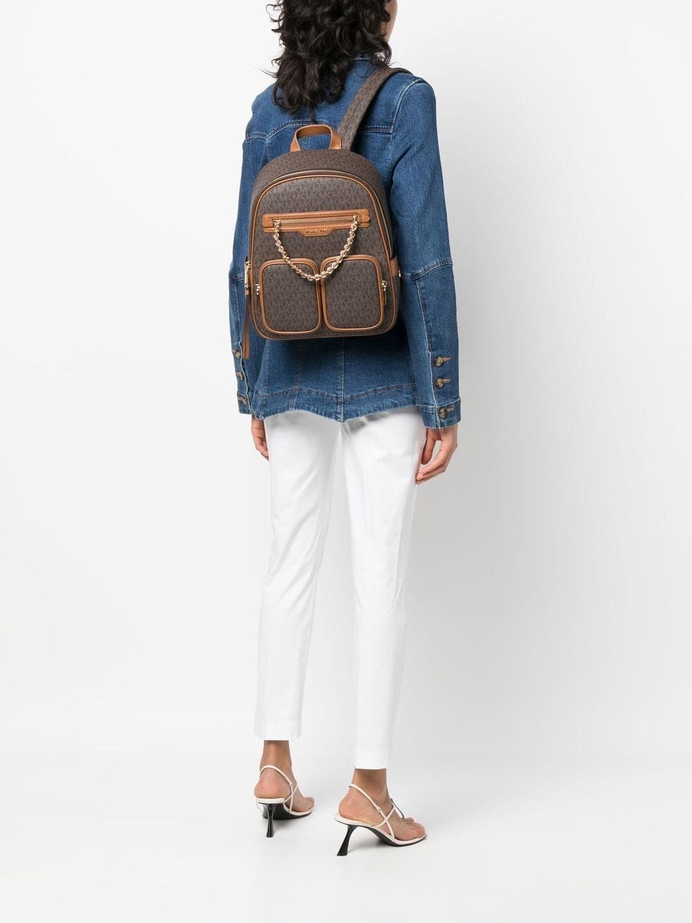 brown faux leather monogram pattern chain-link detailing gold-tone logo lettering top zip fastening main compartment internal zip-fastening pocket front zip-fastening pocket two front pouch pockets single flat top handle adjustable shoulder straps