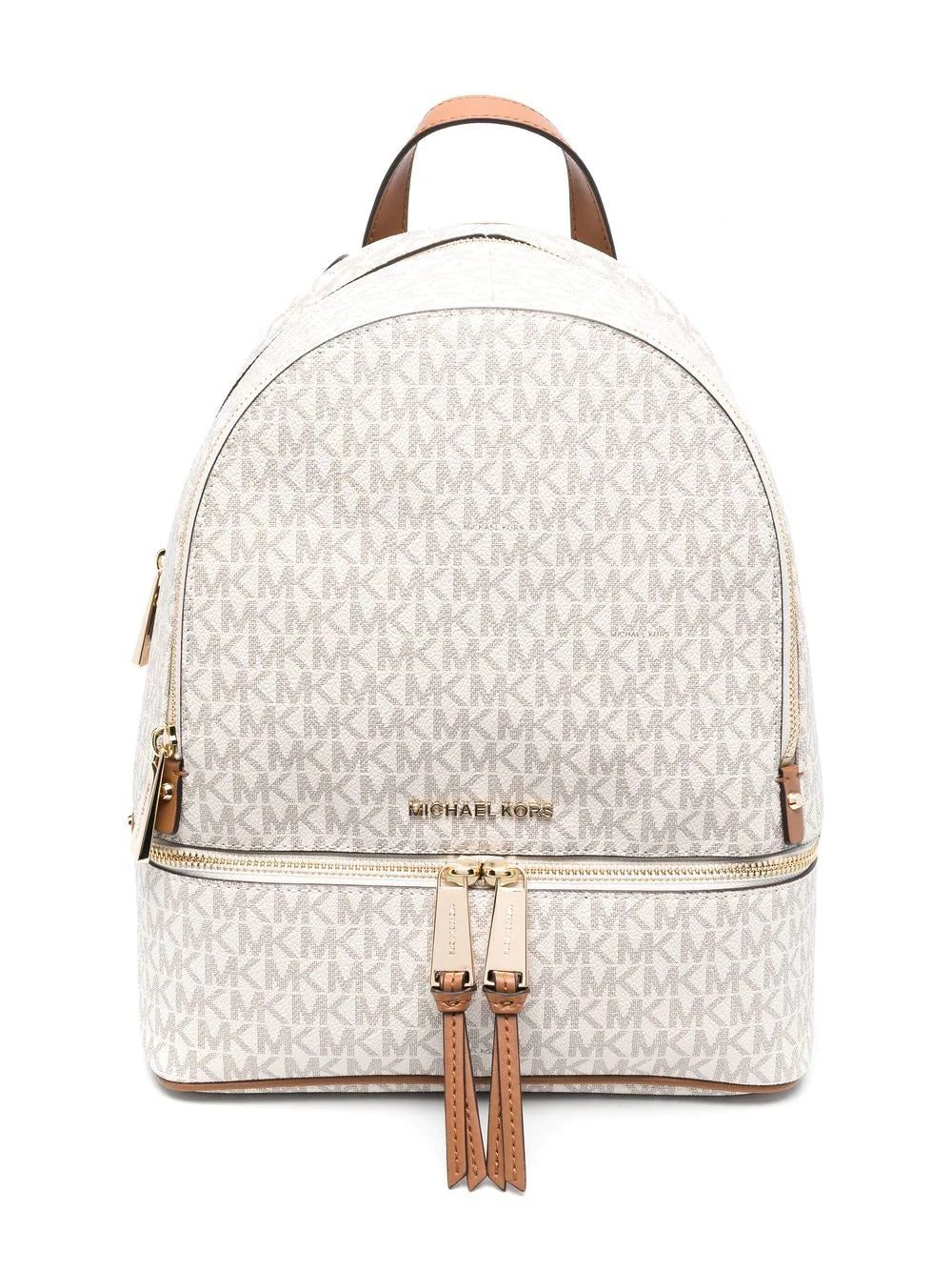 White and beige medium Rhea logo-print backpack from Michael Michael Kors featuring a top handle, adjustable shoulder straps, a double top zip closure, an internal slip pocket, an all over logo print, gold-tone hardware and multiple zipped pockets.
