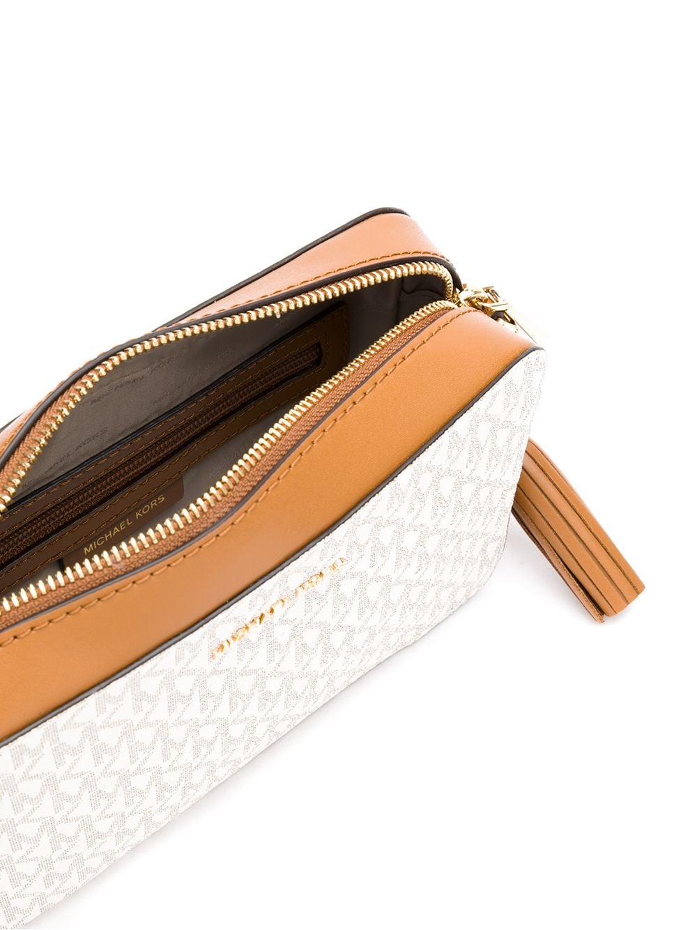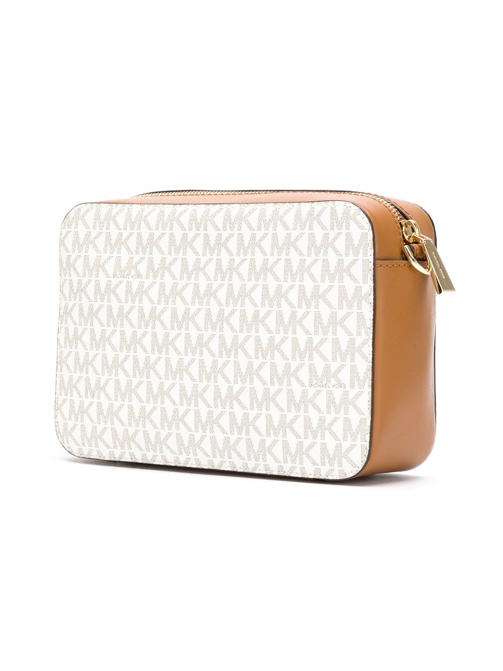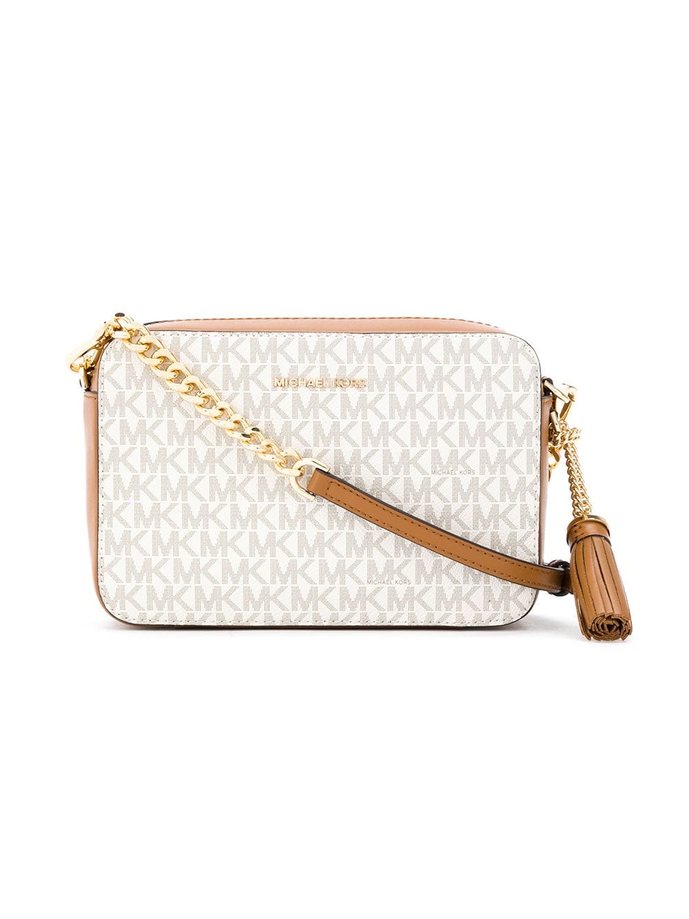 White and camel brown monogram logo cross-body bag from Michael Michael Kors featuring gold-tone hardware, a top zip closure, a logo plaque, an internal zipped pocket, an internal logo patch and a chain and leather shoulder strap.