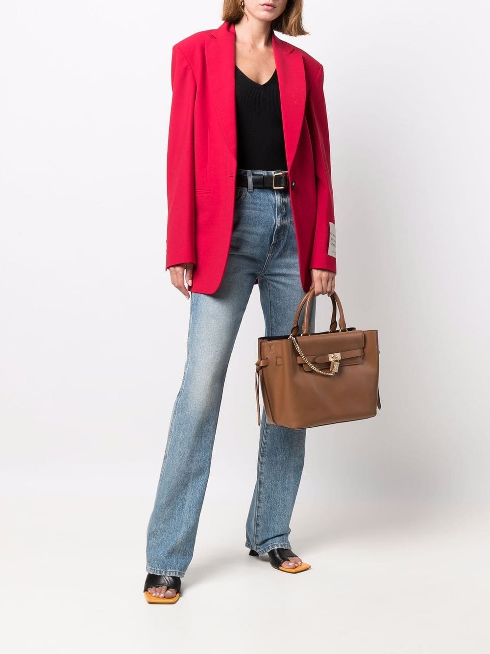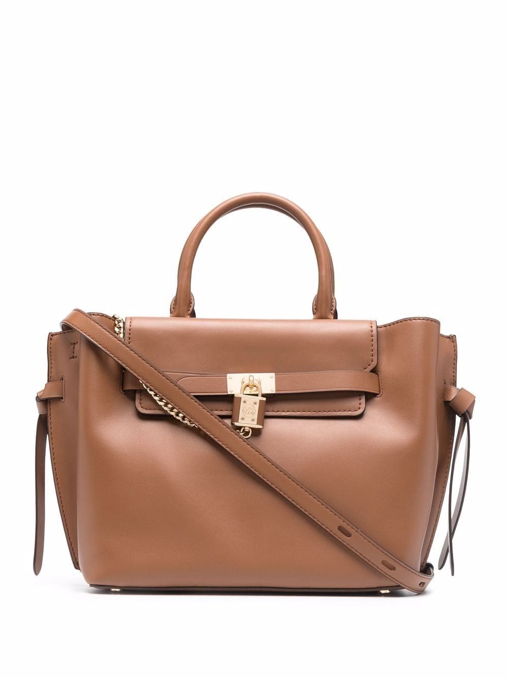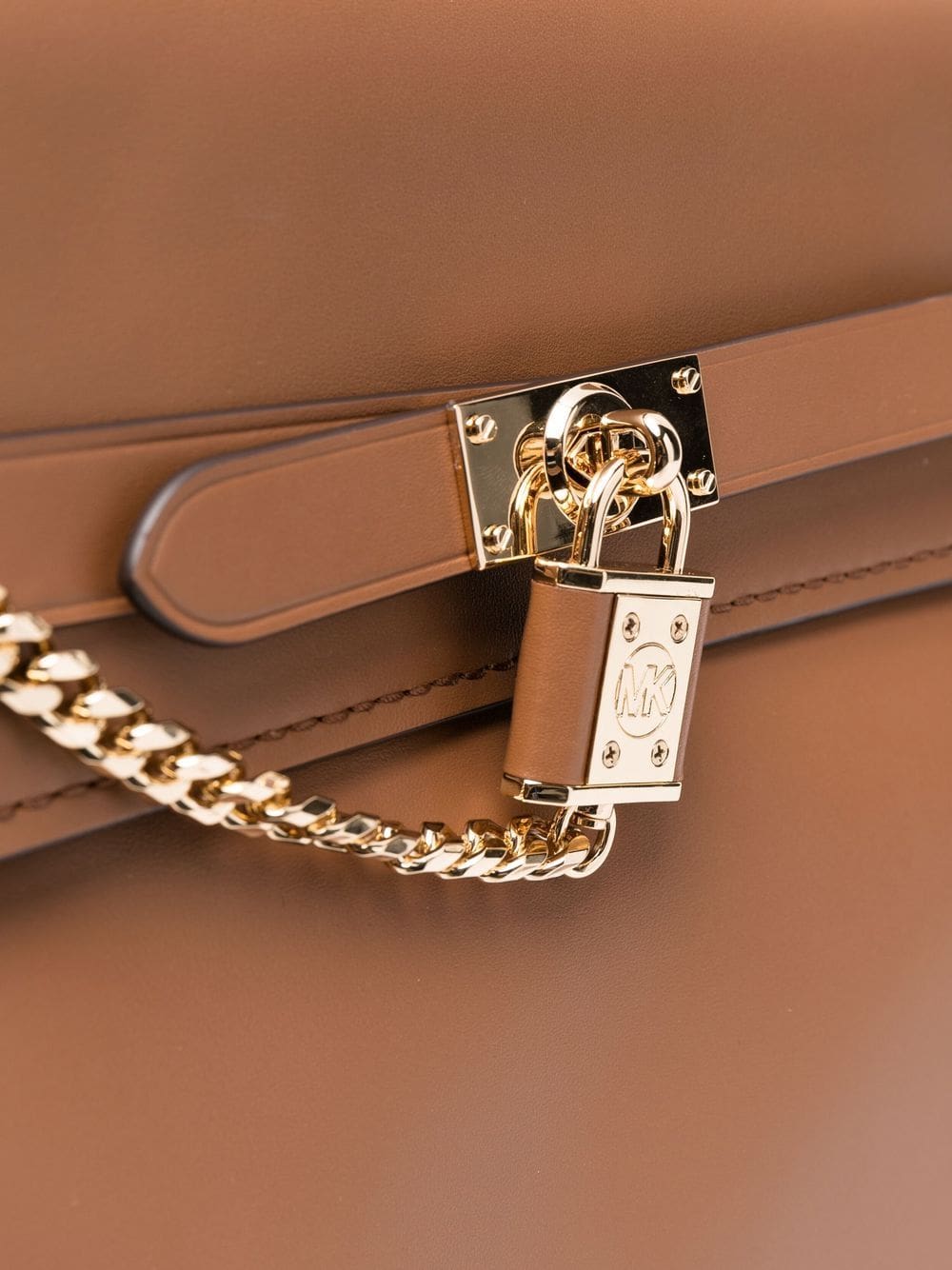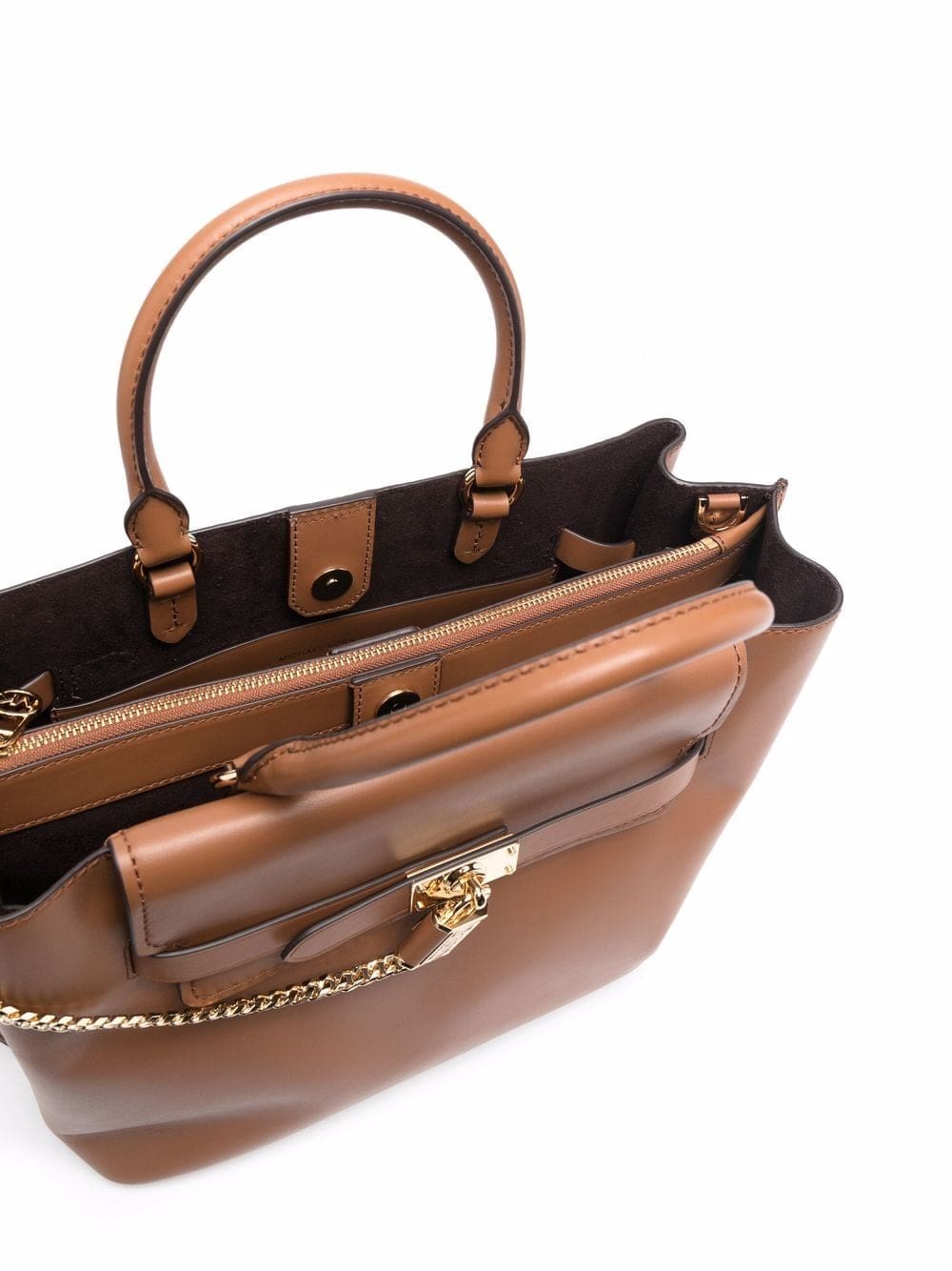 brown leather gold-tone hardware chain-link detailing foldover top magnetic fastening main compartment two rounded top handles