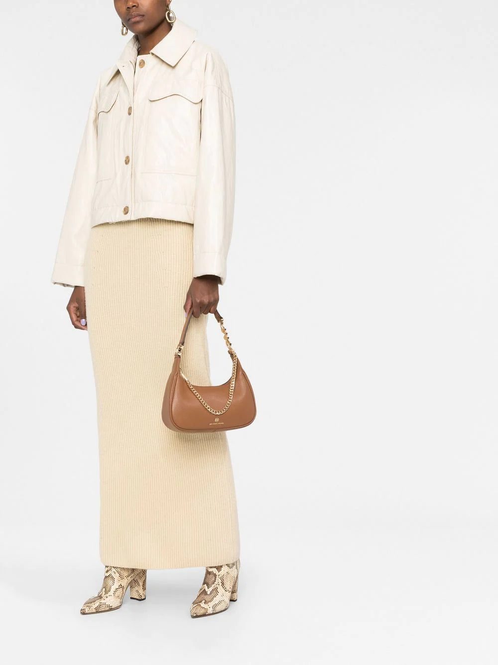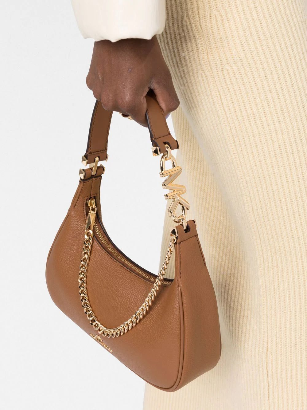 The Piper shoulder bag is a signature staple of Michael Kors. Defined by its timeless silhouette and logo embellished chain link at the strap, this caramel-hued textured iteration brings the gold-tone branding to focus.