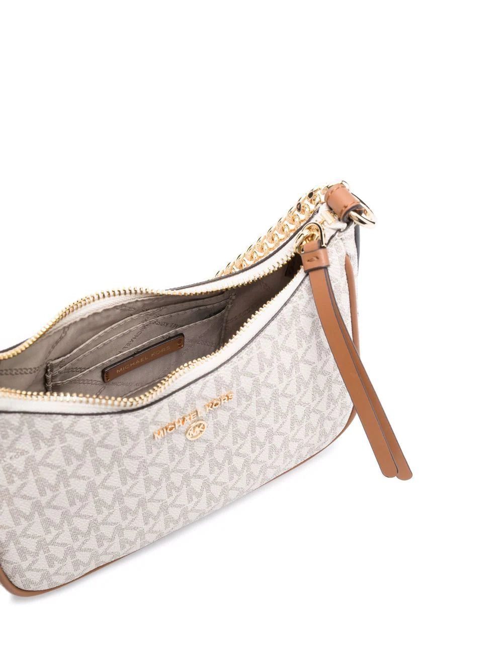 Michael Kors' Jet Set Charm Logo shoulder bag is a contemporary take on a timeless style. Displaying a structured leather silhouette, the design is adorned with all-over monogram detailing and complete with a delicate gilded chain-link strap.