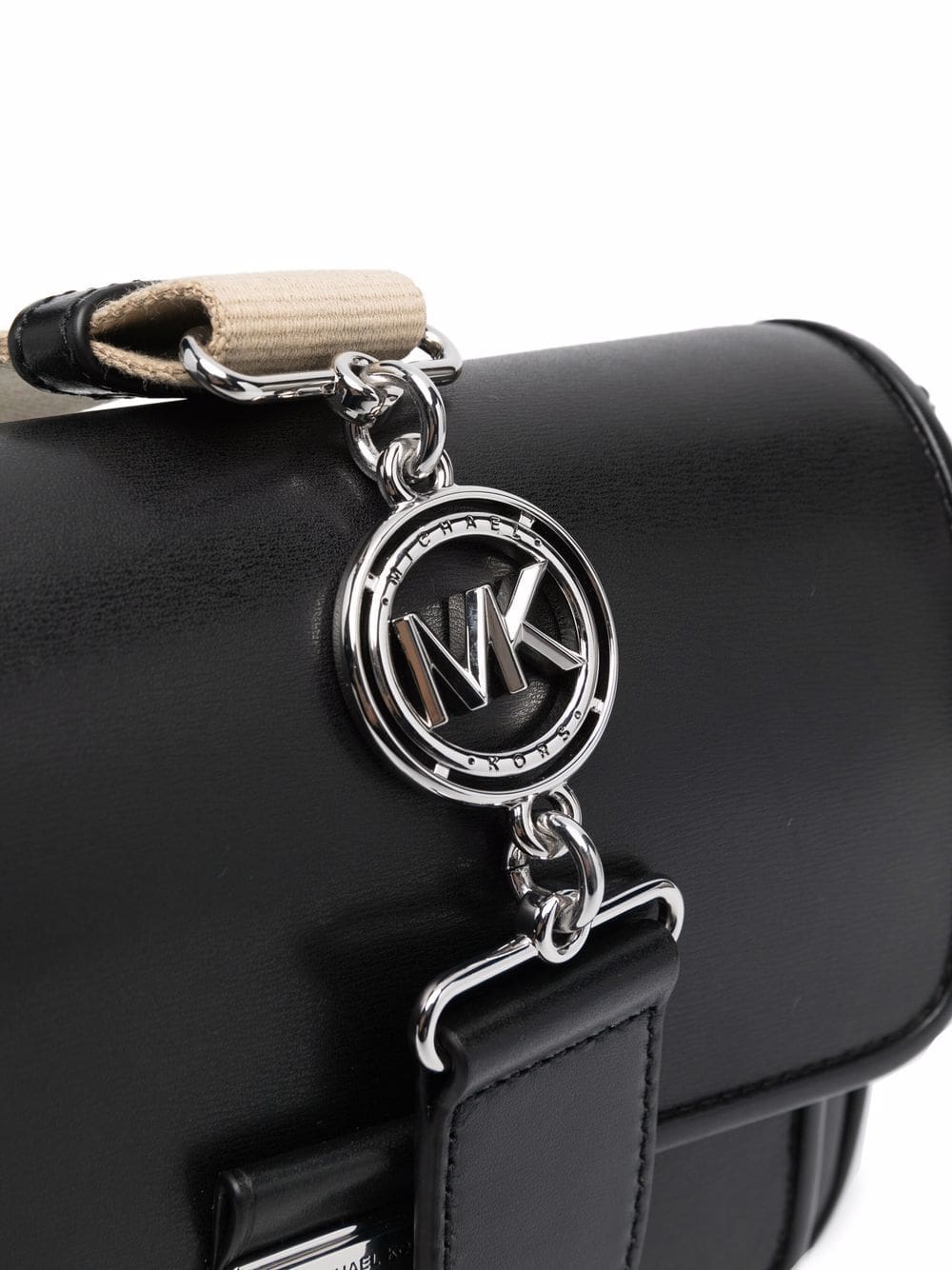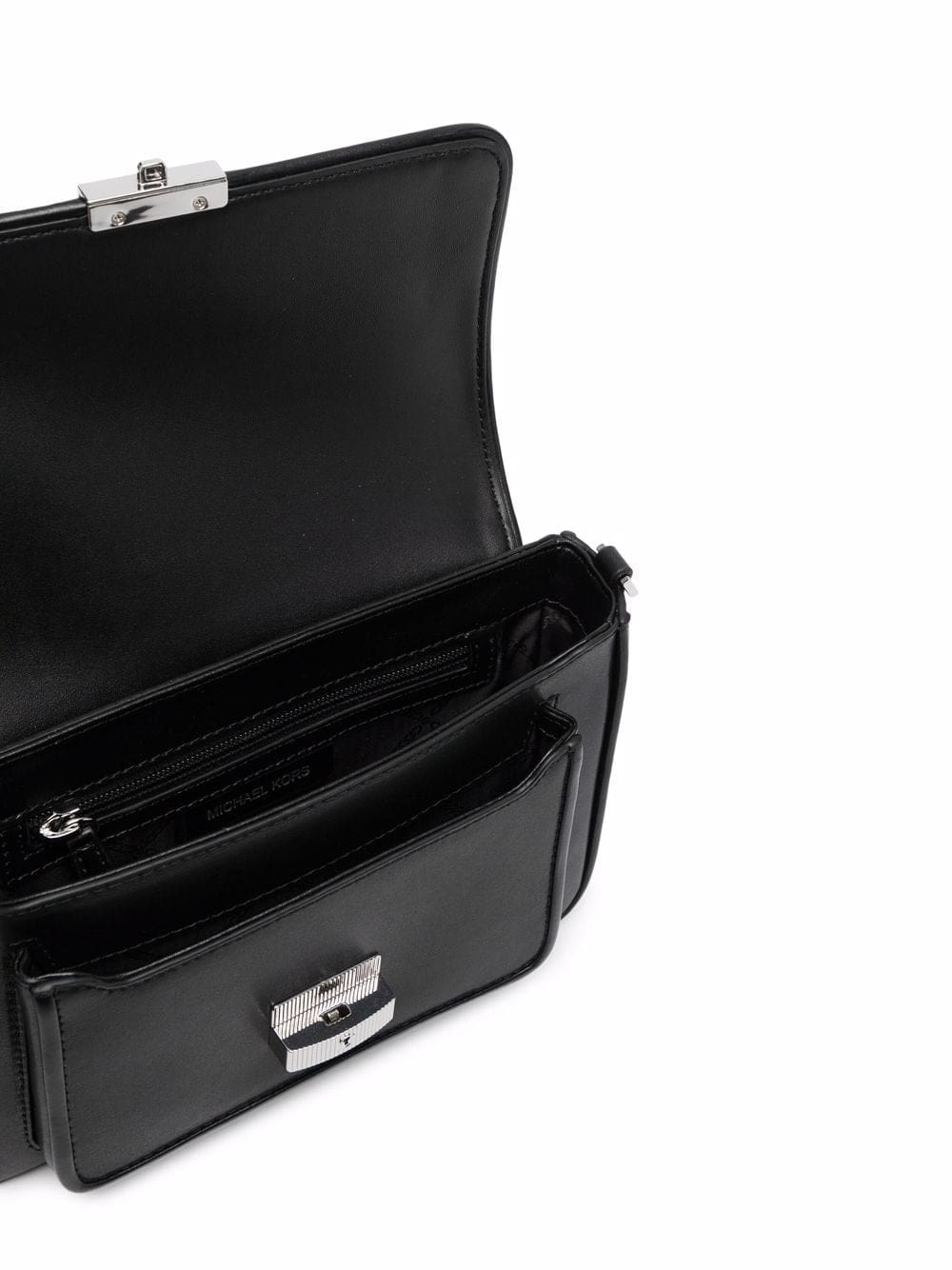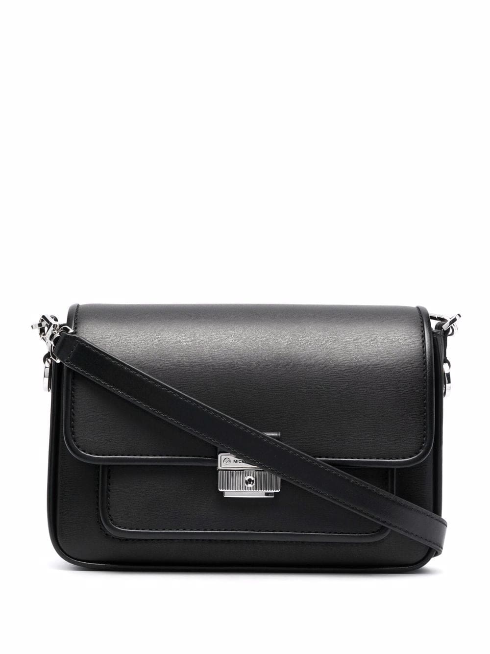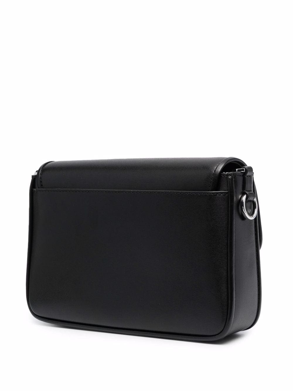 black leather textured finish silver-tone hardware engraved logo foldover top adjustable shoulder strap internal zip pocket