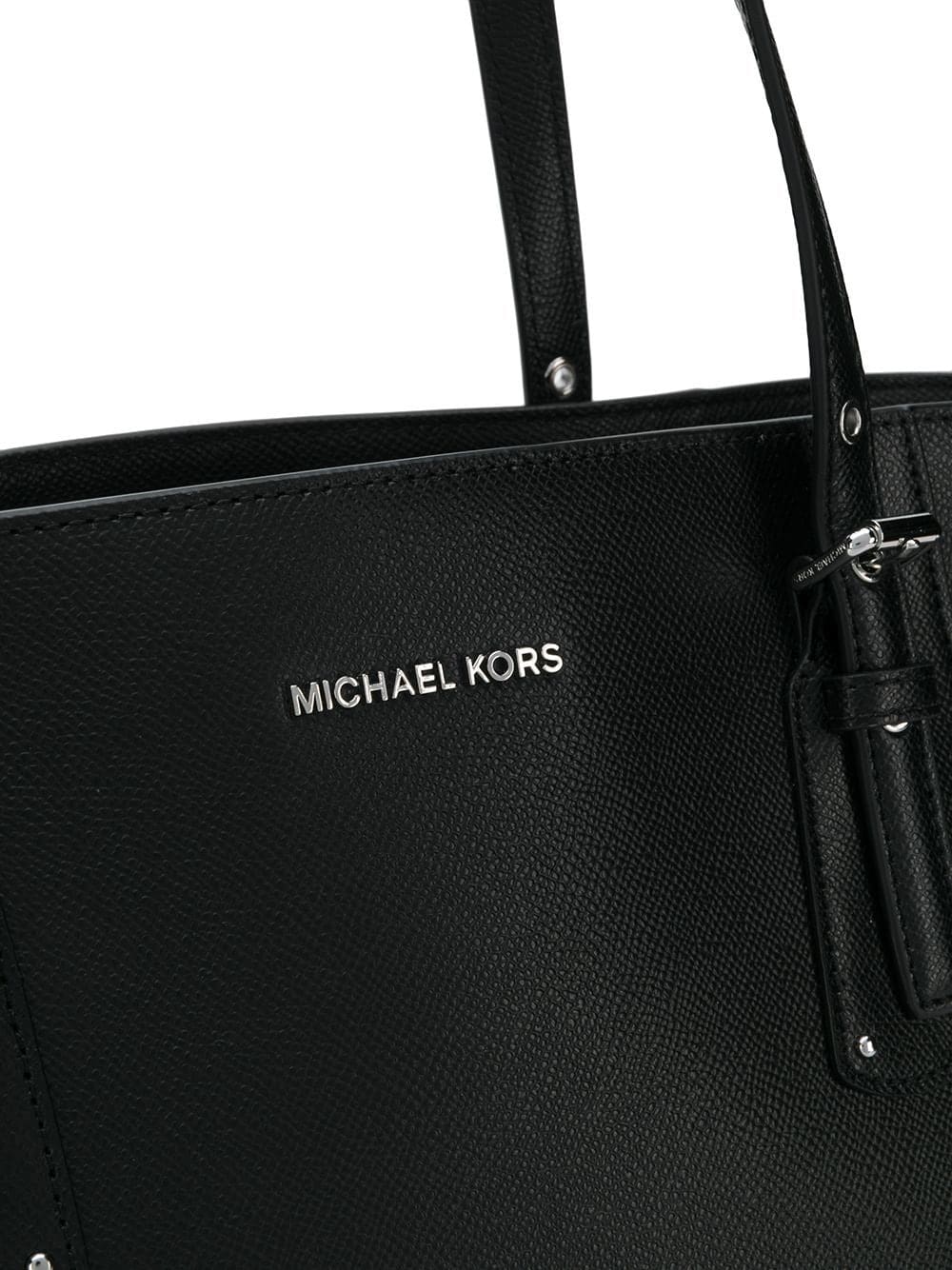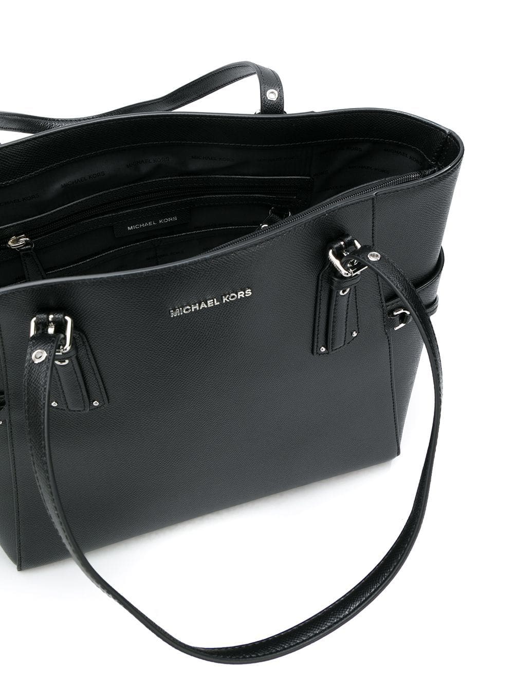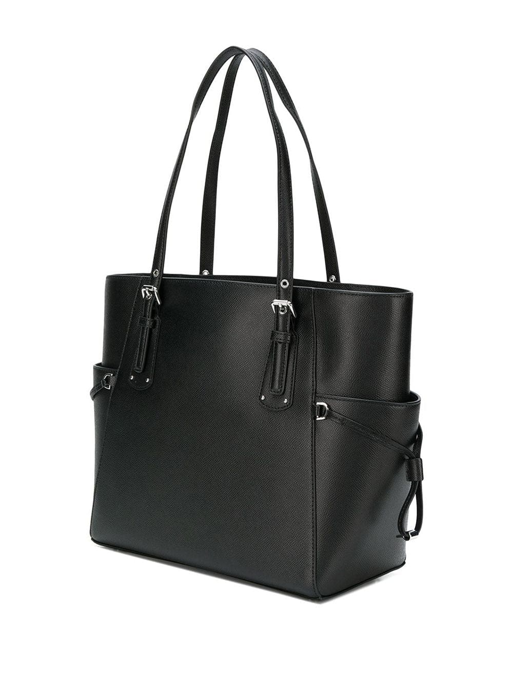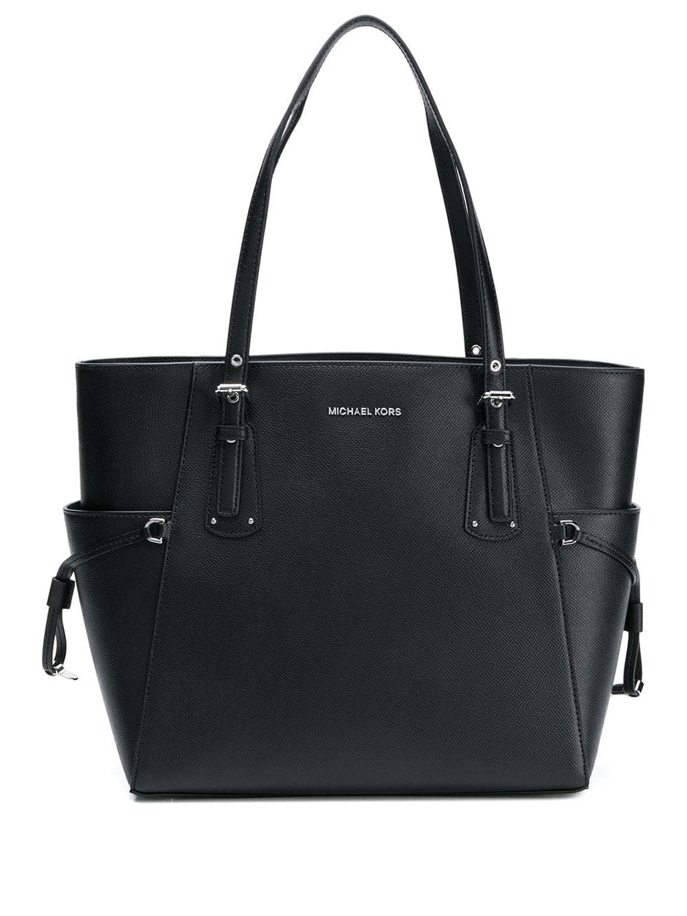 The perfect balance between sophisticated shapes and polished practicality, Michael Michael Kors is the go-to for timelessly chic bags that won’t break the bank. This black leather Voyager Crossgrain tote bag from Michael Michael Kors features round top handles, a zip fastened interior compartment, a main internal compartment, an internal zipped pocket, a front logo plaque, side pockets and silver-tone hardware.