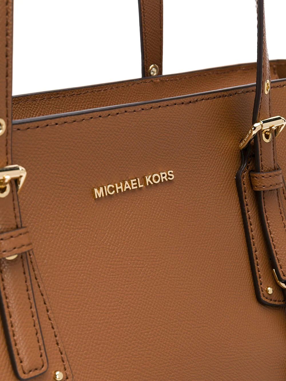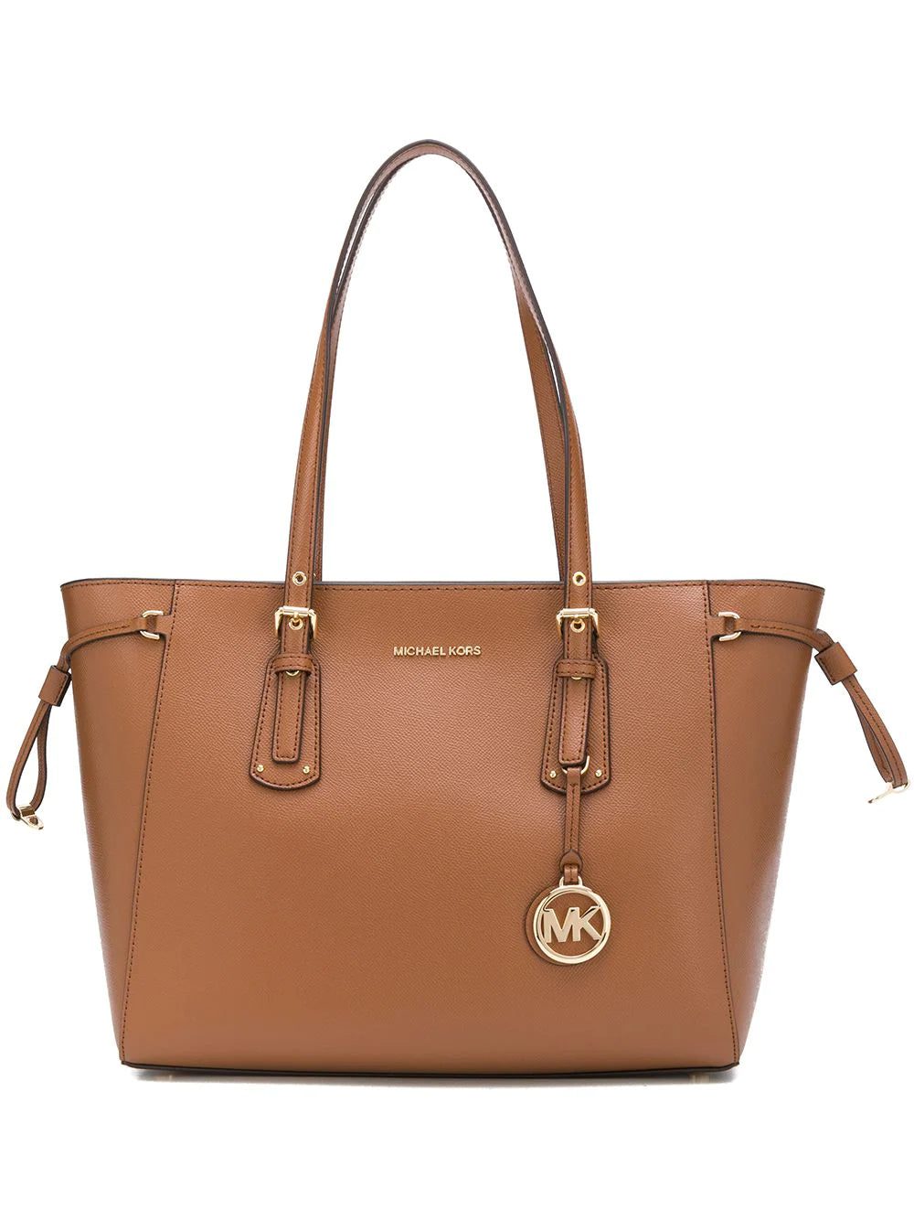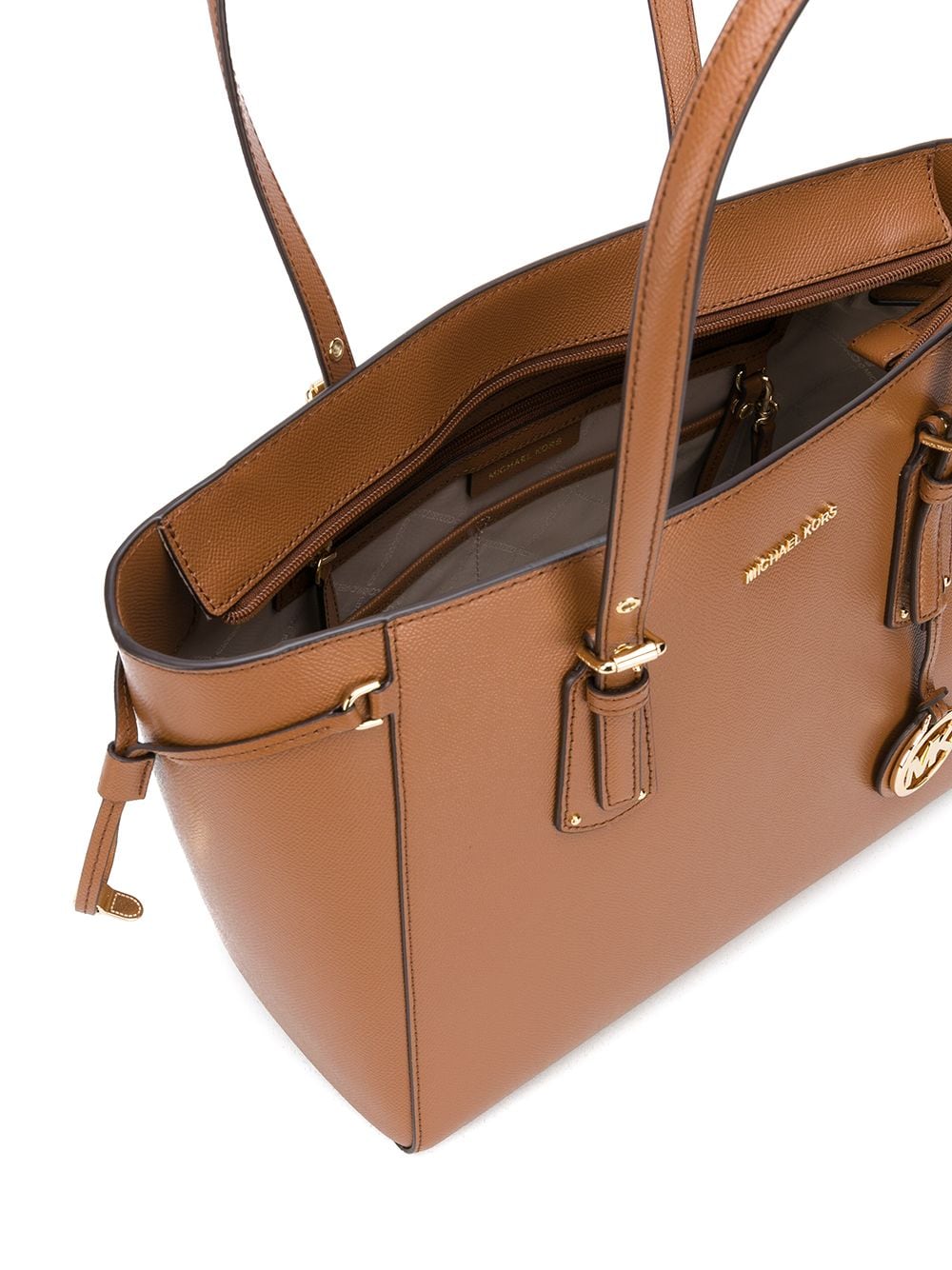 Brown leather Voyager medium tote bag from Michael Michael Kors featuring round top handles, a top zip fastening, a gold-tone logo plaque and a logo tag.