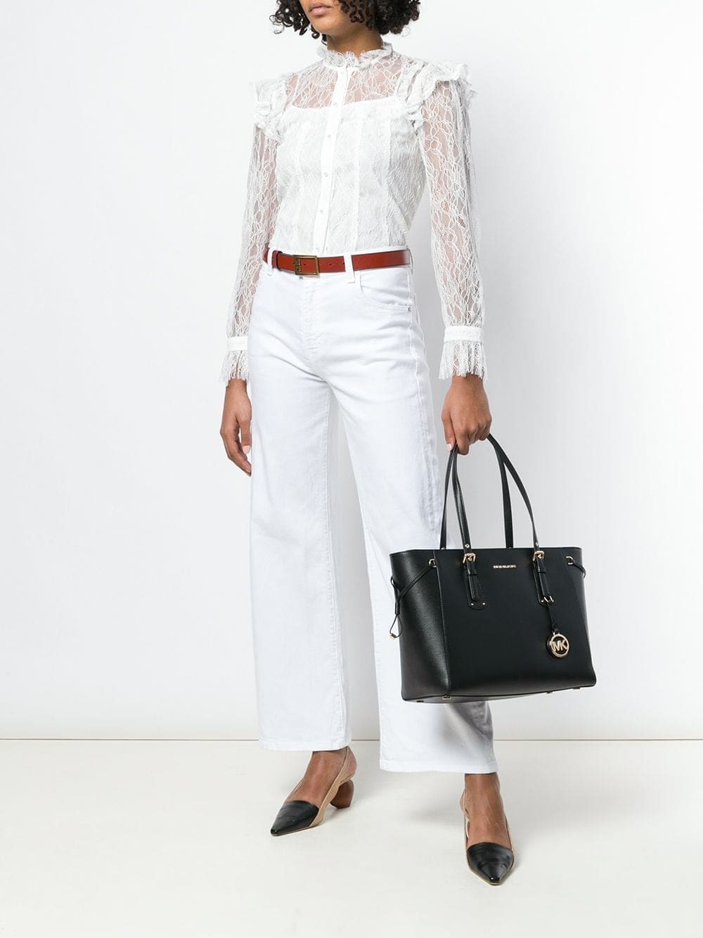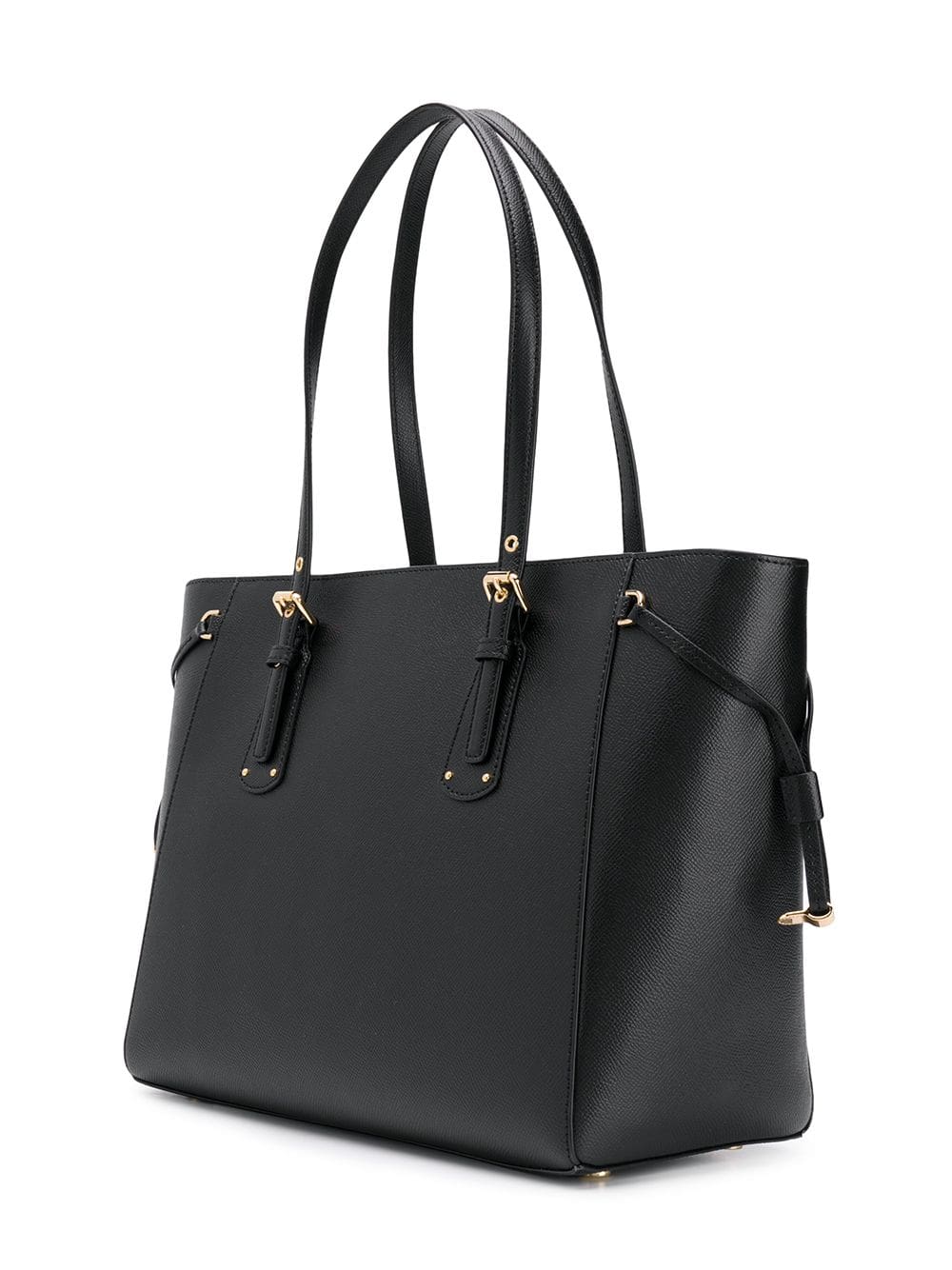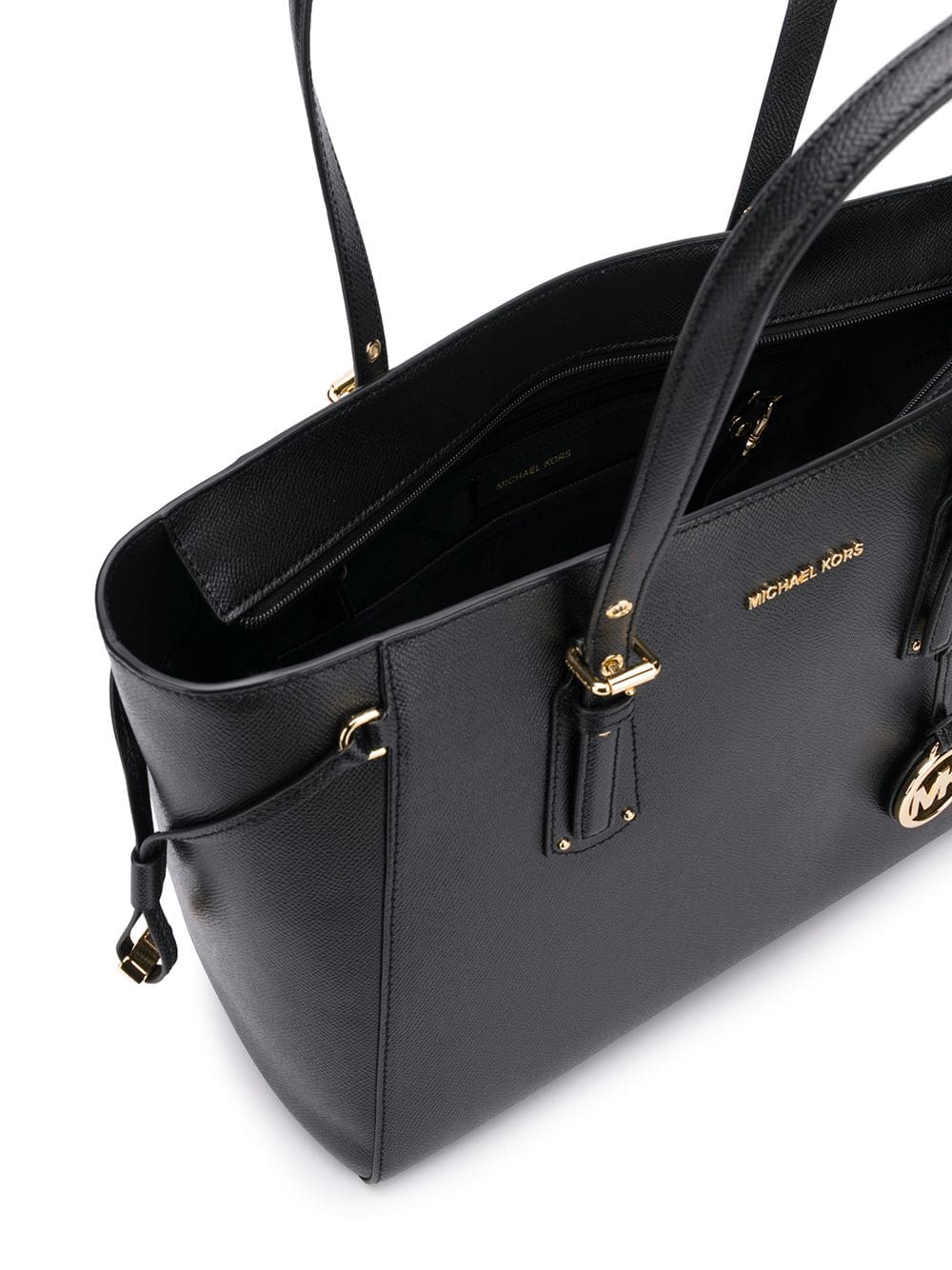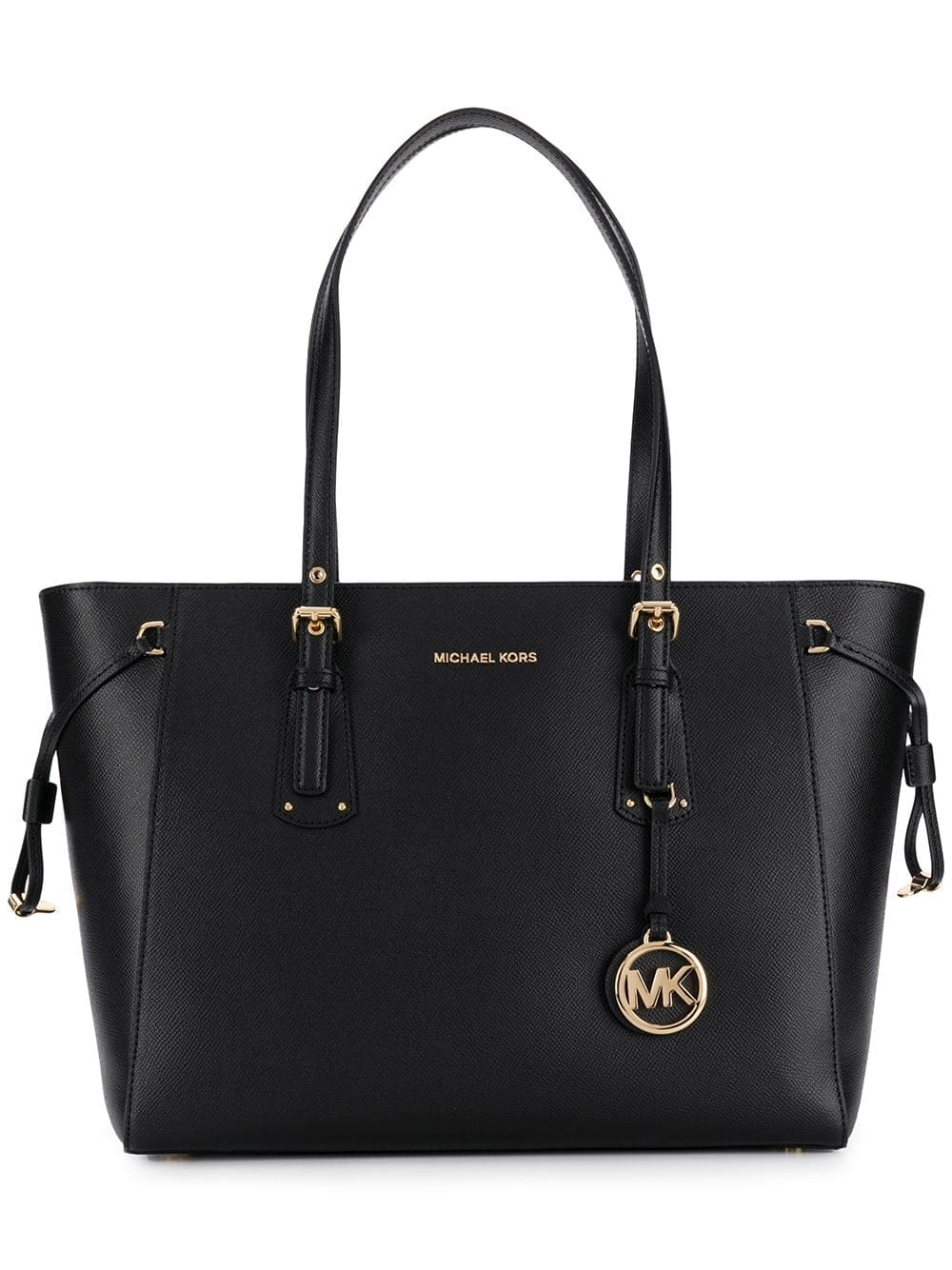 Combining elements of classic and contemporary design, Michael Michael Kors is the go-to label for clean-cut shapes and ultra-chic details. Case in point: this black leather Voyager tote. Equal parts polished and practical, the streamlined silhouette boasts a top zip fastening, a main internal compartment and multiple internal pockets for neat organization, plus delicate gold-tone hardware, a front logo plaque and a playful logo charm to finish. Swing it over your shoulder or slip it into the crook of your arm for an instant dose of polished style.