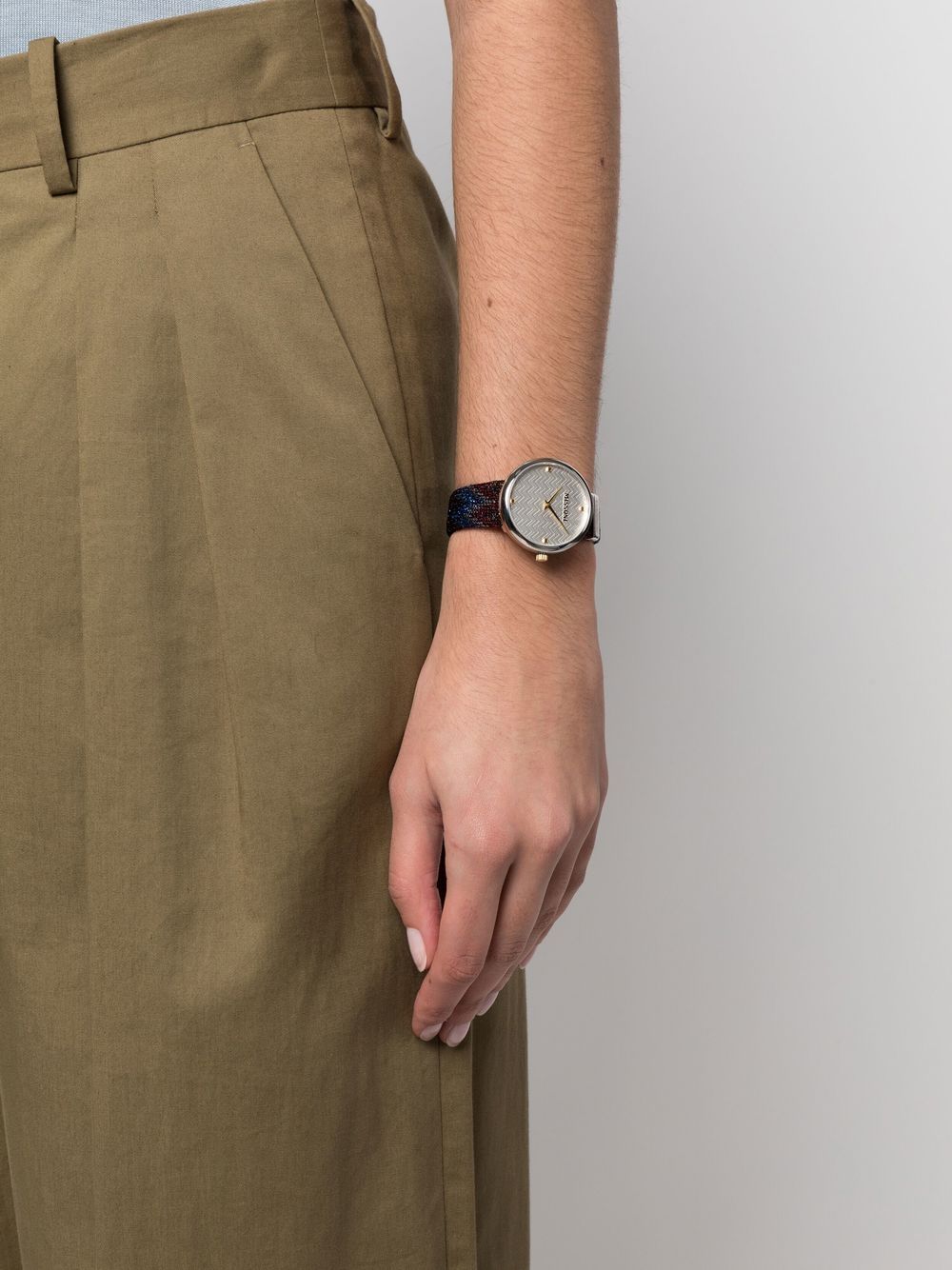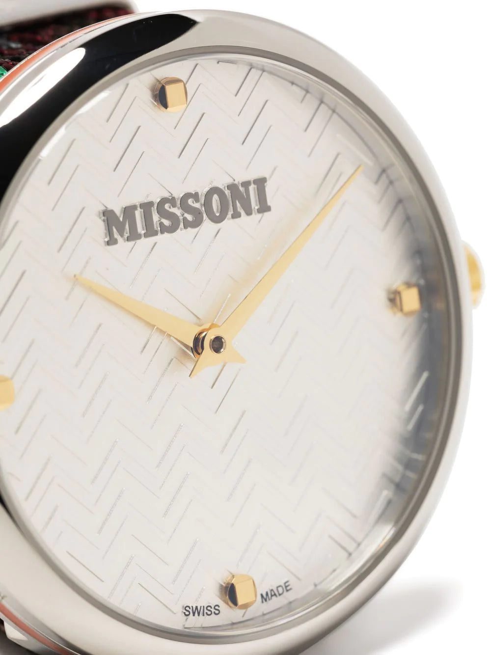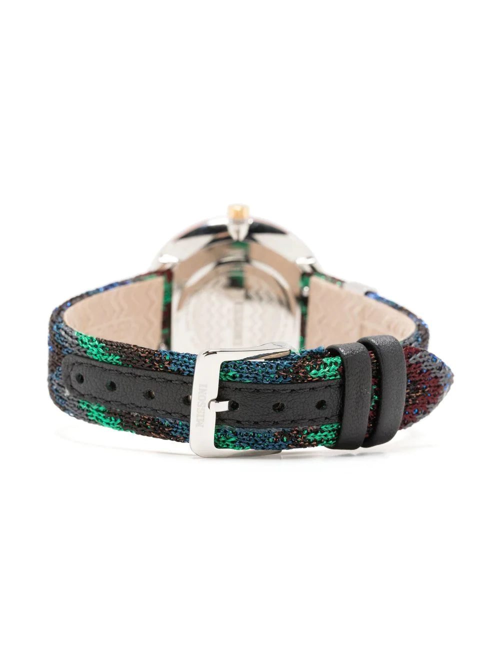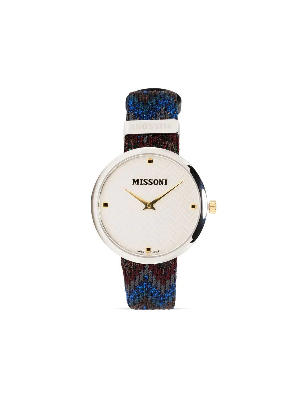 This M1 34mm timepiece expresses characteristics of Missoni's colourful knitwear DNA. Adorned with a multicoloured zigzag strap in the brand's signature woven fabric, the recognisable chevron pattern is embossed at the dial emphasising its branded appeal.