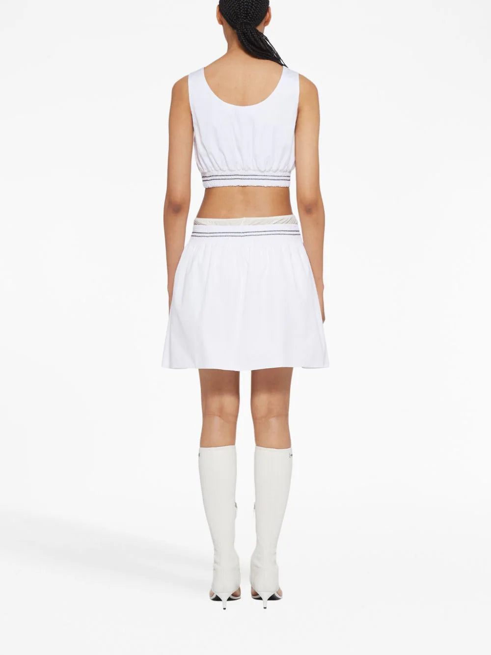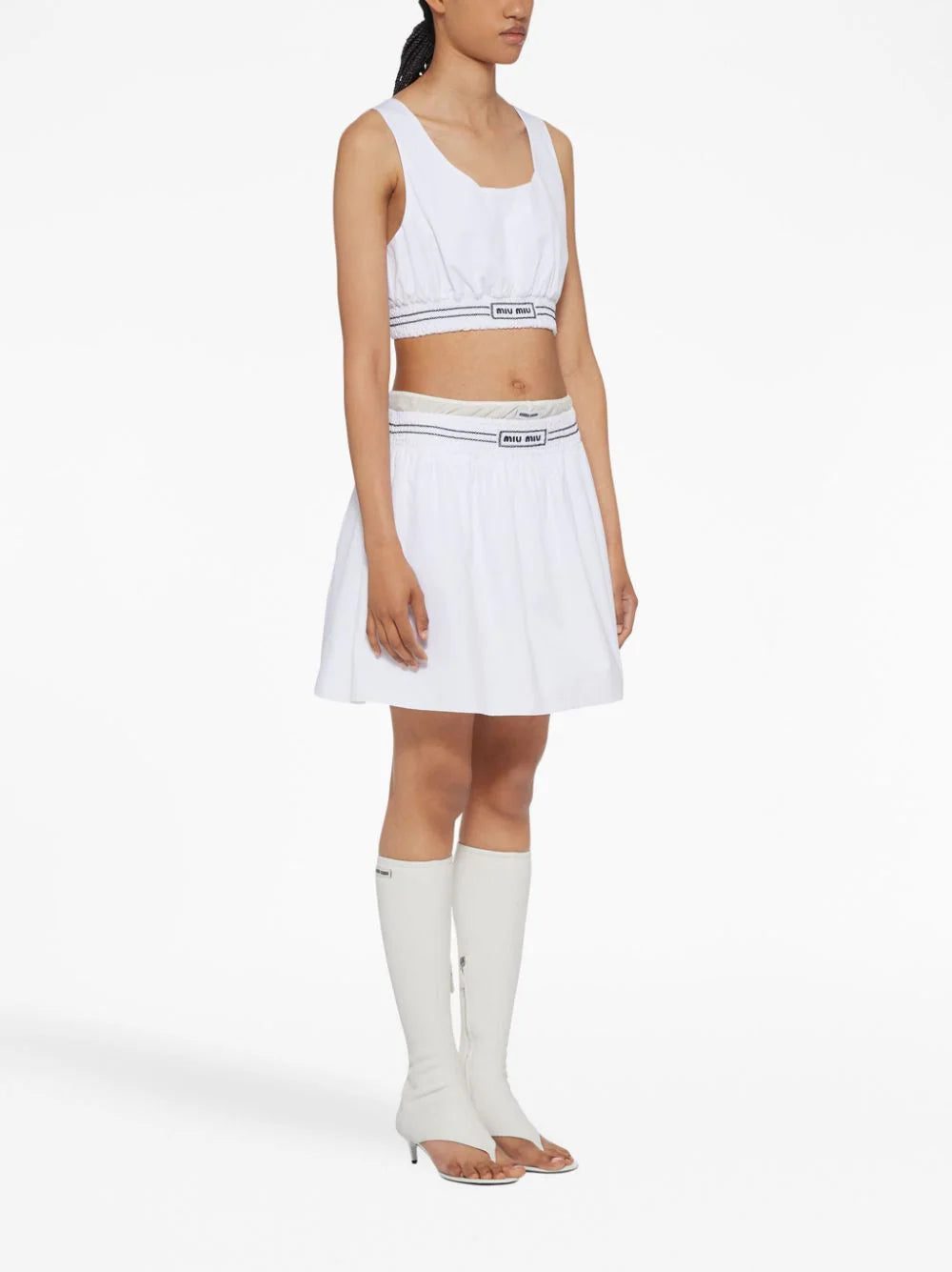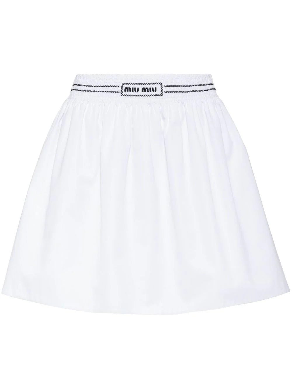MIU MIU injects this miniskirt with a sportwear aesthetic. Crafted from soft cotton, the white-hued garment is accented with contrasting geometric lines that frame the embroidered logo at the waistband.