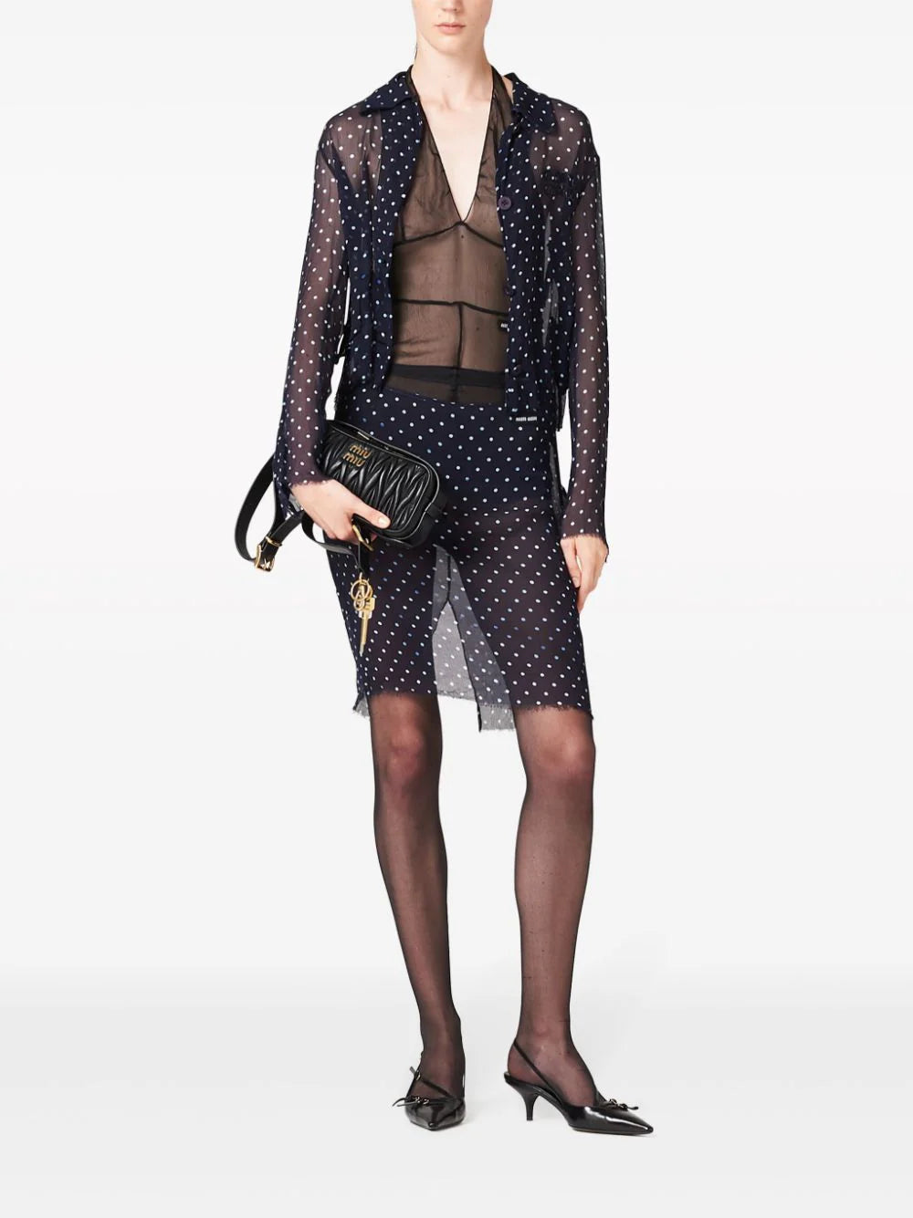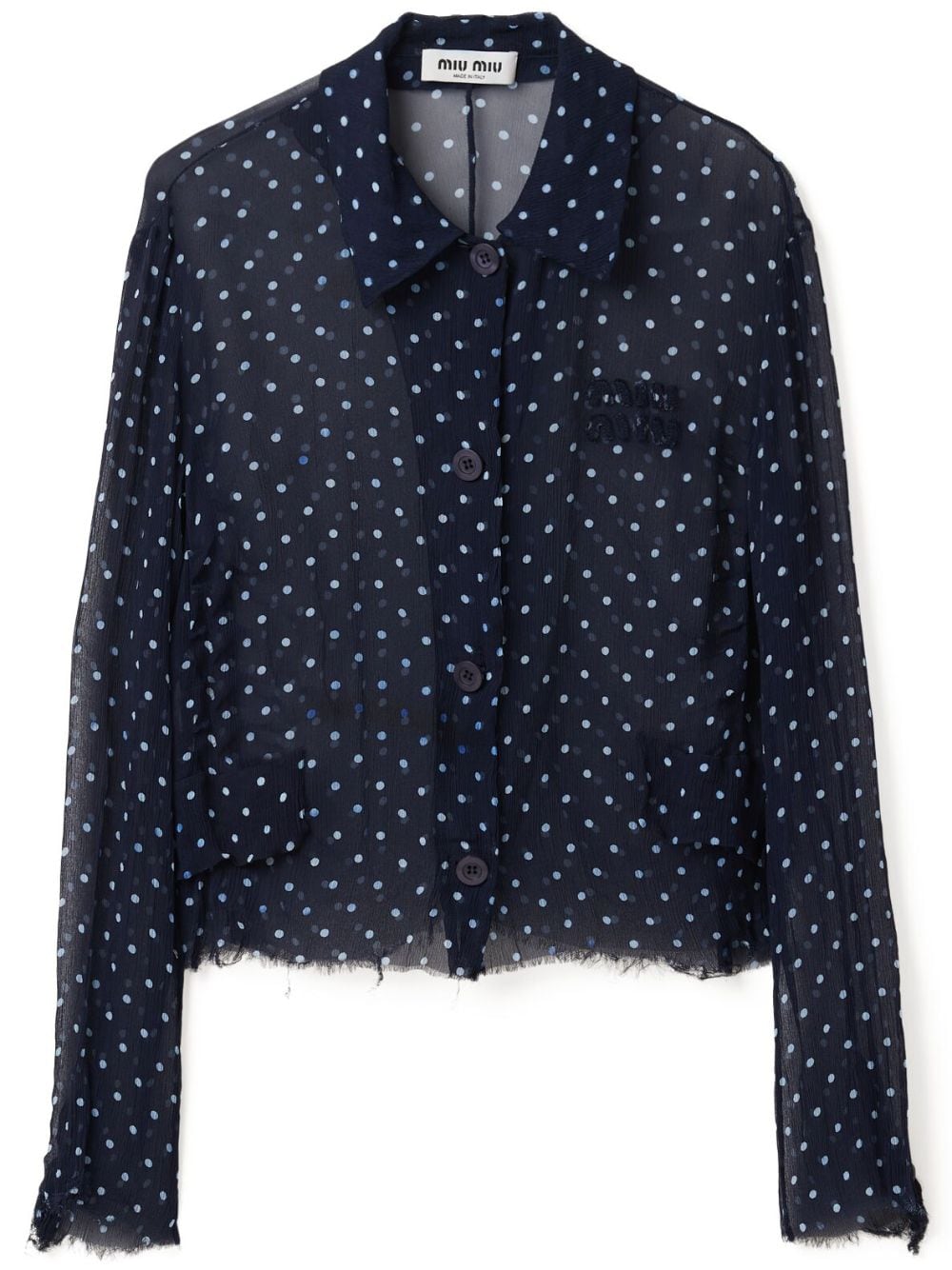 An irreverent undercurrent defines Miu Miu's designs, and this navy-blue blouse is a case in point. It's cut from semi-sheer silk chiffon, decorated with a playful polka dot pattern and bordered by frayed trims.