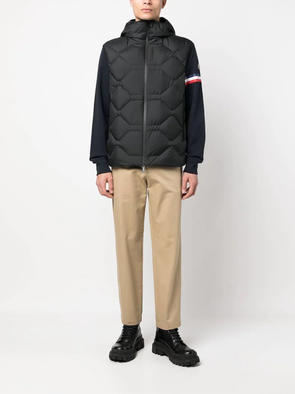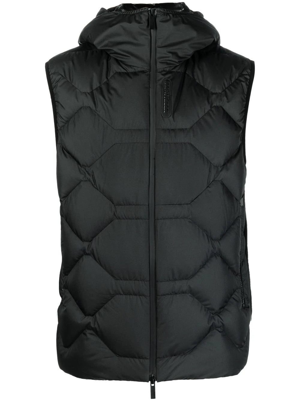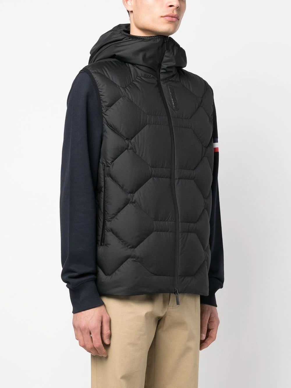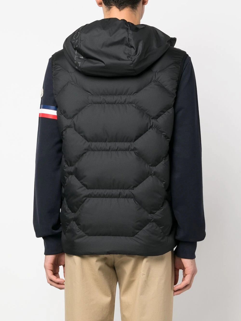 Atik quilted vest from MONCLER featuring black, down-feather filling, quilted finish, logo patch to the front, high neck, sleeveless, straight hem and two side zip-fastening pockets.